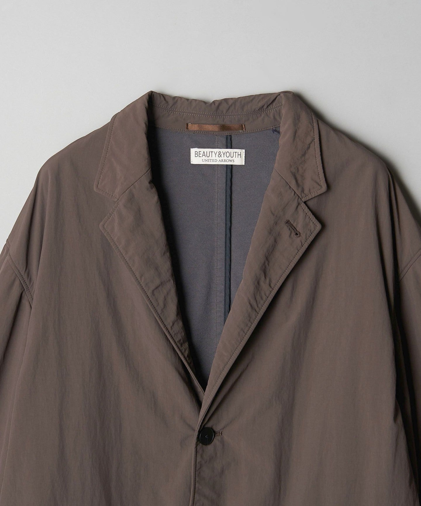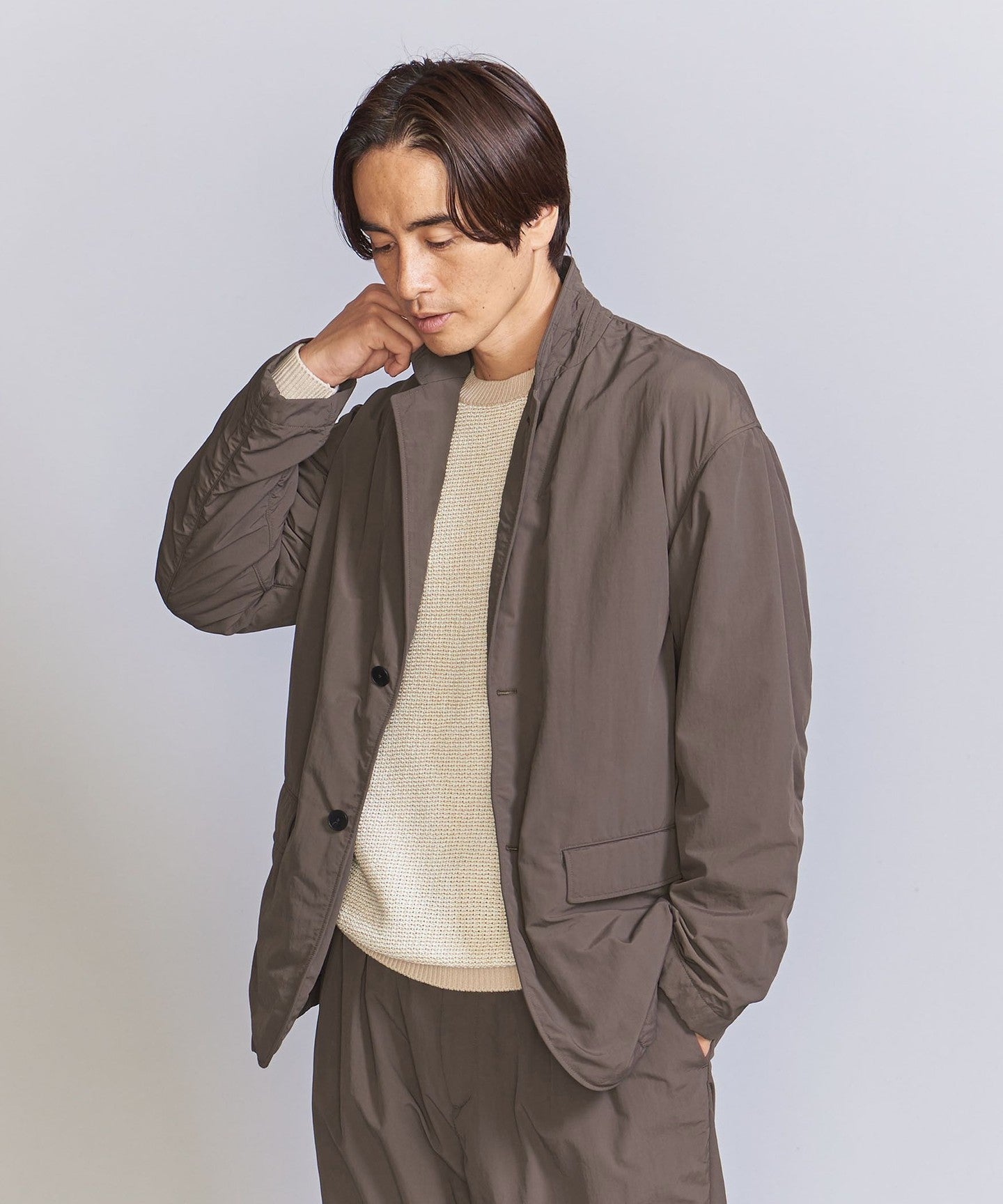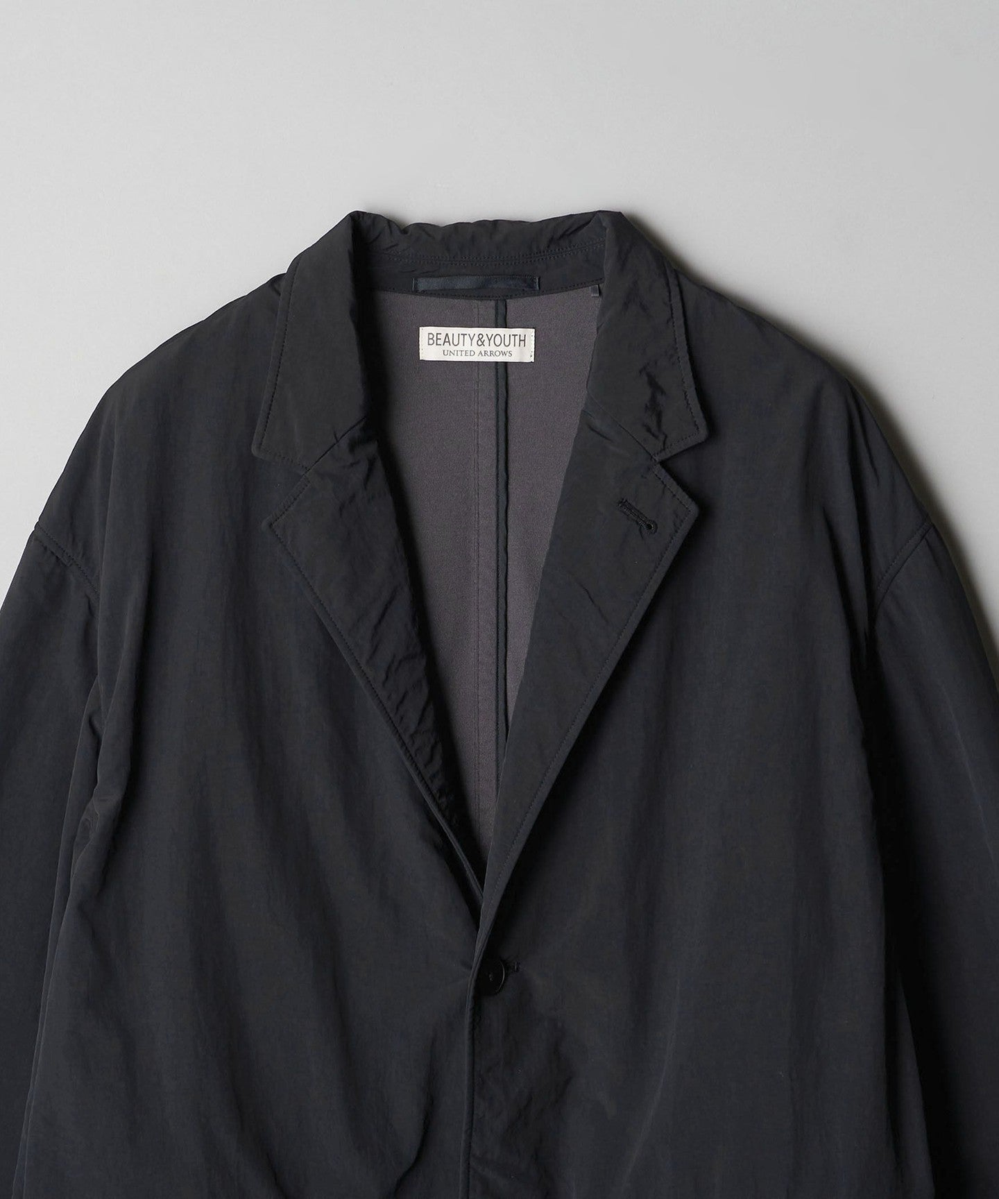 A simple two-button design with a unique puckering (crease) that catches the eye.JACKET .