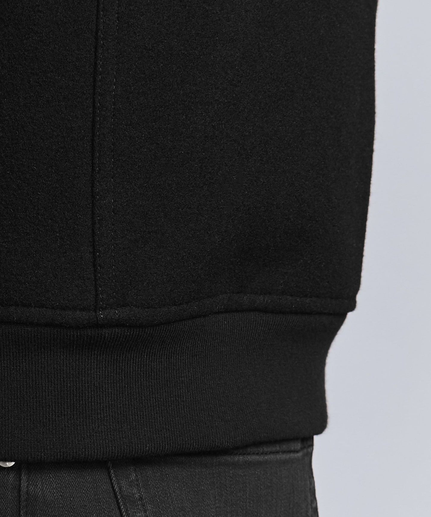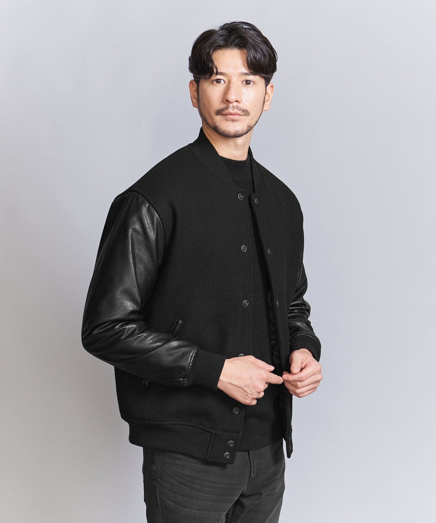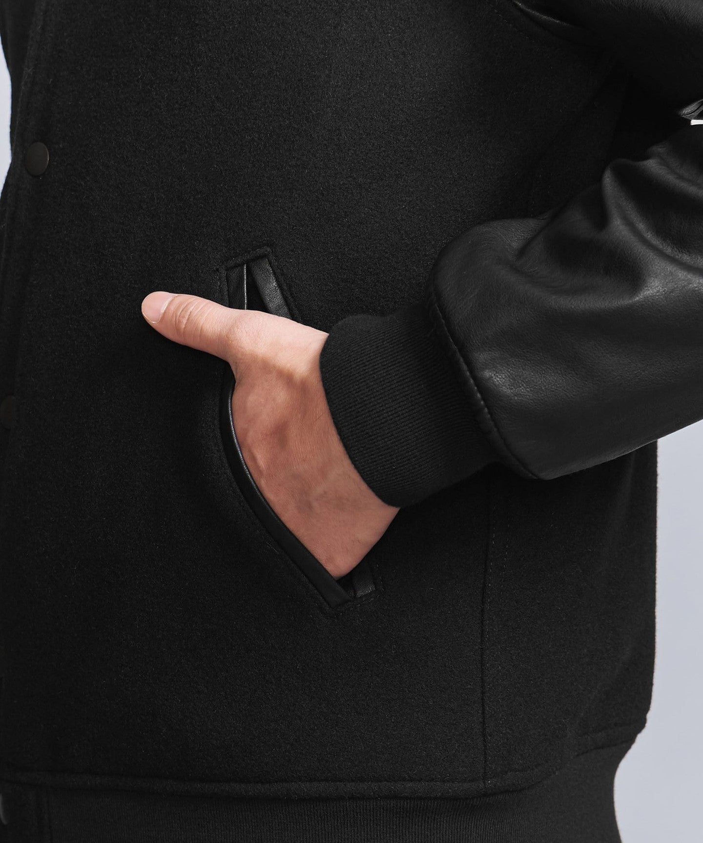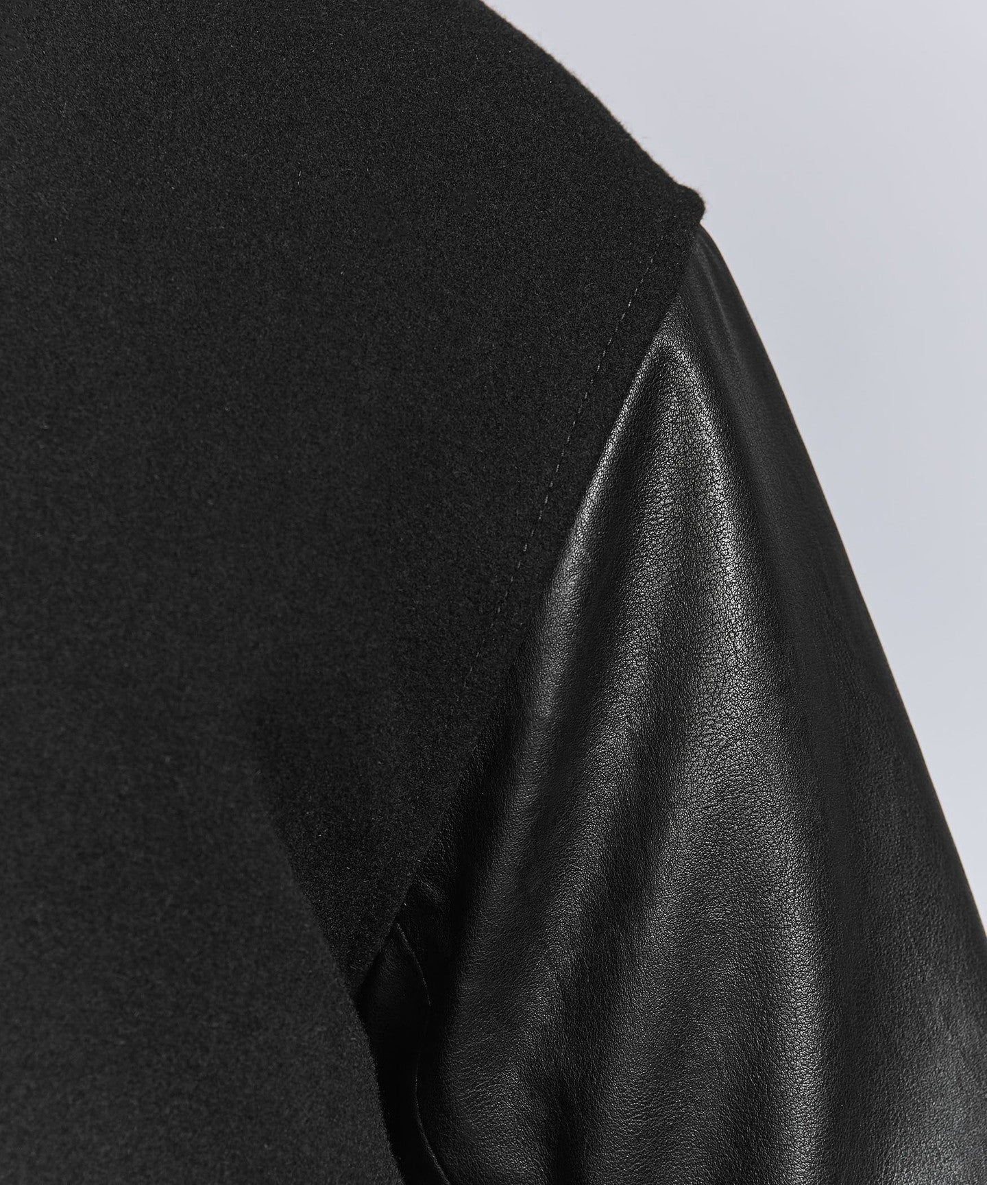 The body is made of Melton and the sleeves are made of synthetic leather.