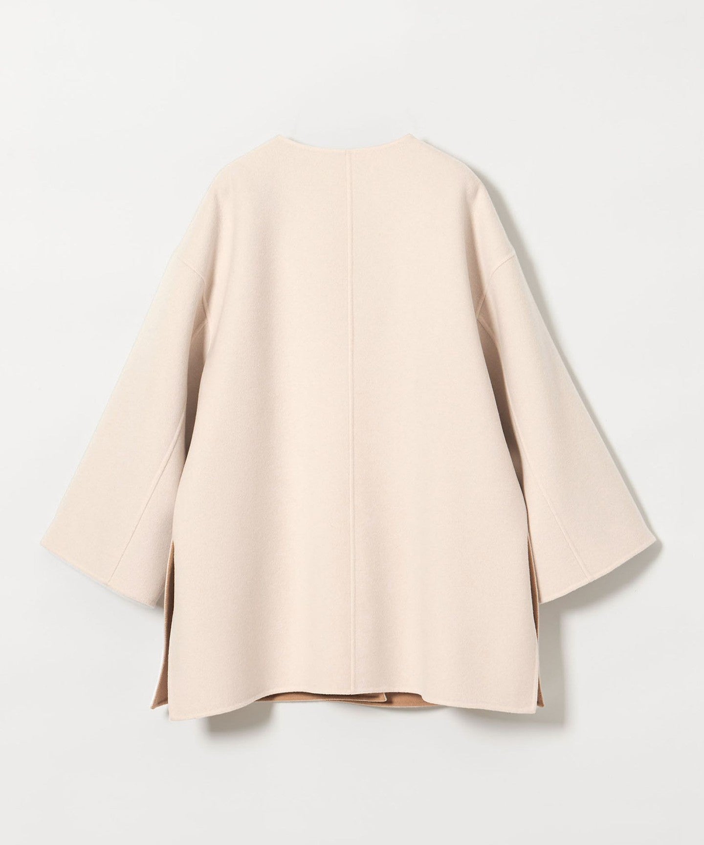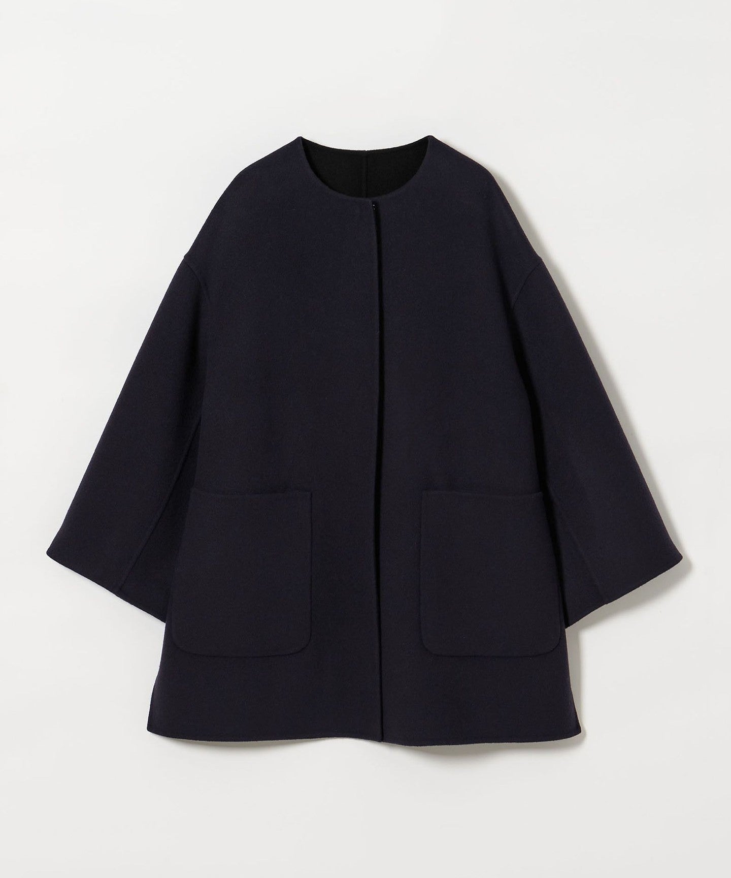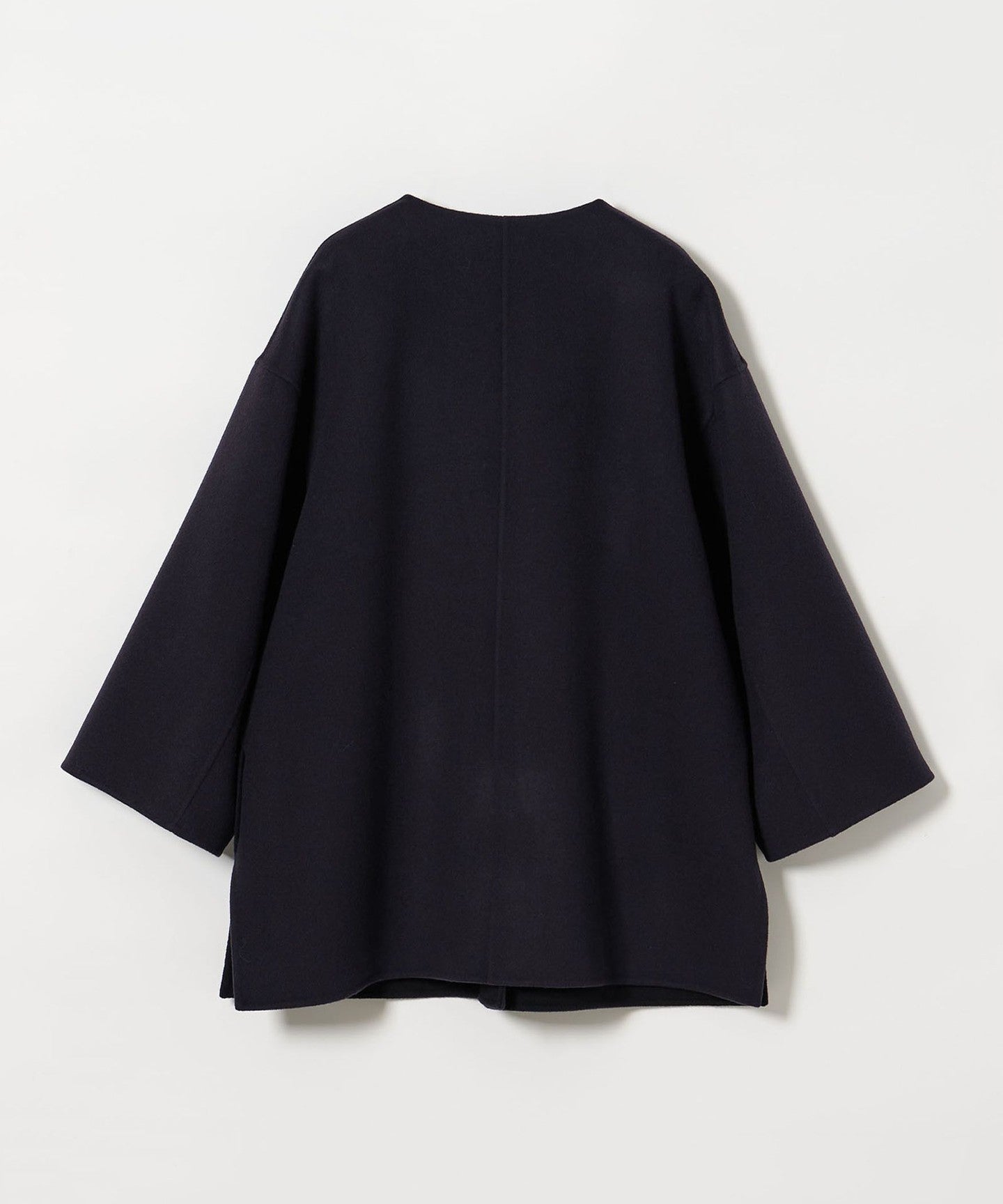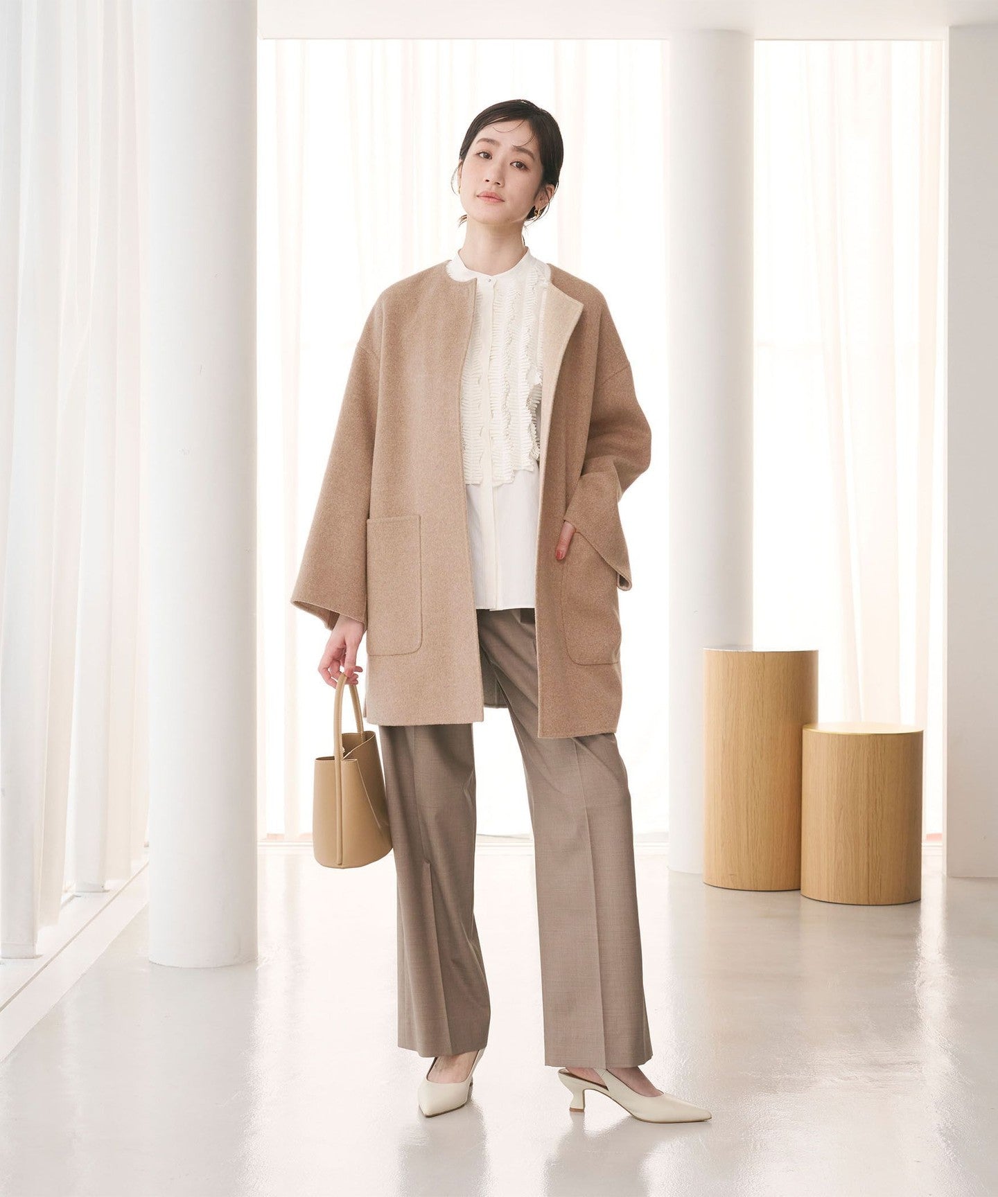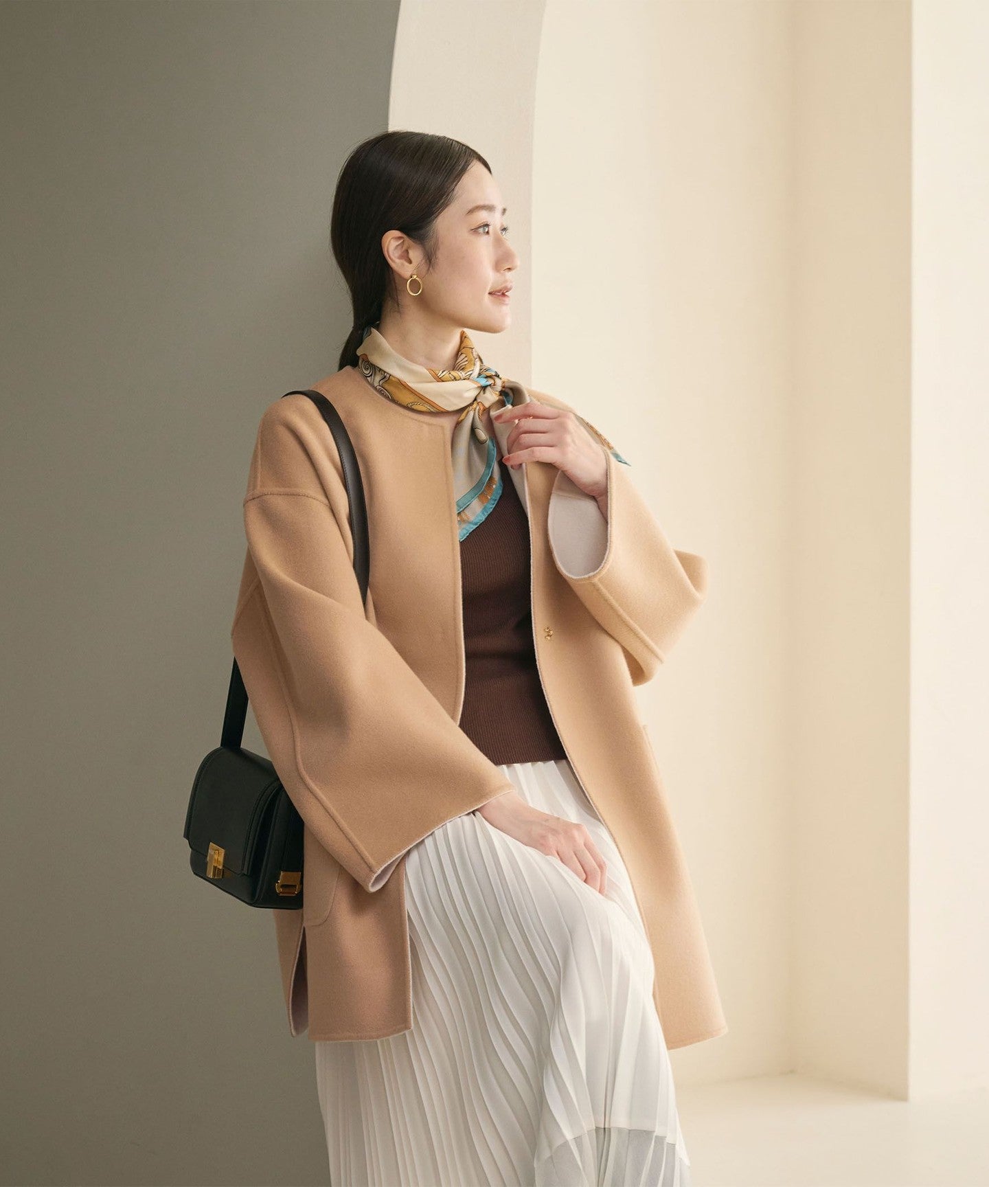This collarless coat is as light as a scarf and has an attractive mid-length that makes it easy to wear early in the season.