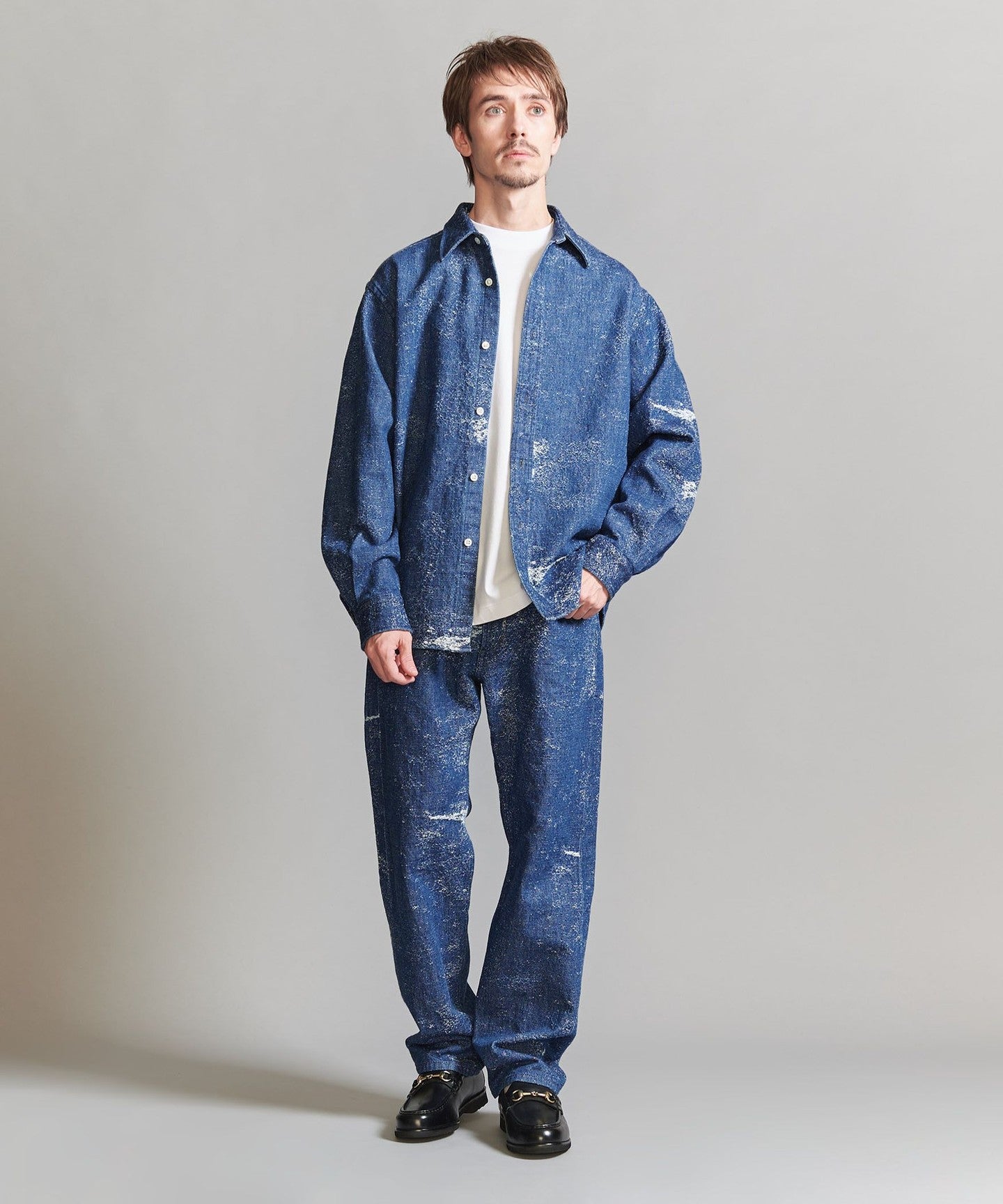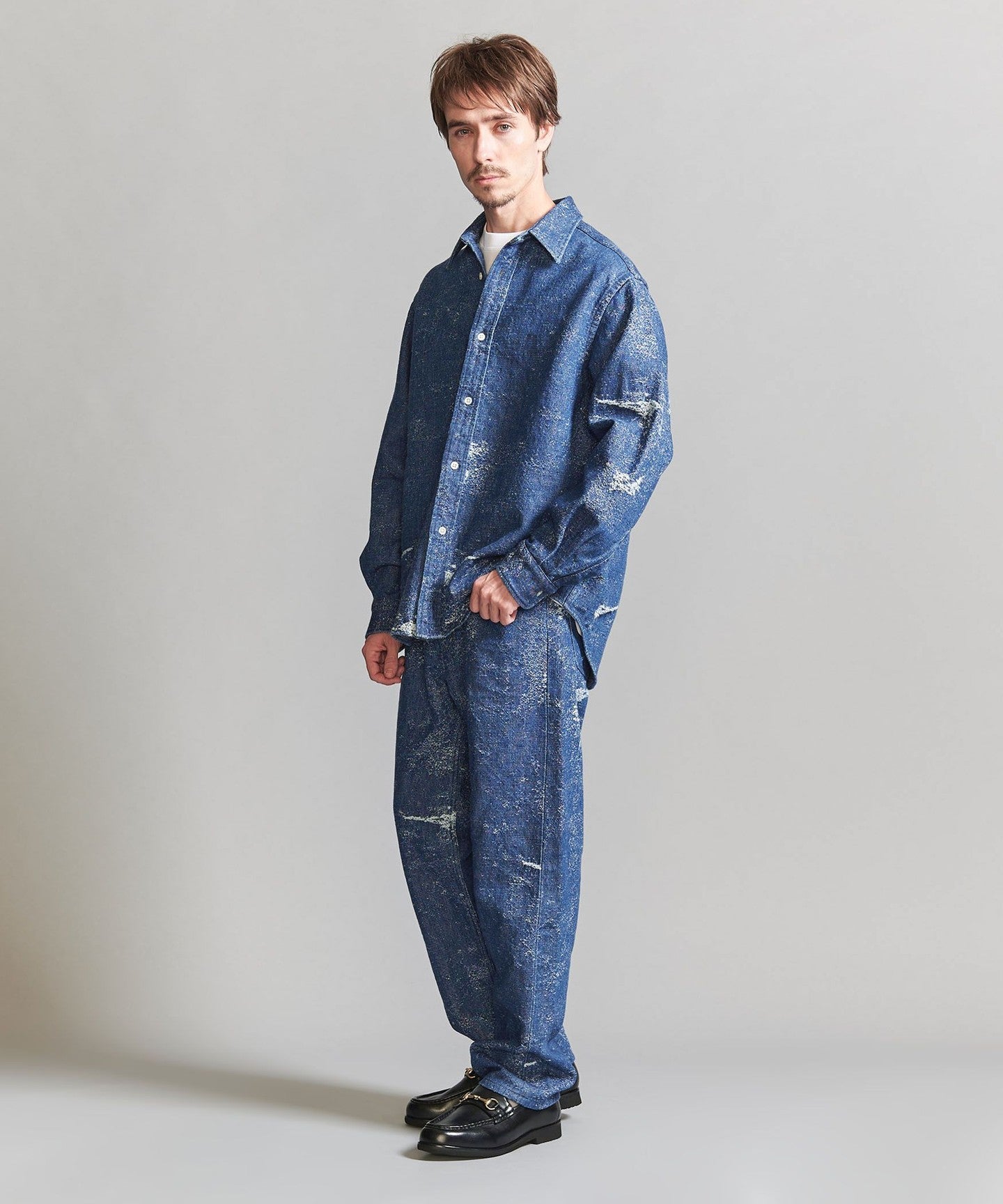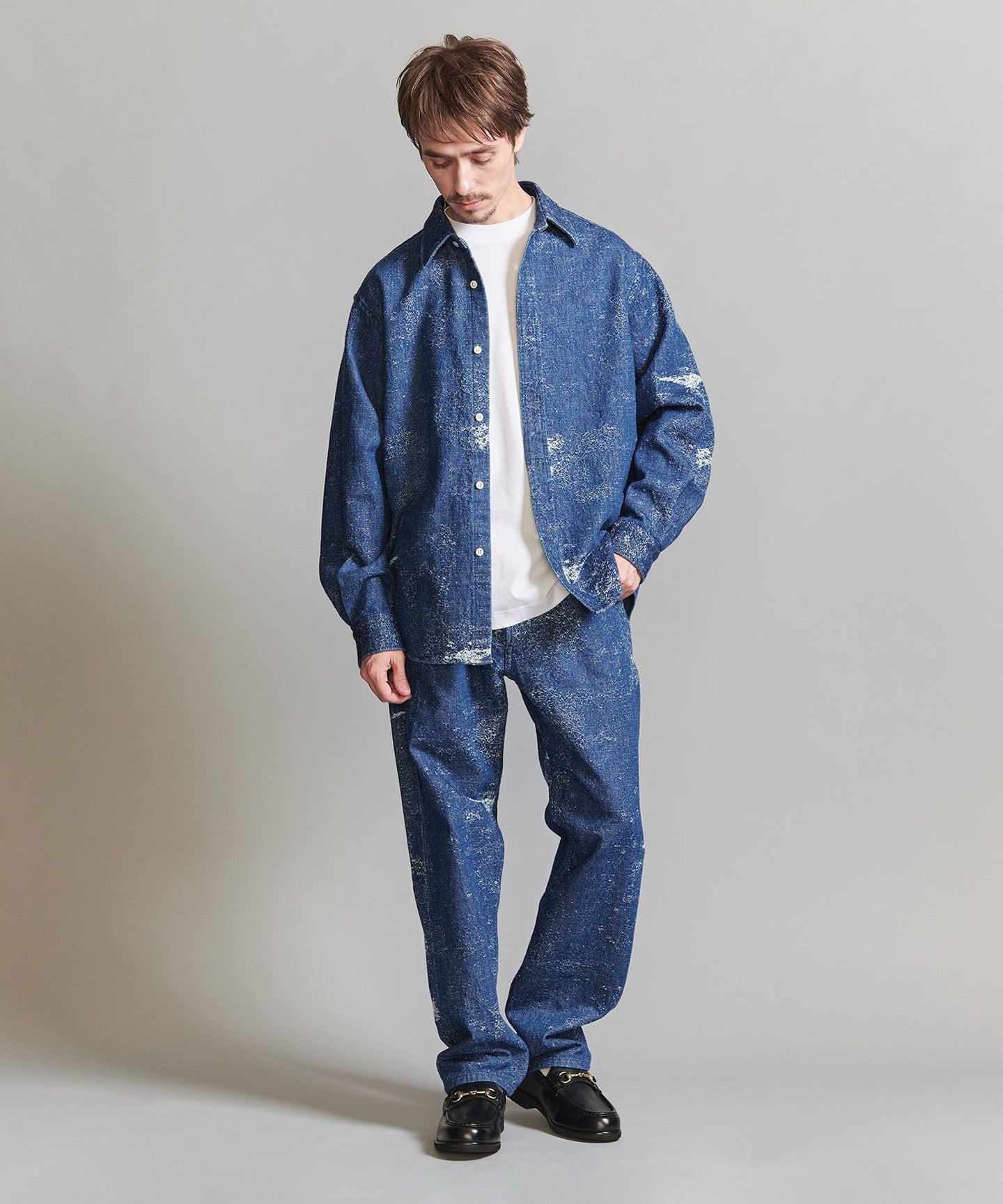 This denim shirt has a strong impact, so we recommend pairing it with plain, clean wool slacks.