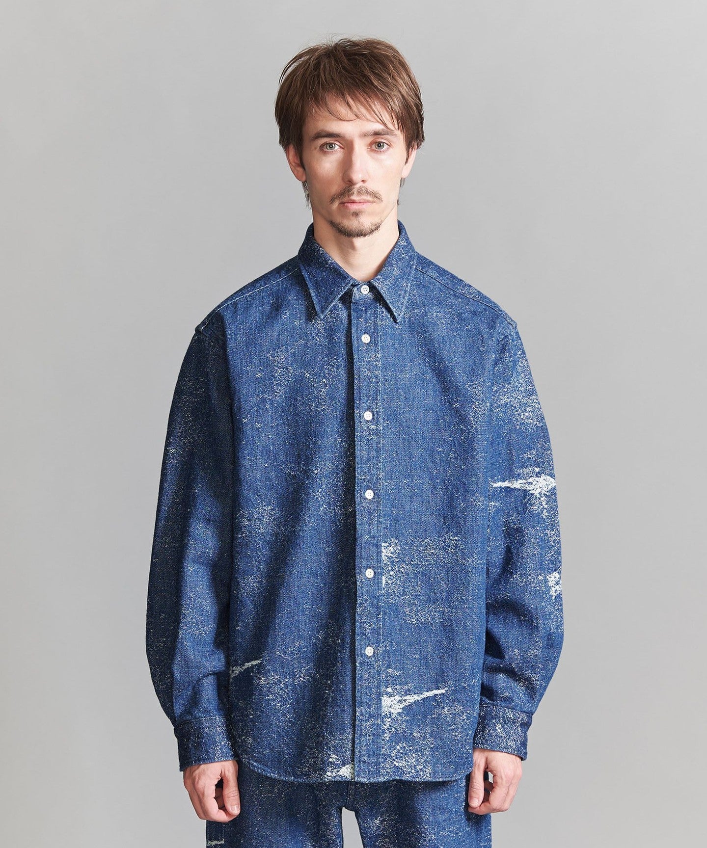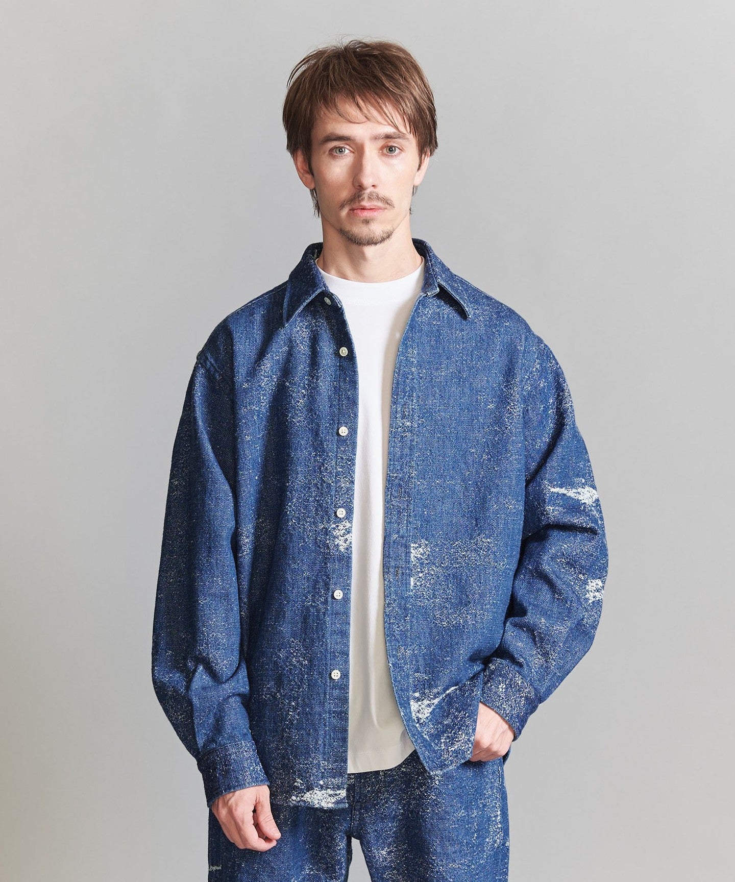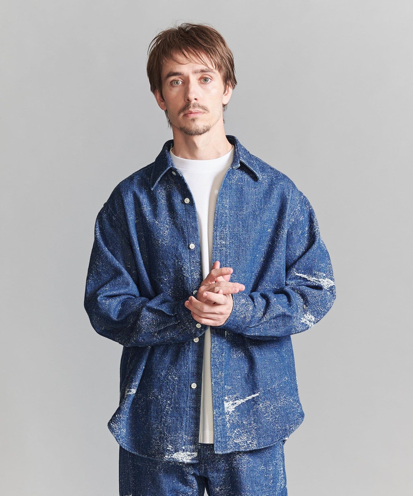 This denim shirt has a strong impact, so we recommend pairing it with plain, clean wool slacks.