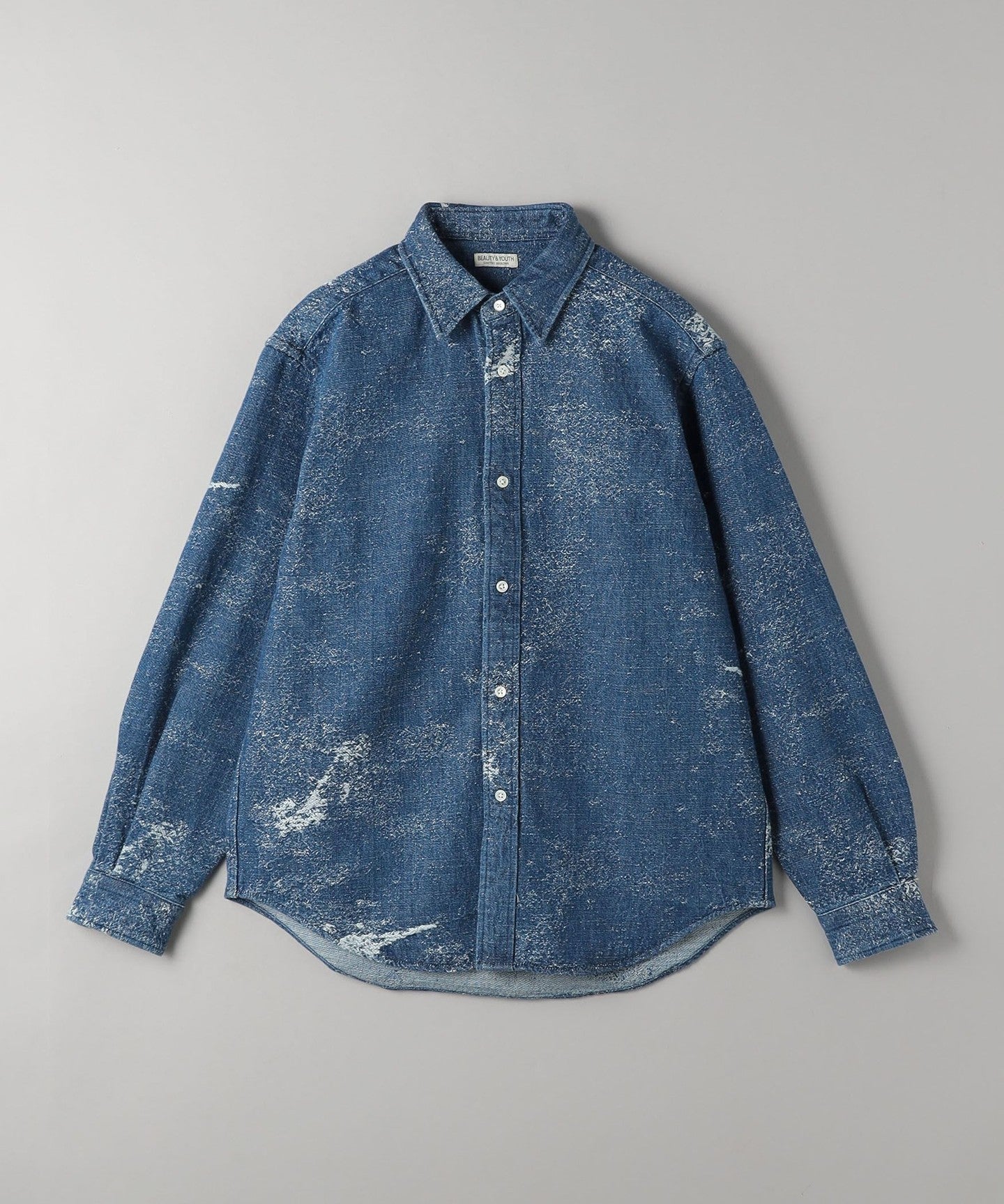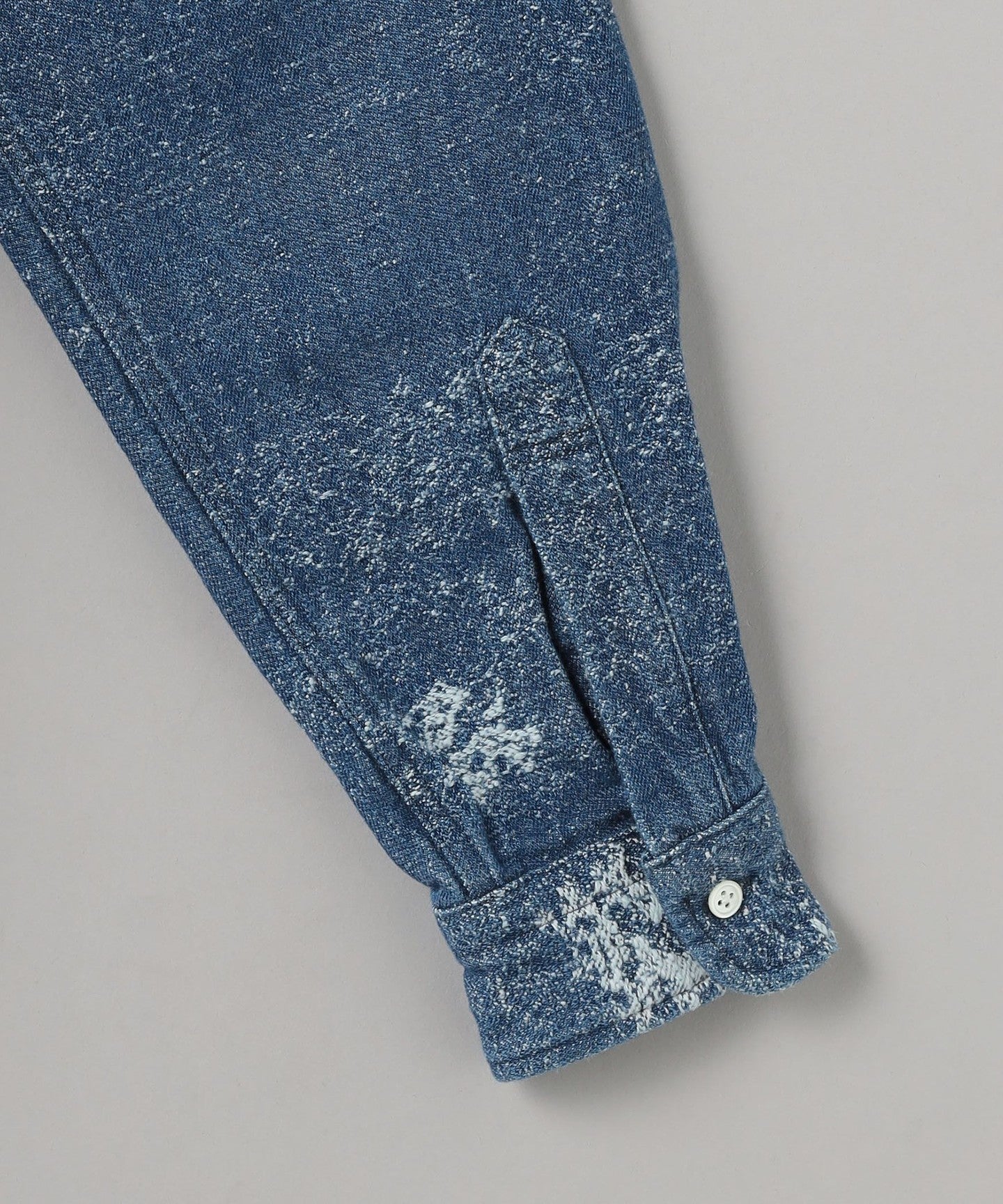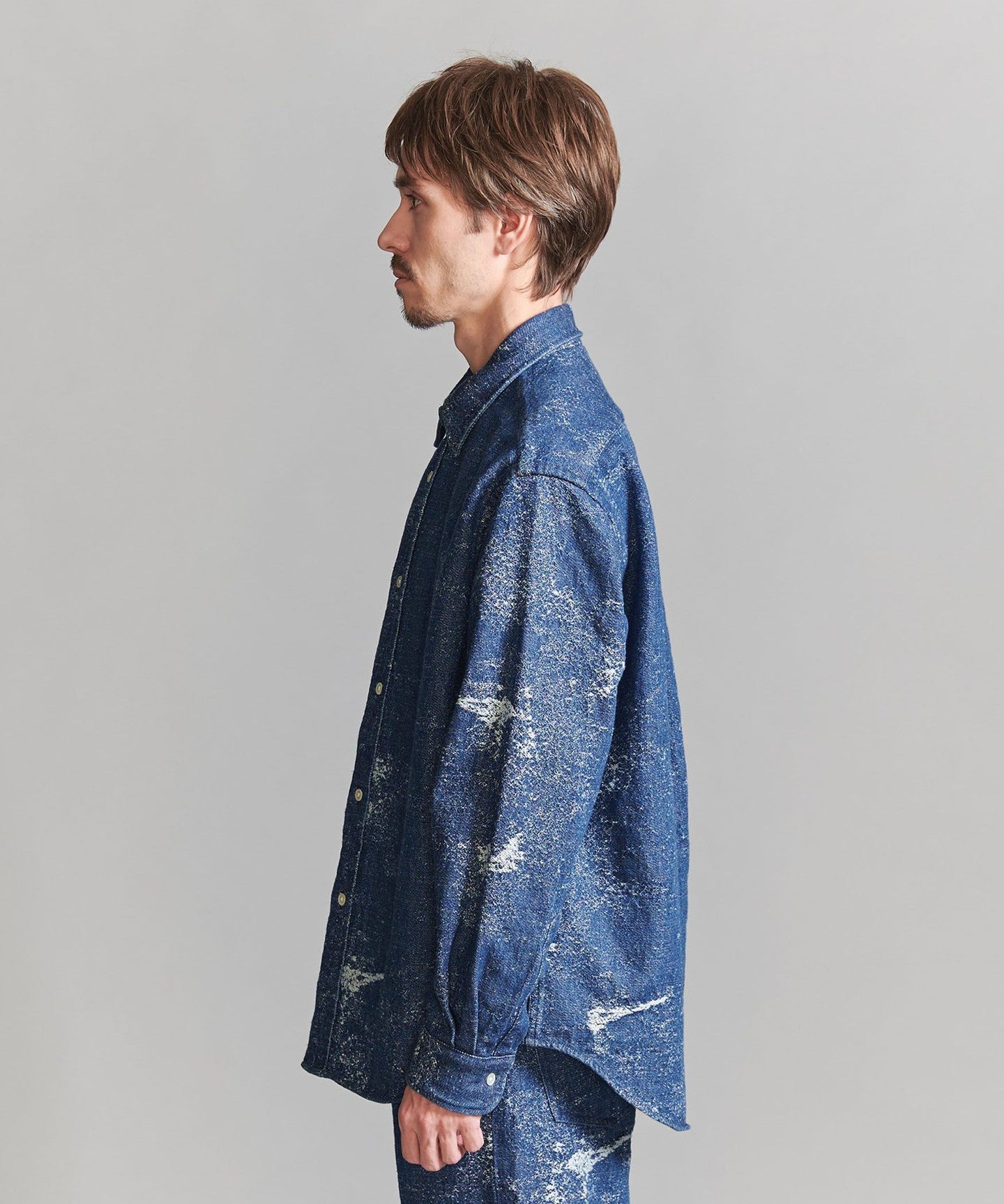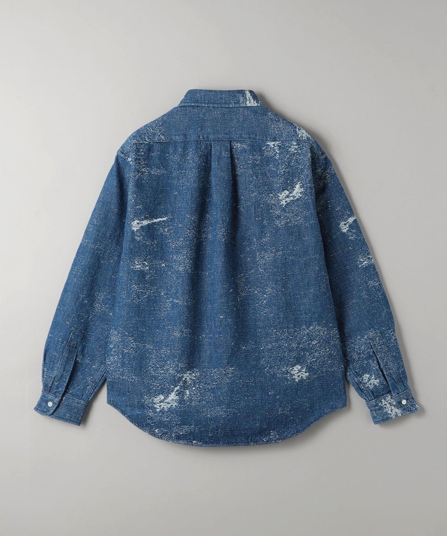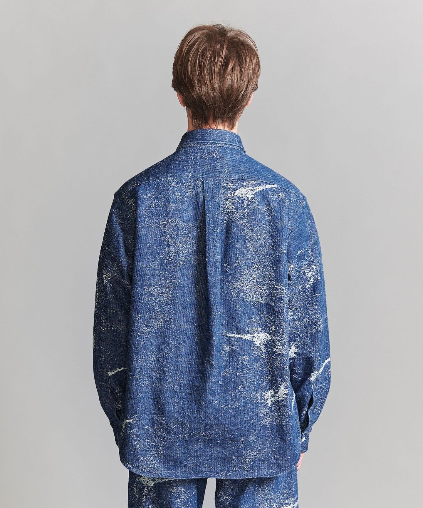 This completely original jacquard denim shirt features a distressed-look woven pattern designed from scratch and made with specially ordered fabric.