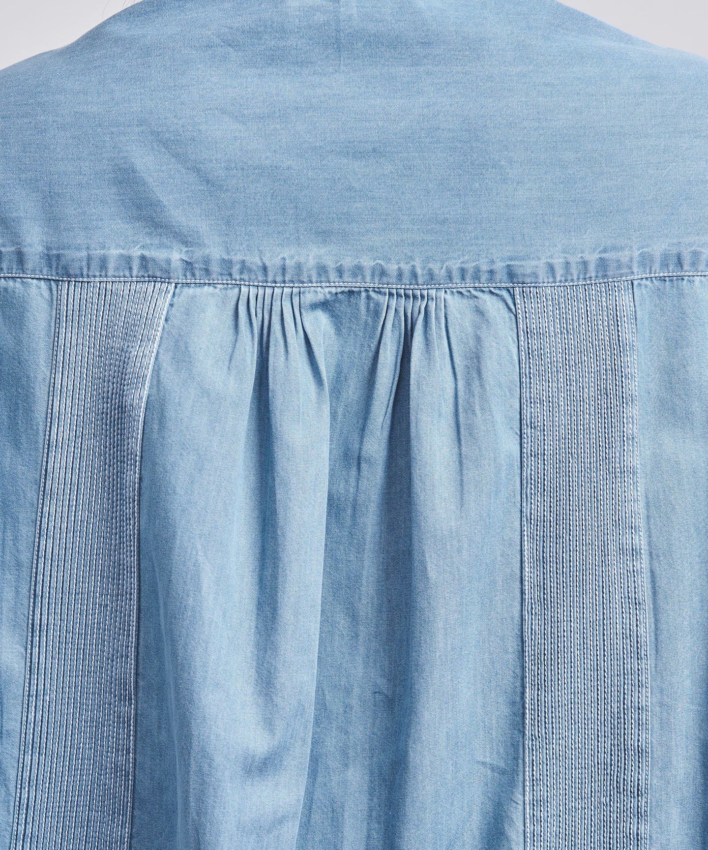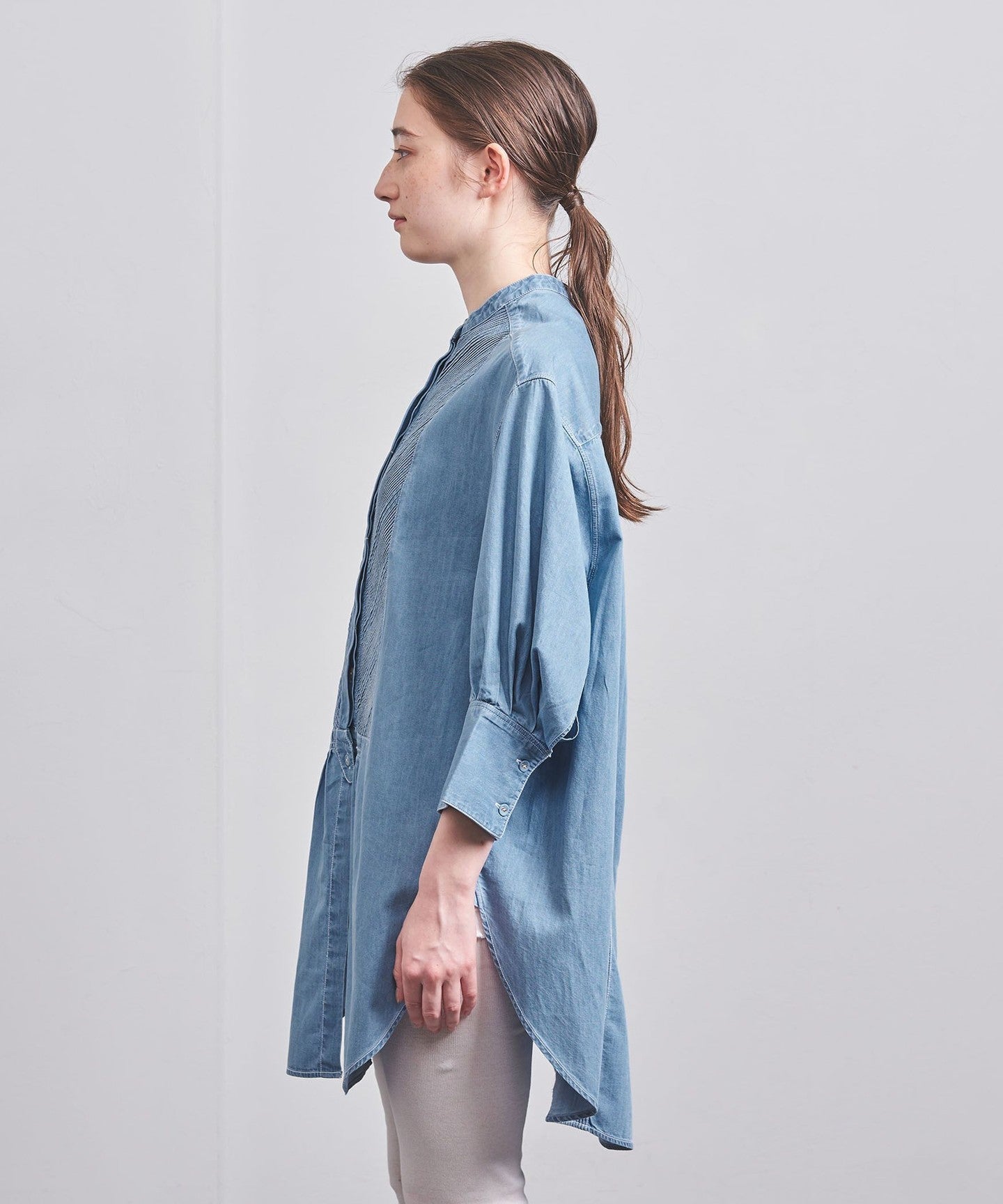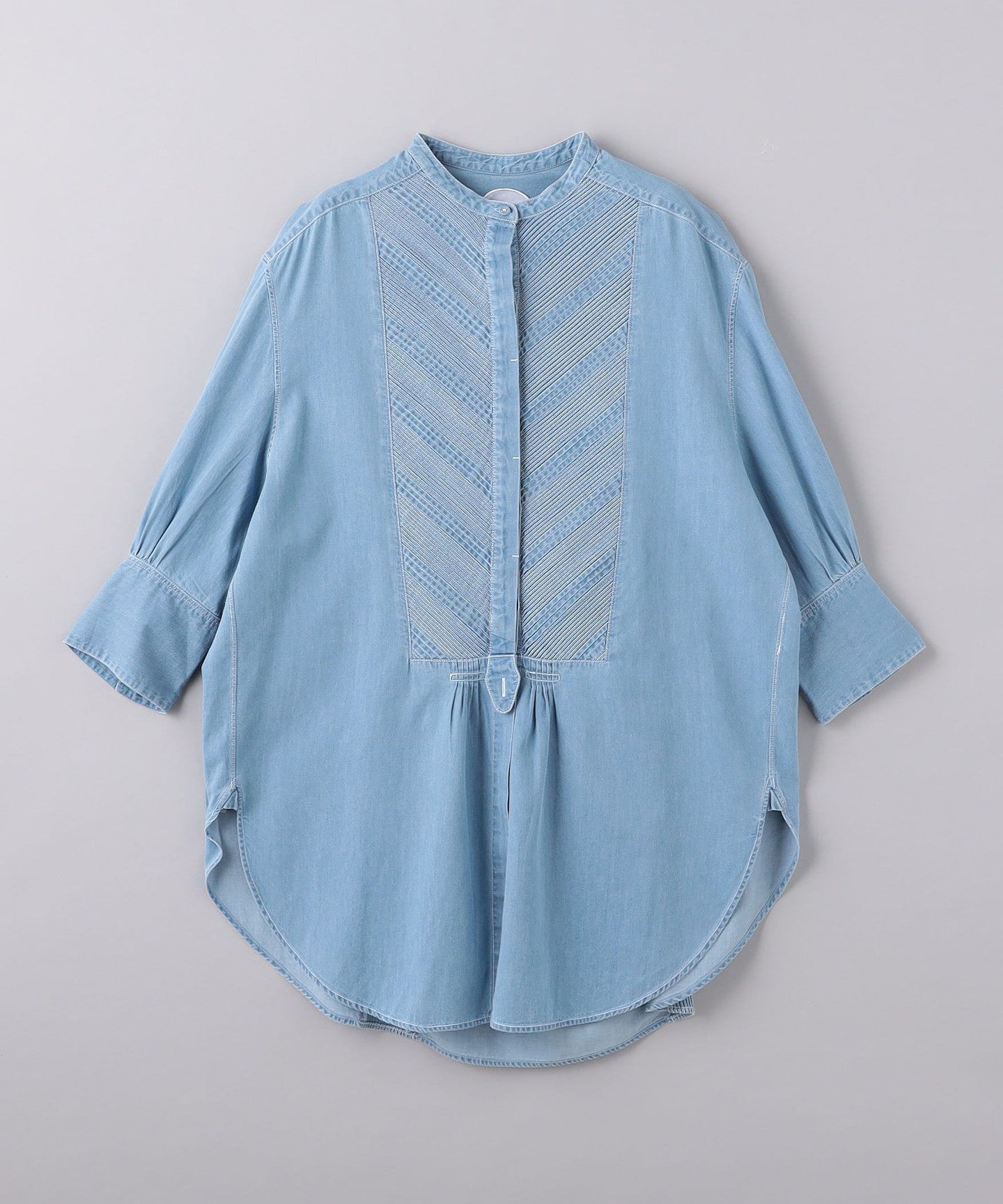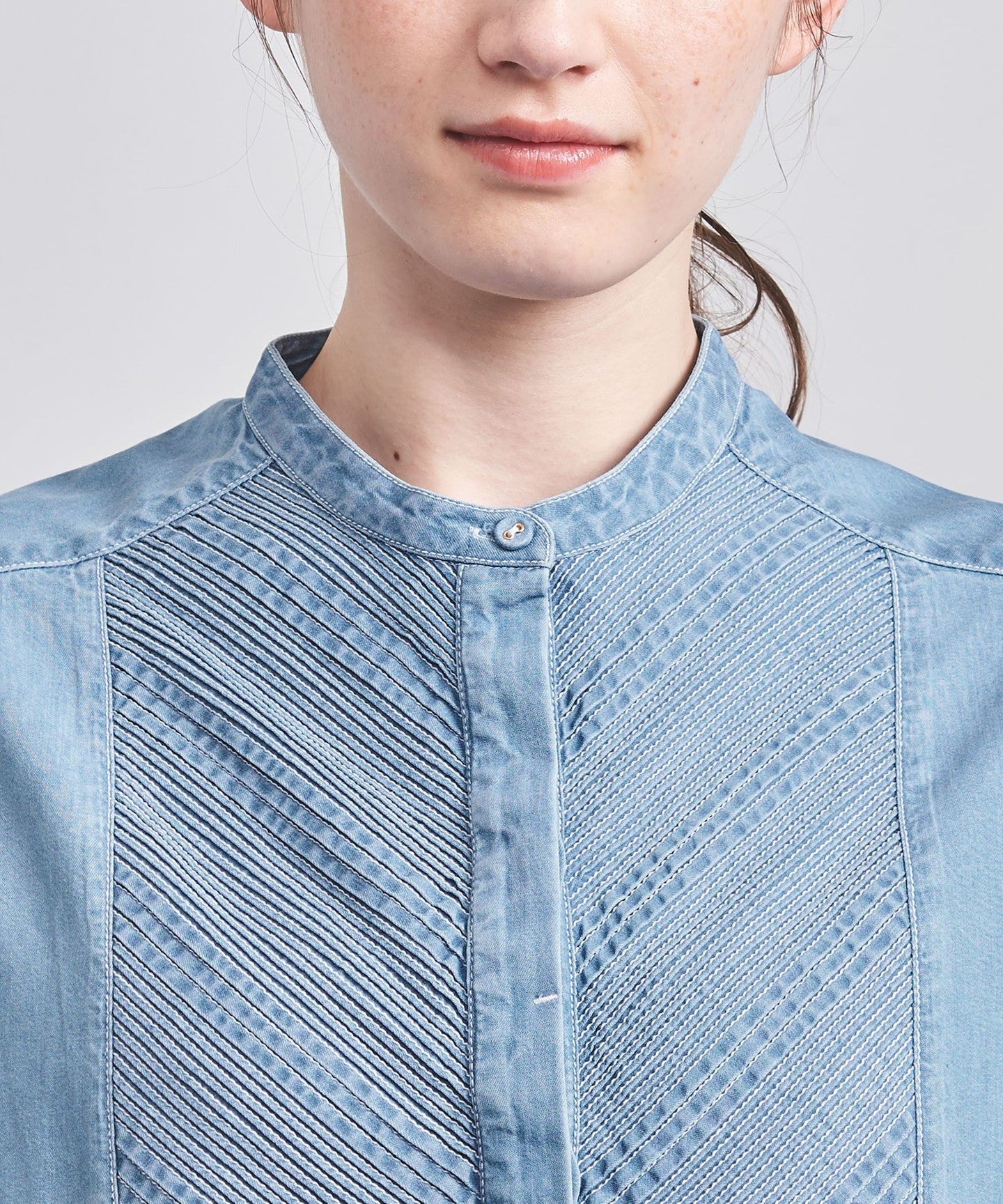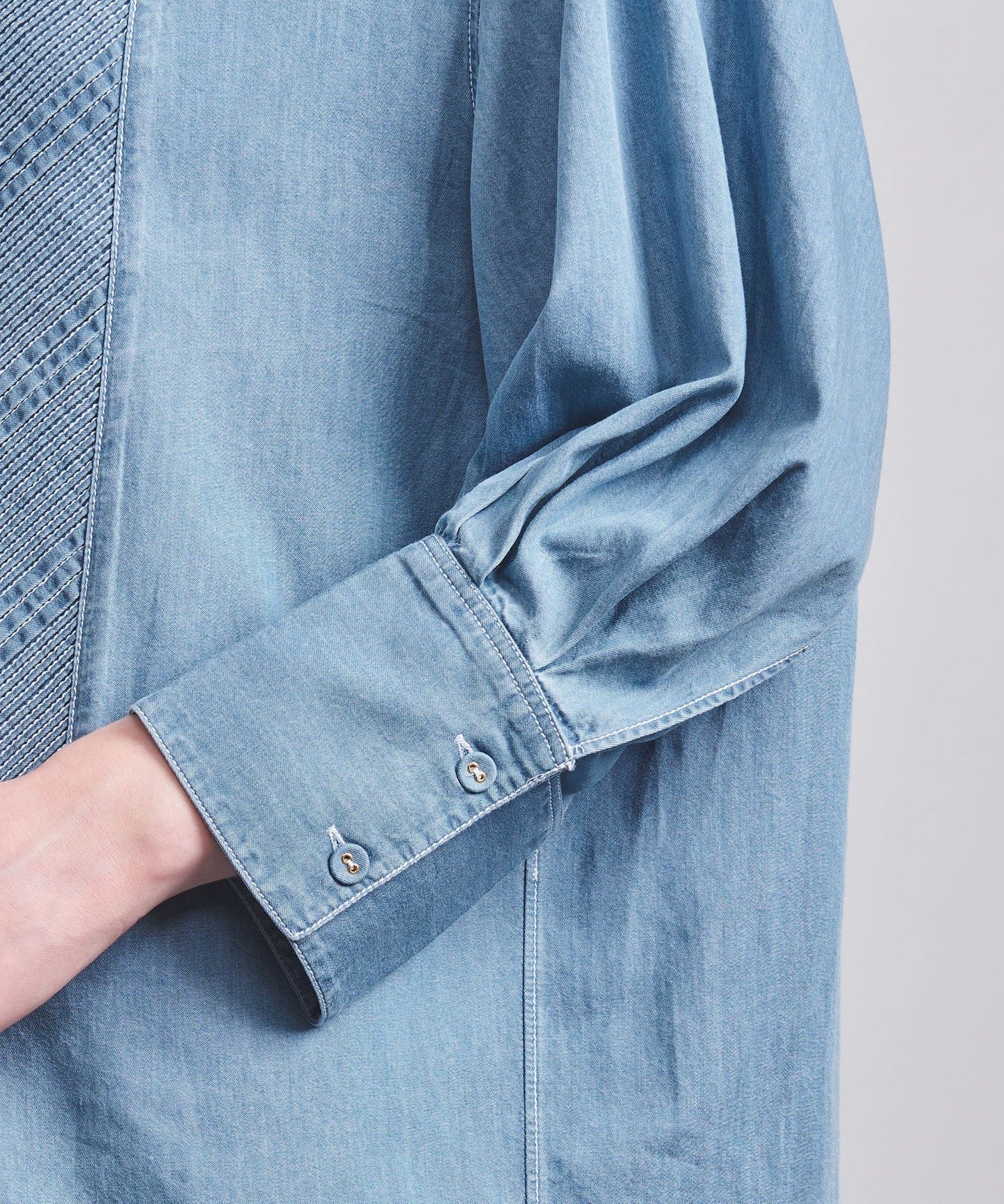 "Trinity" is a series that incorporates men's formal bustle shirts with contrasting fabrics around the chest into women's everyday wear.