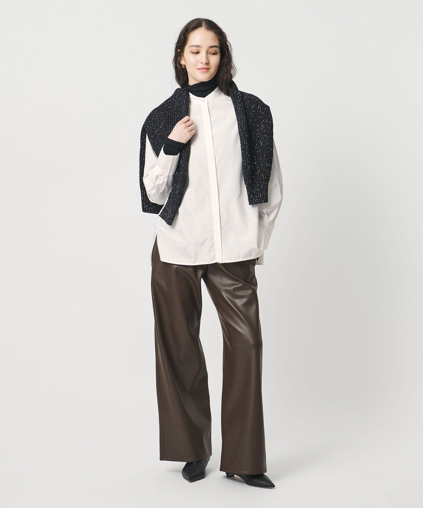 レザーライクなスカートとも好相性です。