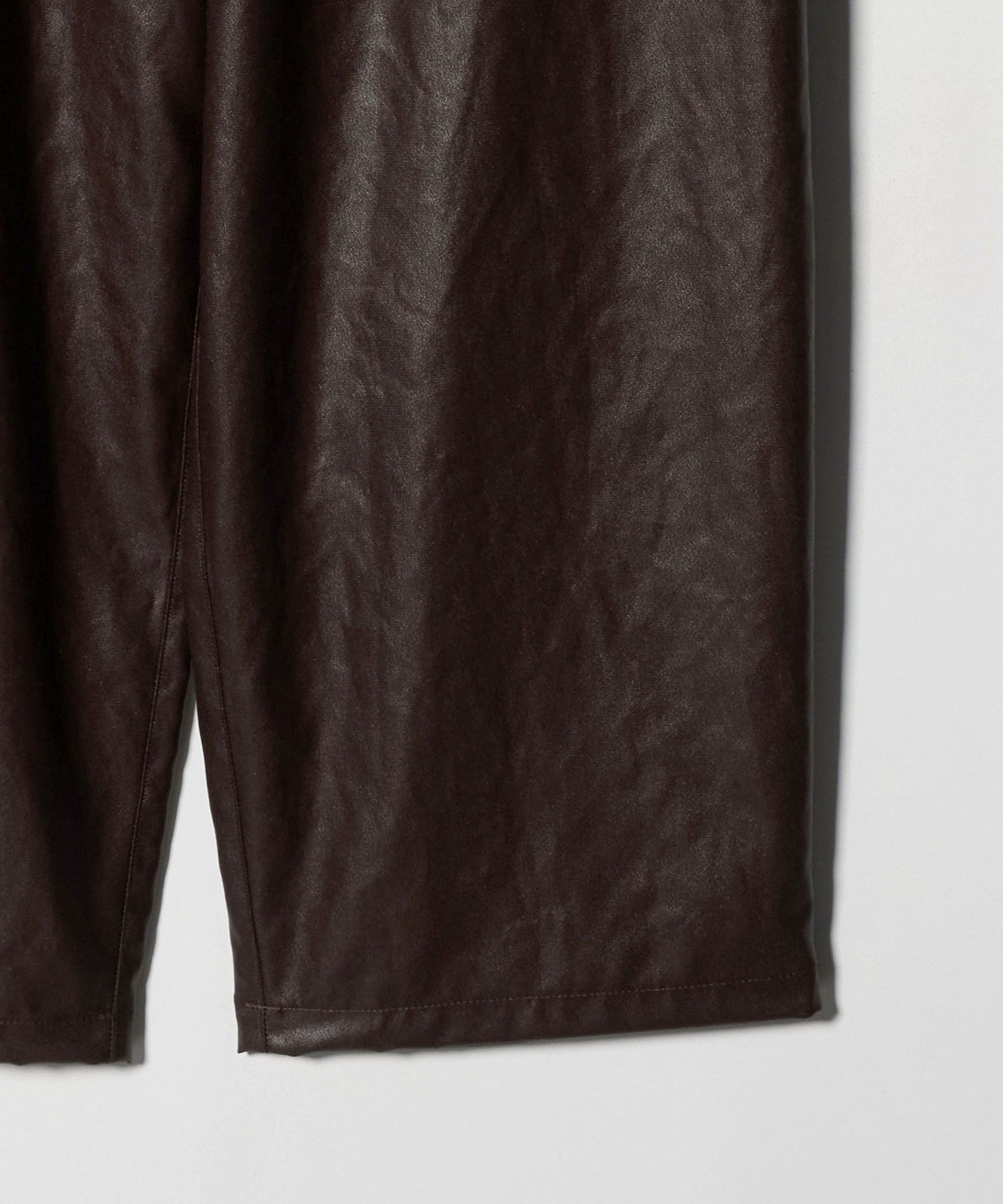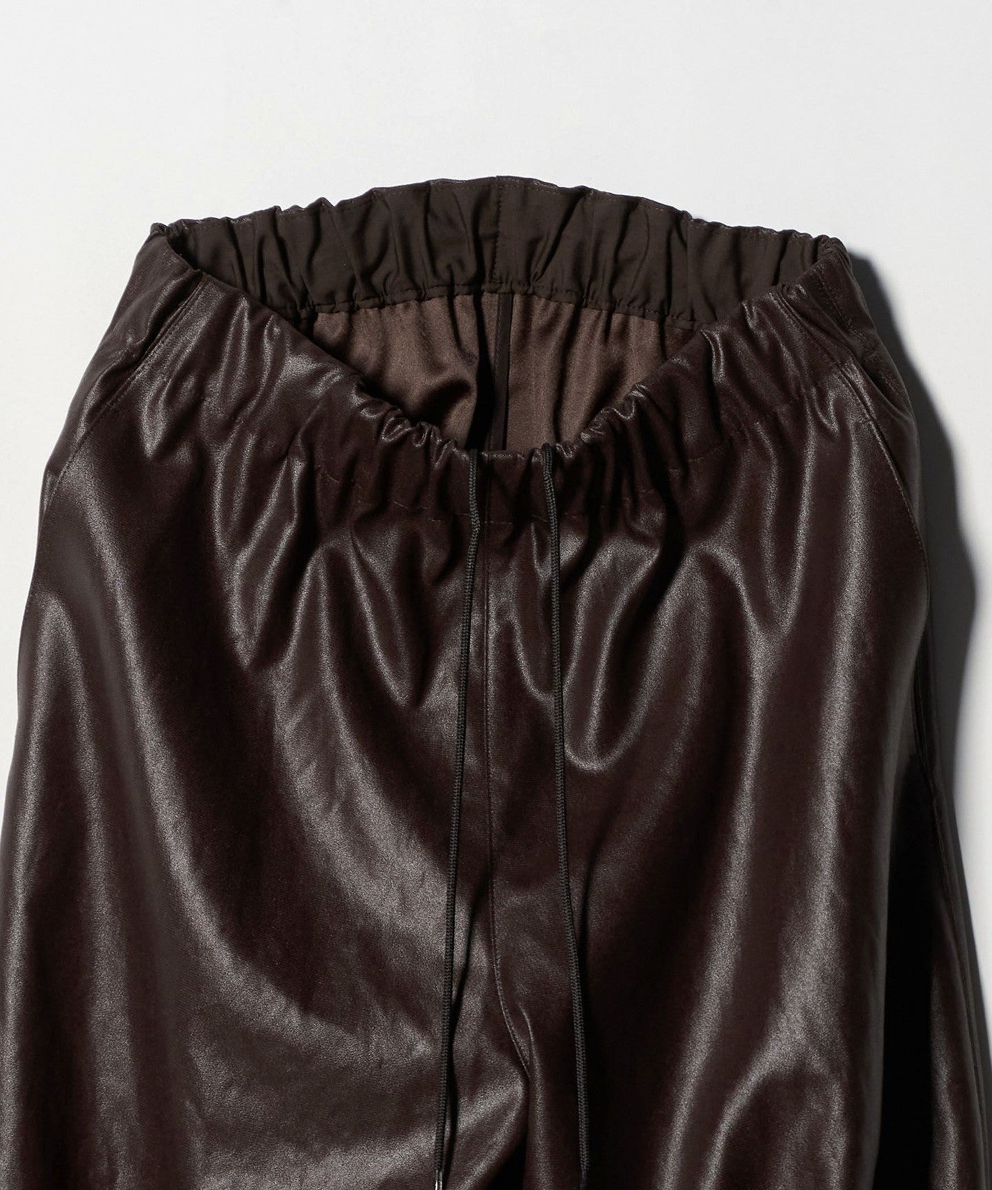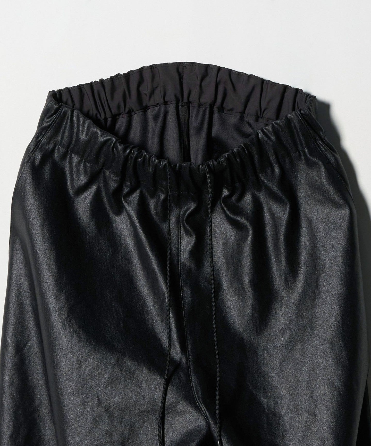 タフな重厚感を持ちあわせたリラクシーな雰囲気が魅力のレザーライクパンツです。光沢感のある表面加工を施したポリエステル素材を使用し、ほどよい厚さと張り感のある風合いが特徴です。たっぷりとしたウエストギャザーに、ゆるめのカーブシルエットが力の抜けた大人のスタイルを演出。穏やかな風合いのニットやコットンシャツなど、質感の異なる組み合わせが様になります。存在感がありながらも、日常に合わせやすいスポーティーなカジュアルフィーリングが、ファッションムードを高めてくれます。