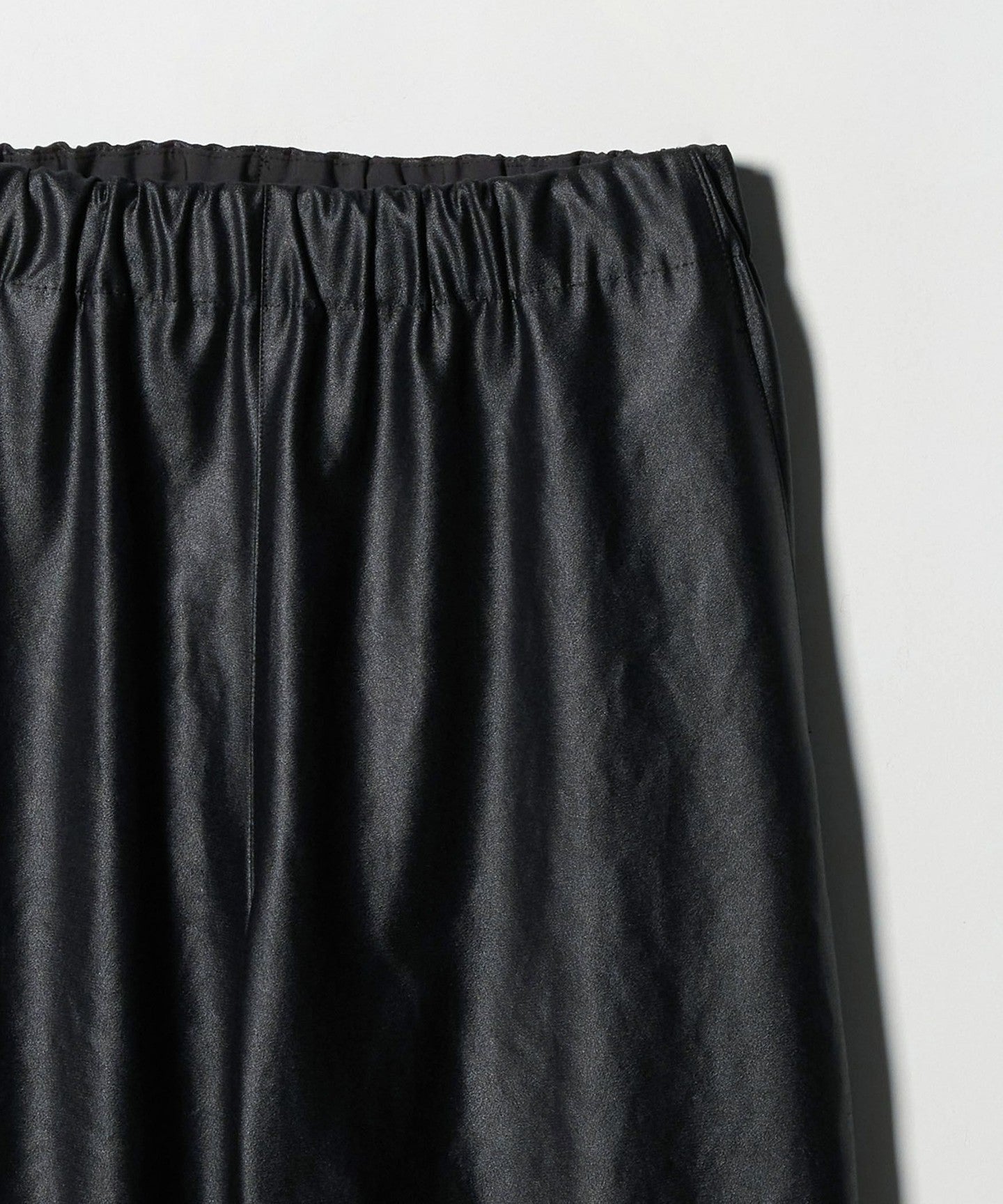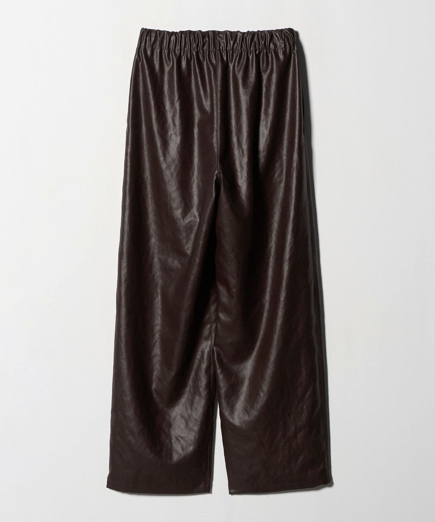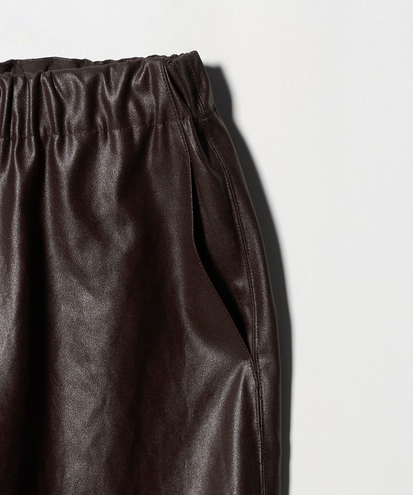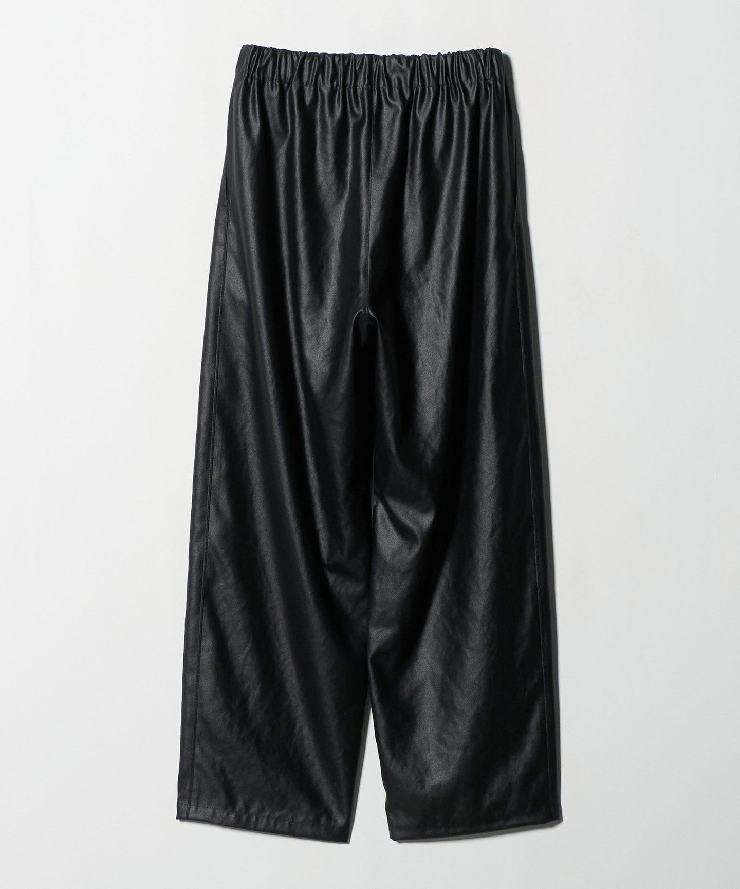 タフな重厚感を持ちあわせたリラクシーな雰囲気が魅力のレザーライクパンツです。光沢感のある表面加工を施したポリエステル素材を使用し、ほどよい厚さと張り感のある風合いが特徴です。たっぷりとしたウエストギャザーに、ゆるめのカーブシルエットが力の抜けた大人のスタイルを演出。穏やかな風合いのニットやコットンシャツなど、質感の異なる組み合わせが様になります。存在感がありながらも、日常に合わせやすいスポーティーなカジュアルフィーリングが、ファッションムードを高めてくれます。