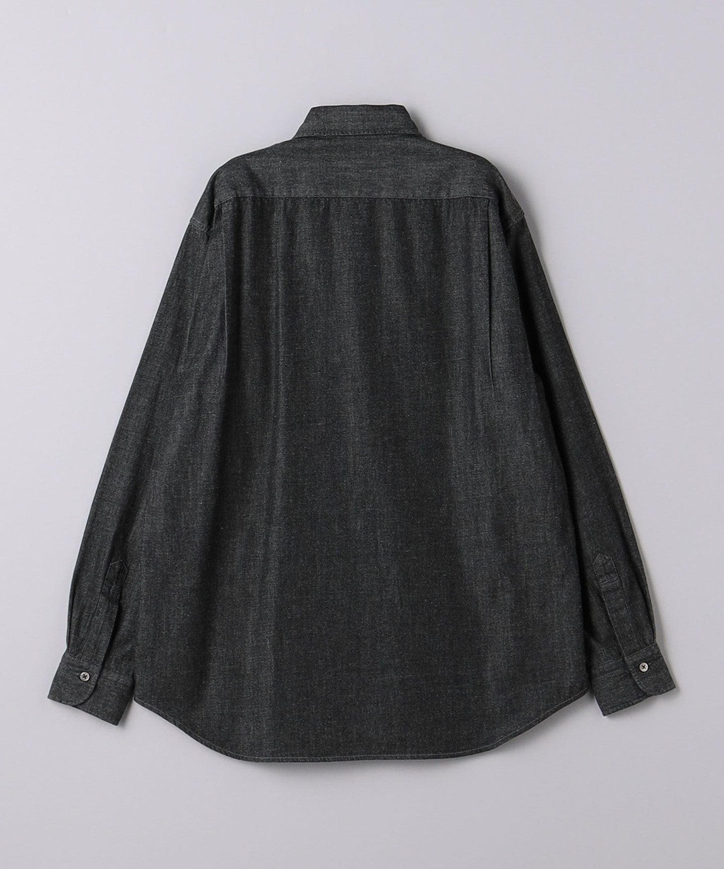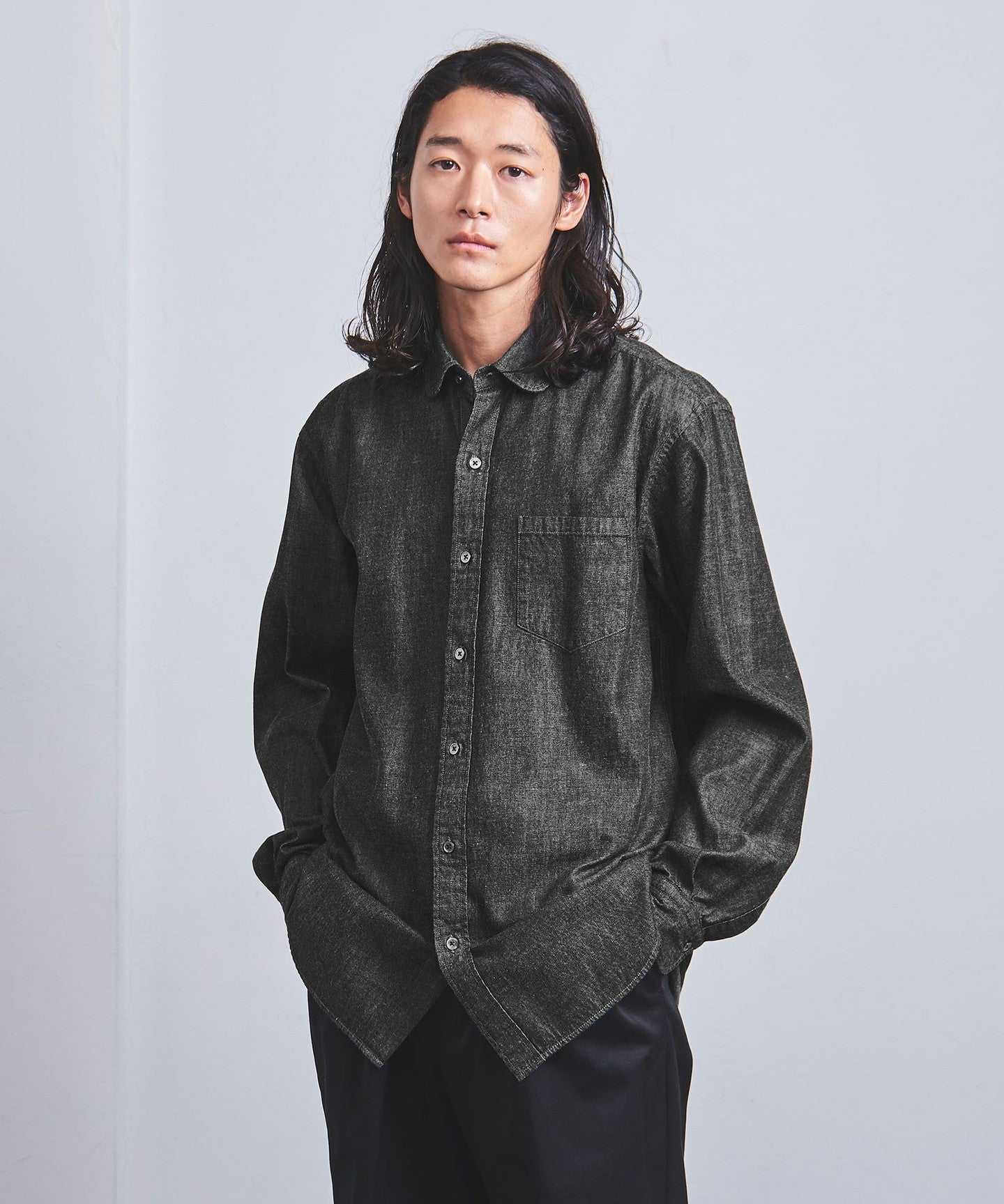A round-collar denim shirt that gives a soft impression