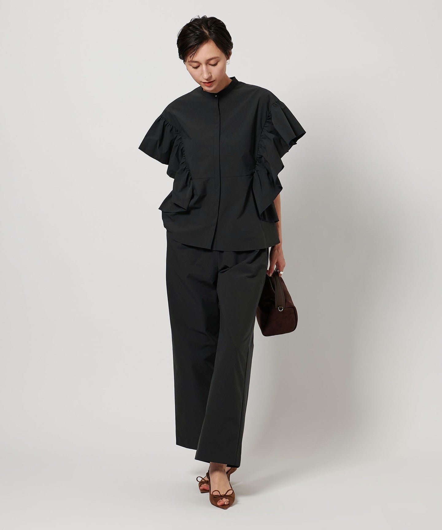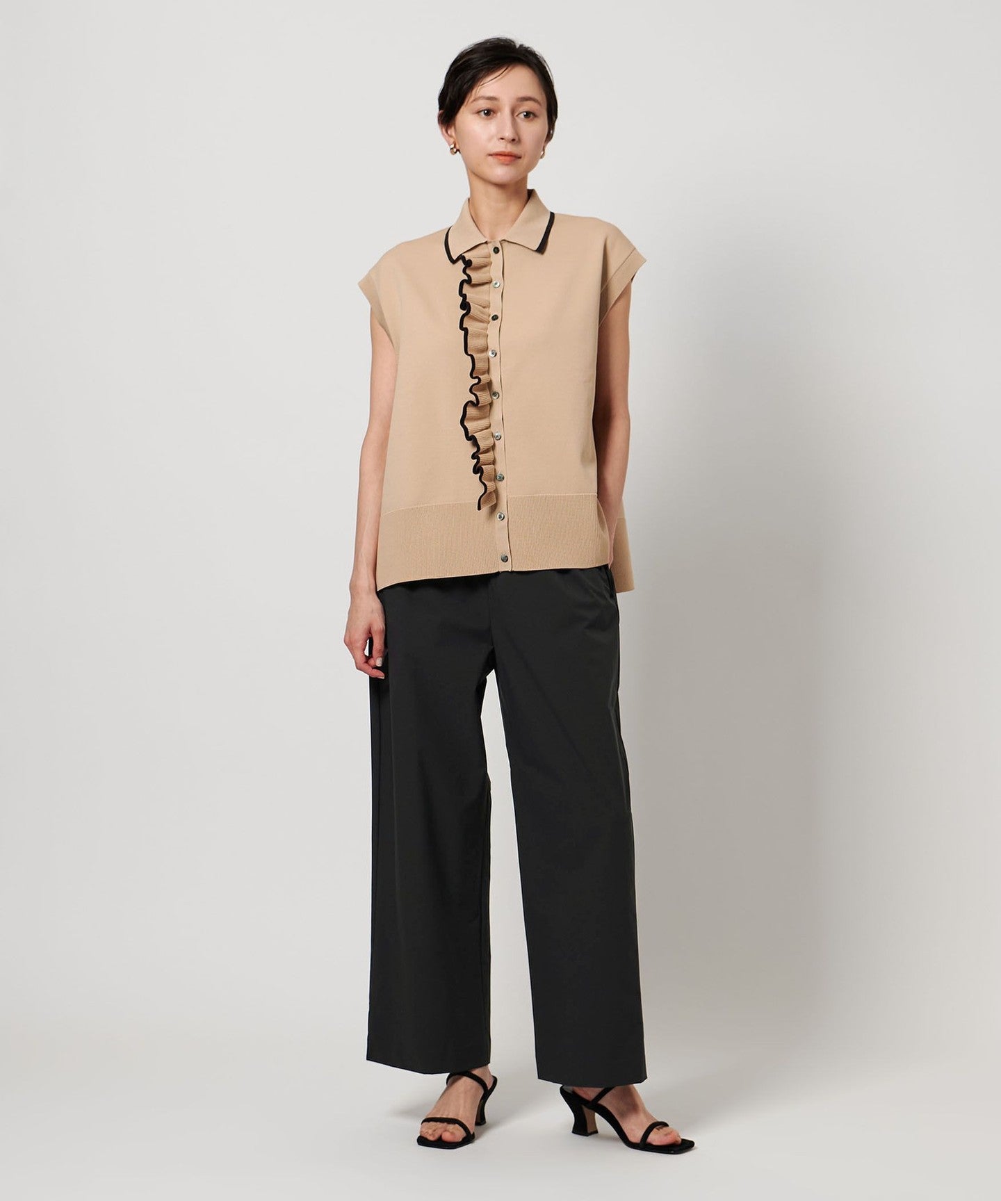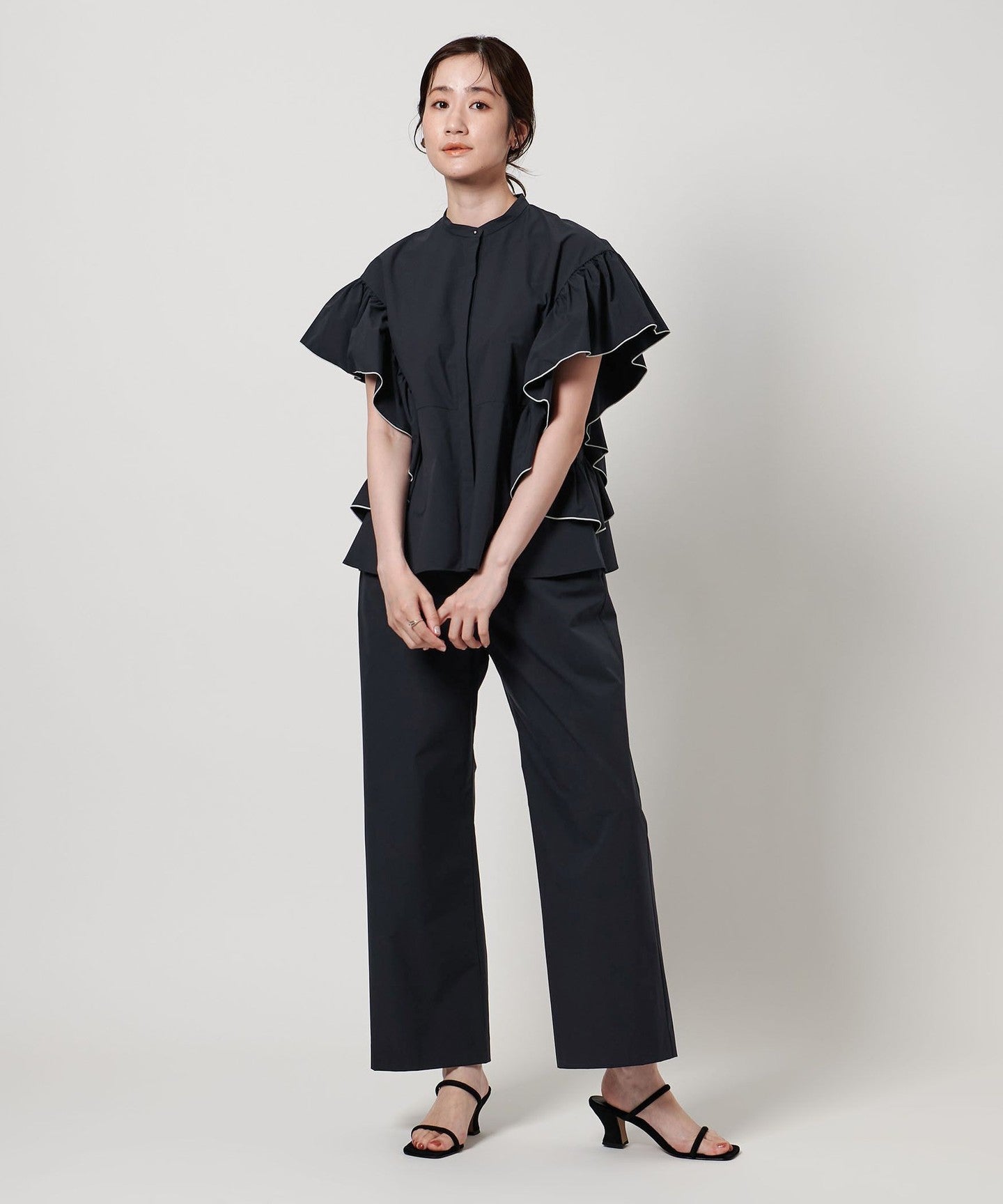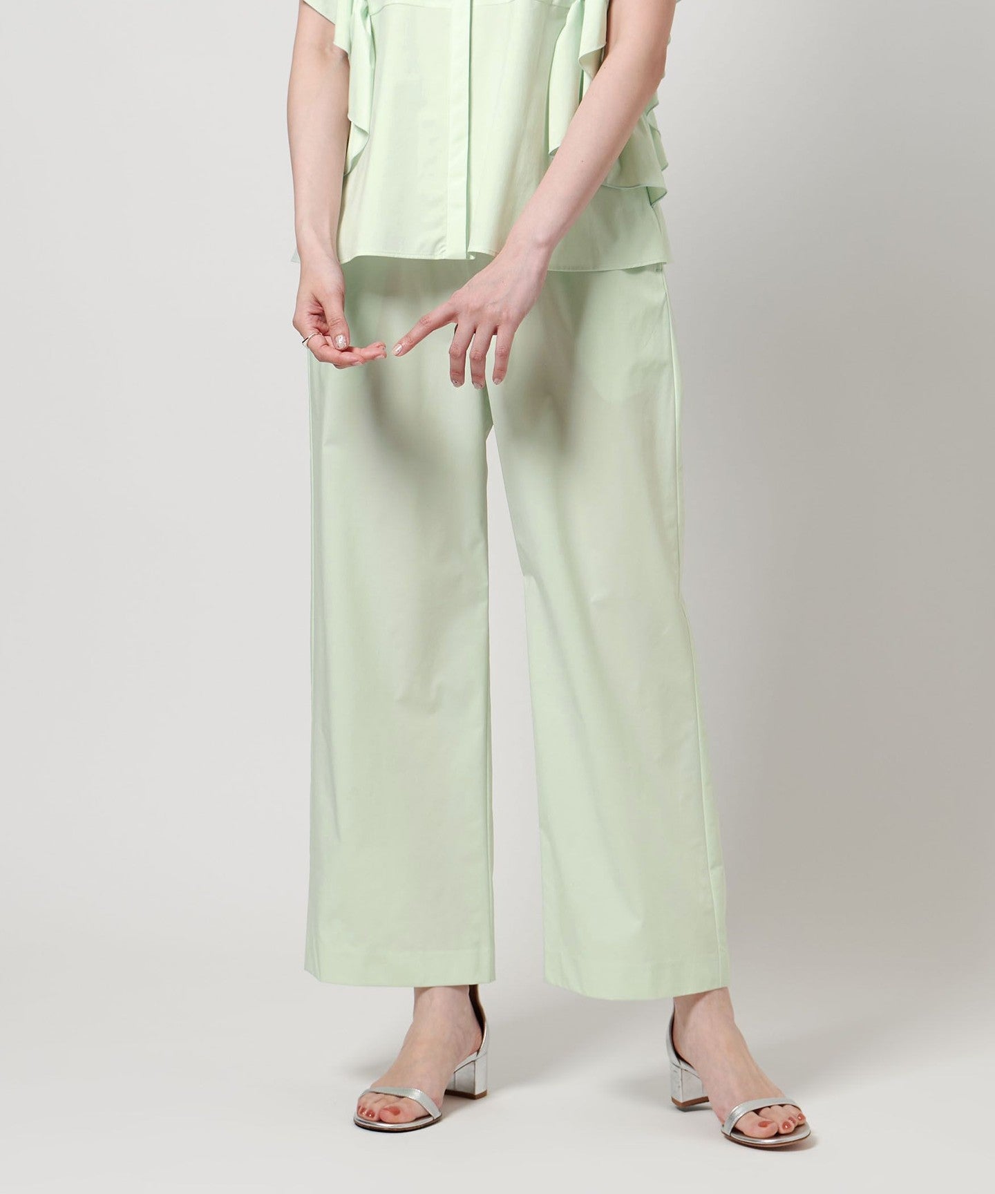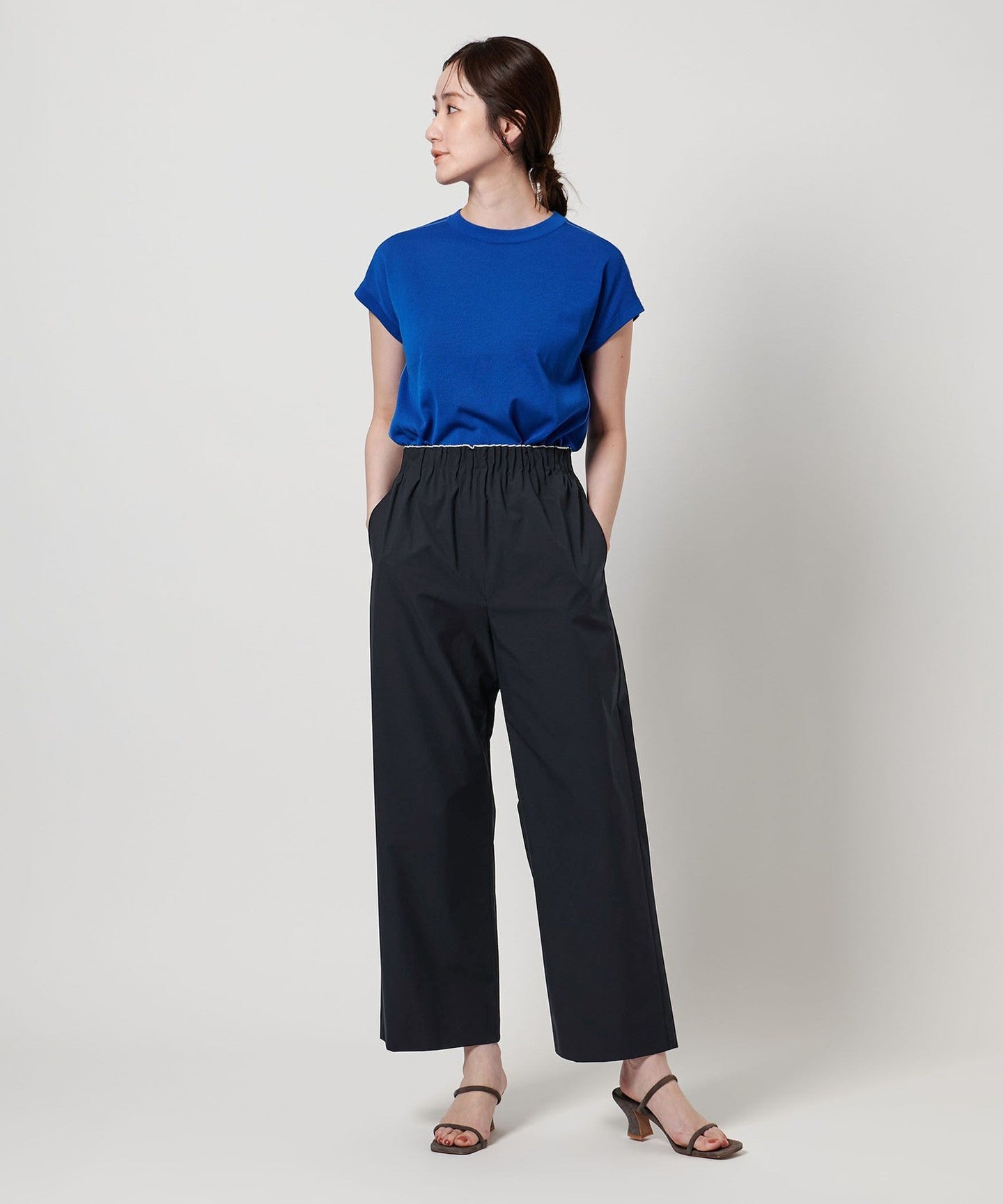 It can be paired with a blouse made of the same material as a set, and we also recommend pairing it with a T-shirt or fitted knit.