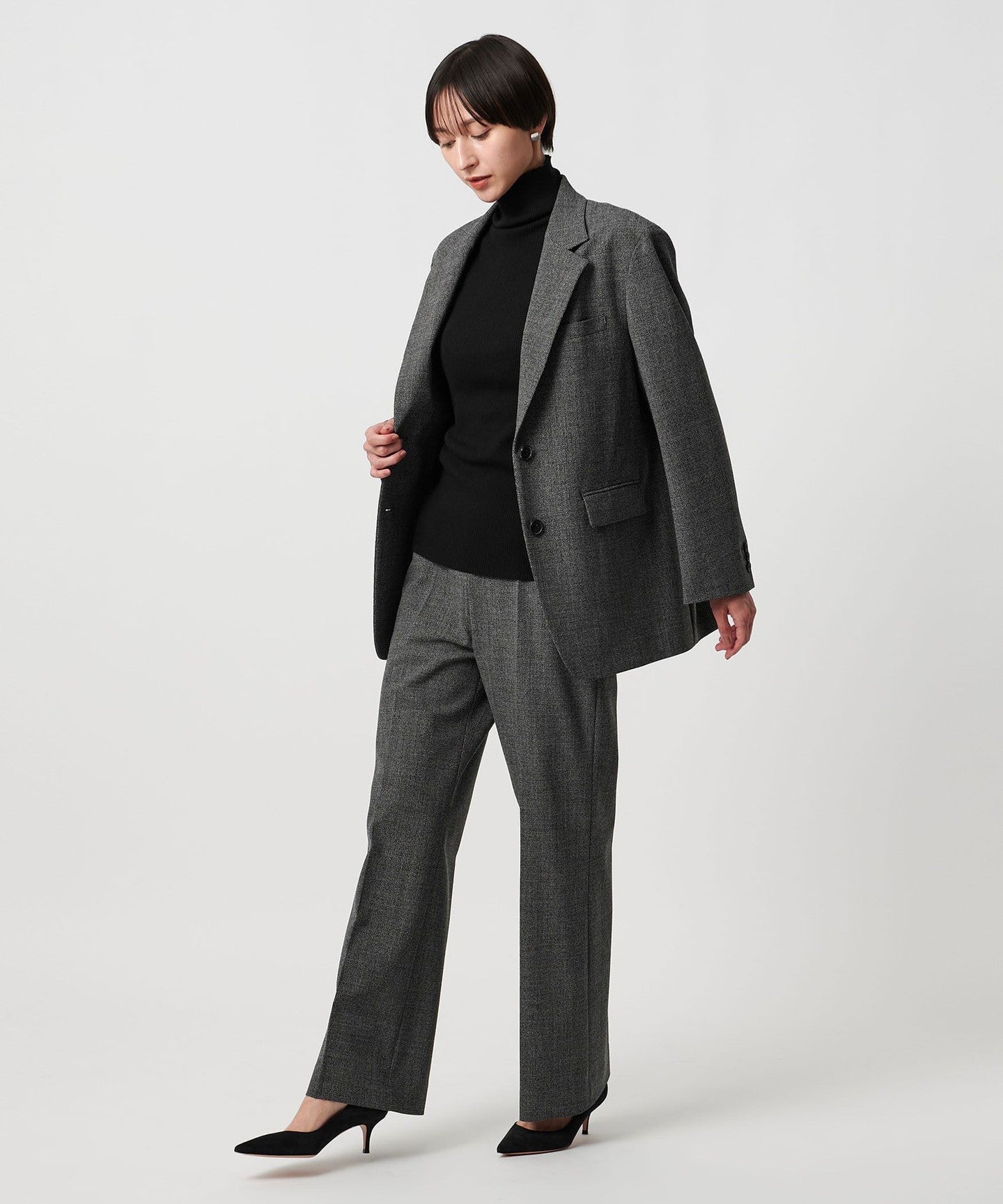 The body and turtleneck parts are knitted together, giving a clean impression.