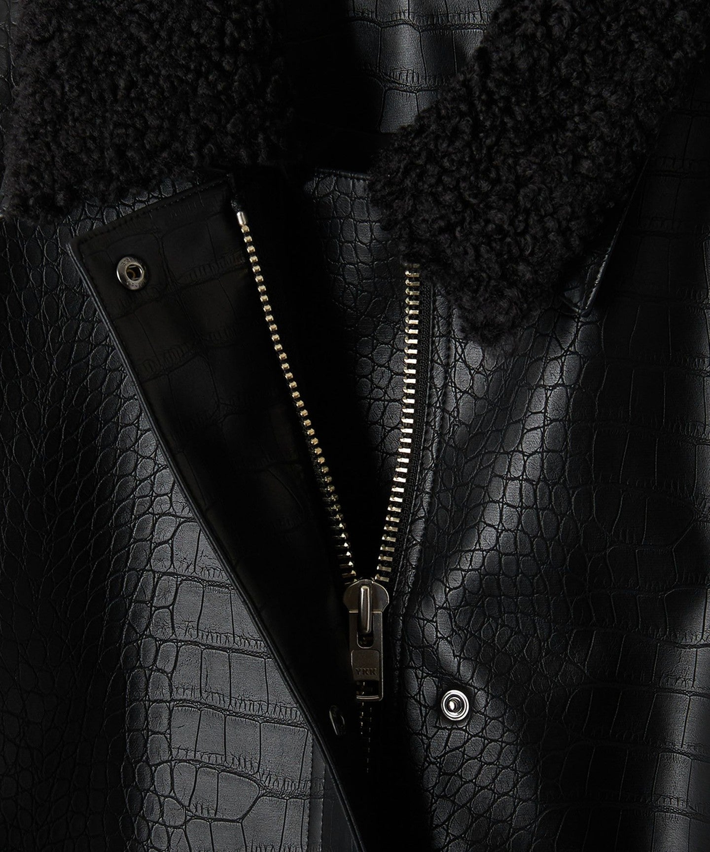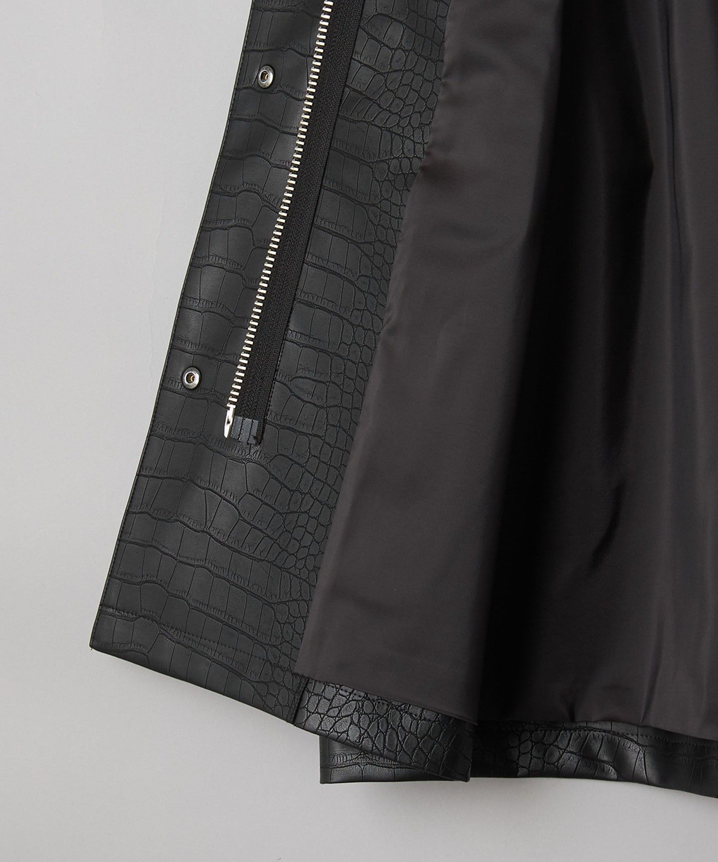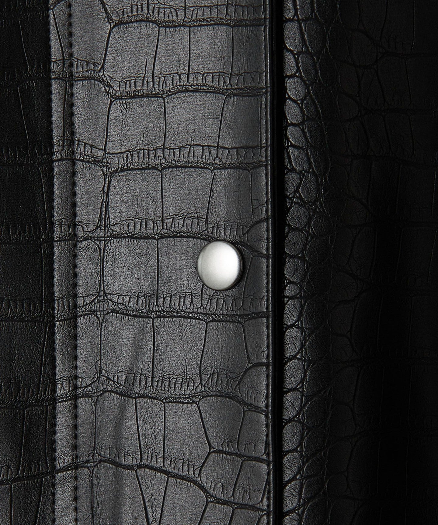 This is a coverall-style jacket made from leather-like material with chunky snap buttons and metal zippers for a rugged look.