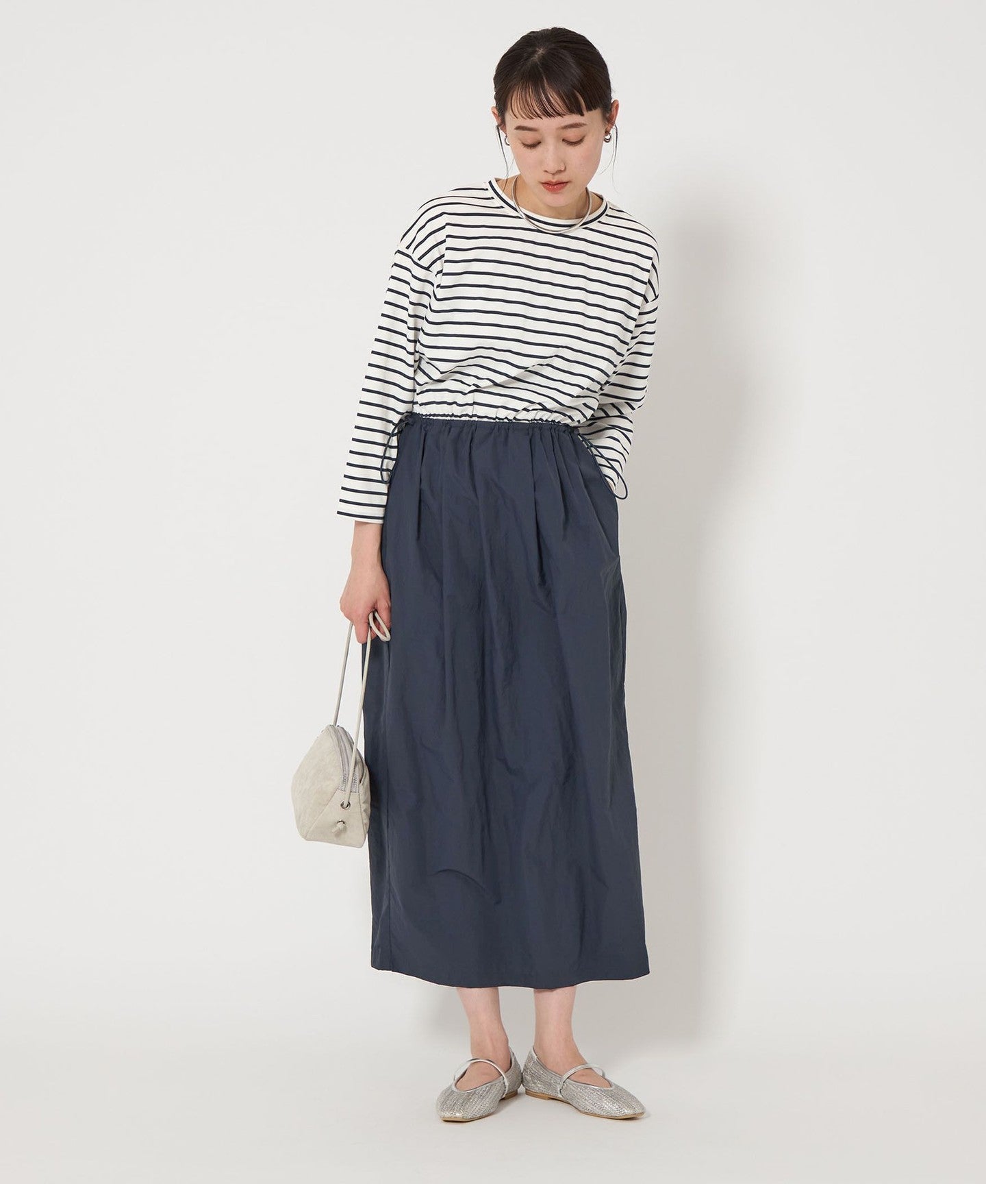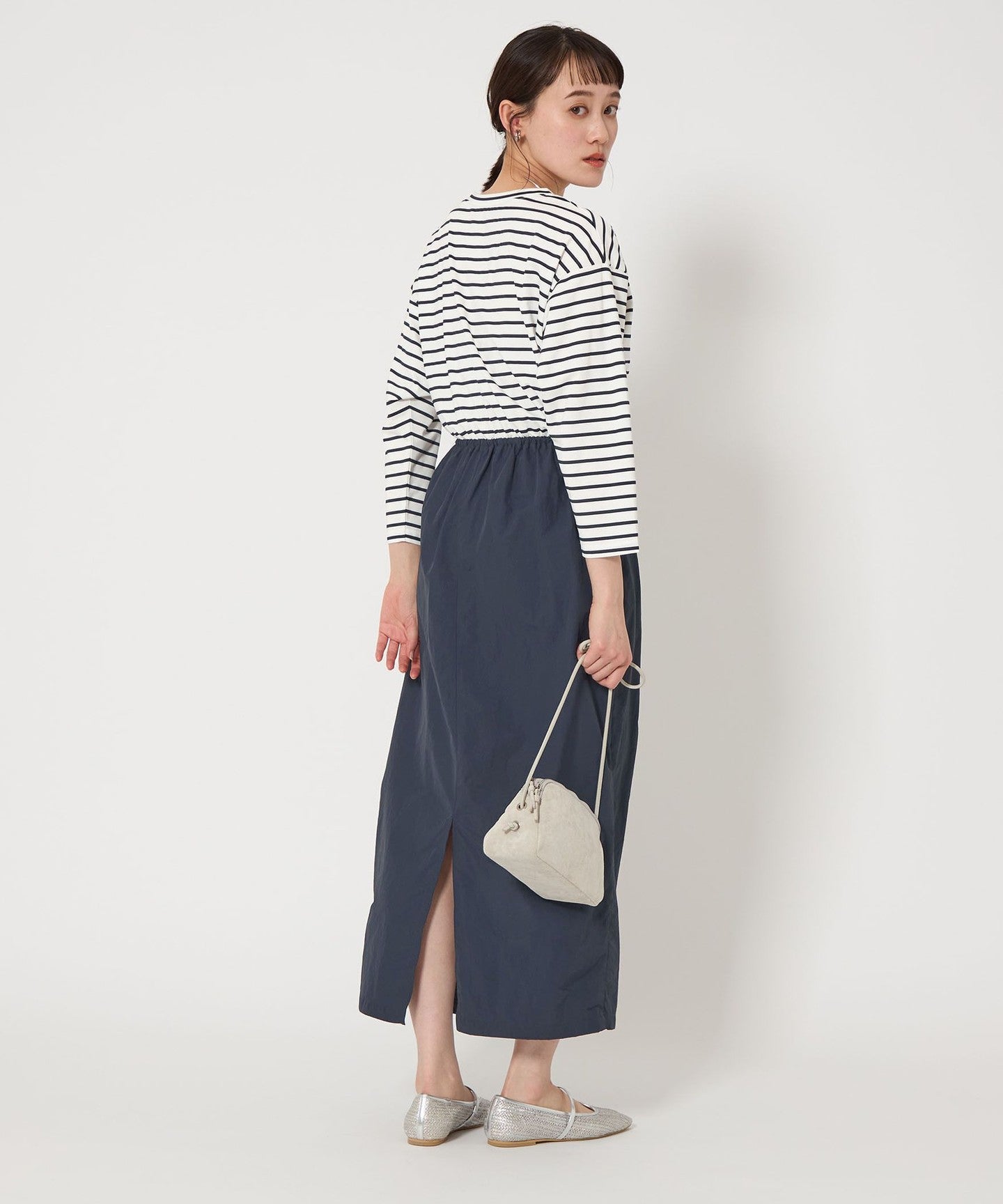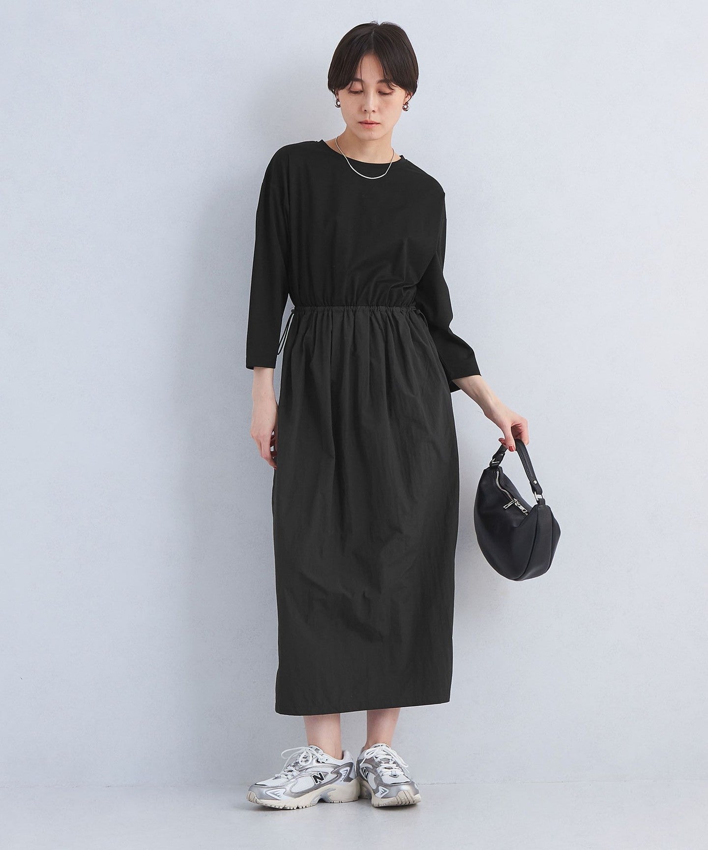 A dress with a cocoon silhouette skirt that creates a stylish look.