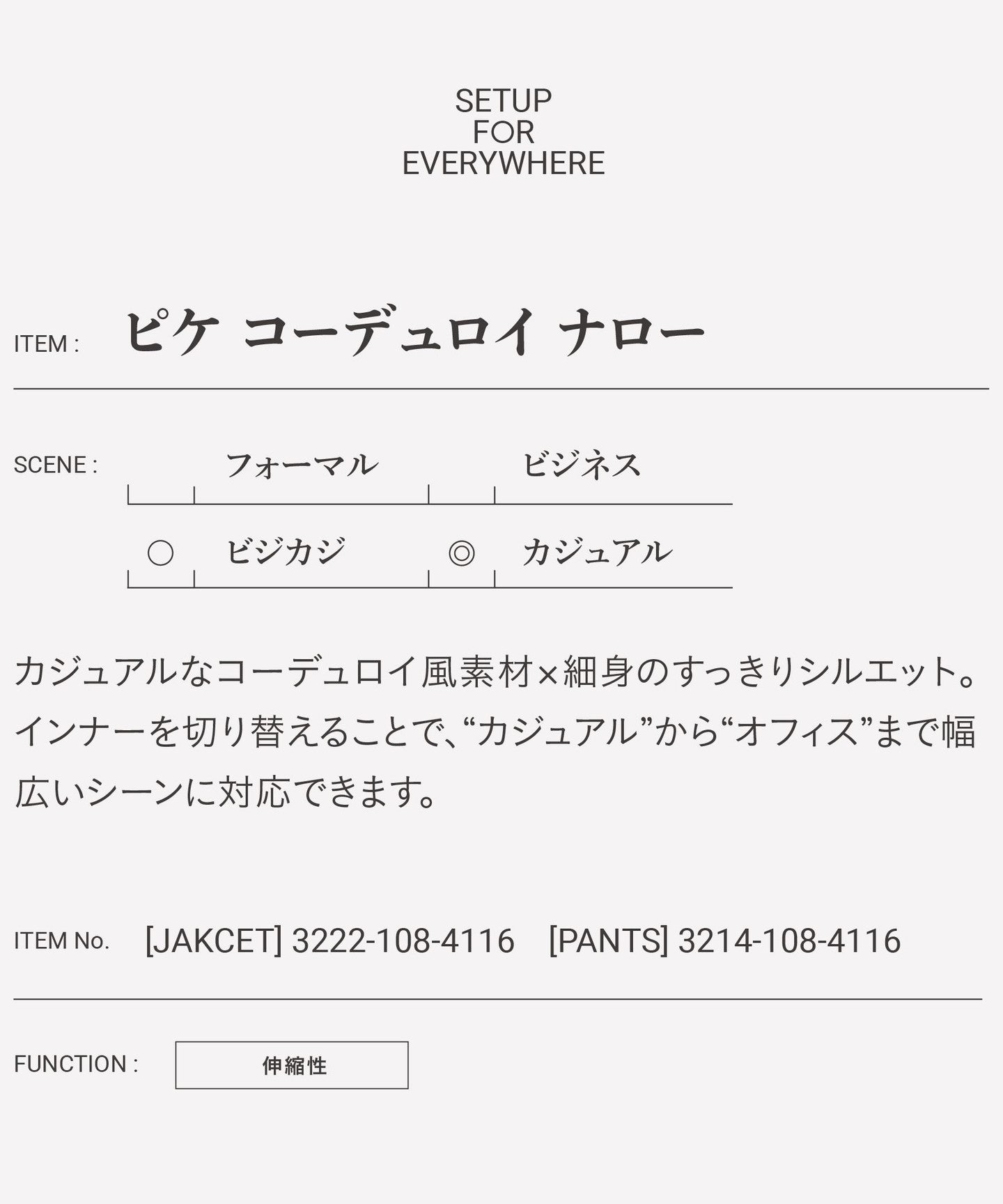Compared to regular corduroy, it is characterized by its lightness, neat texture and clean impression.