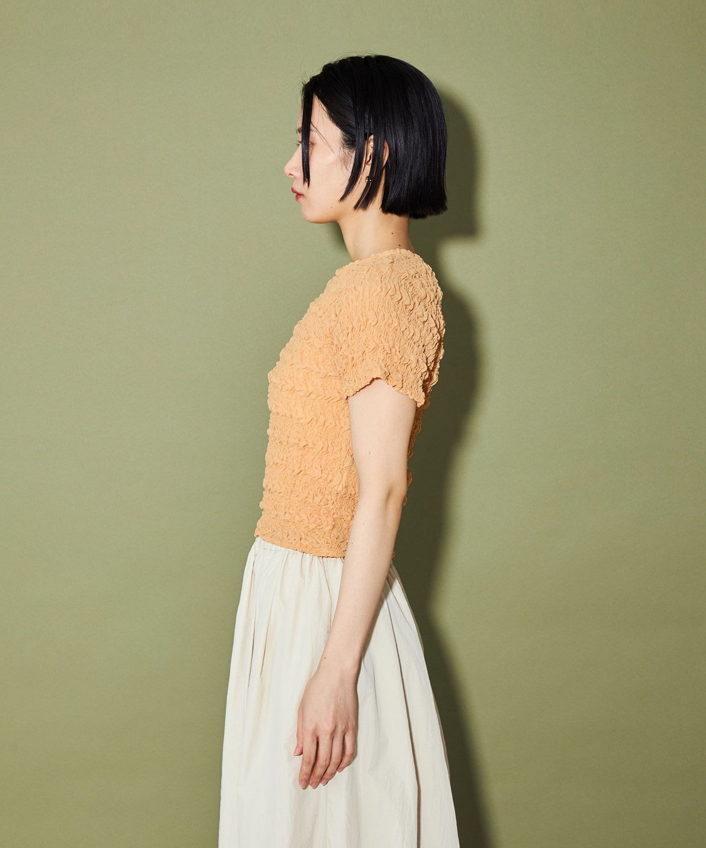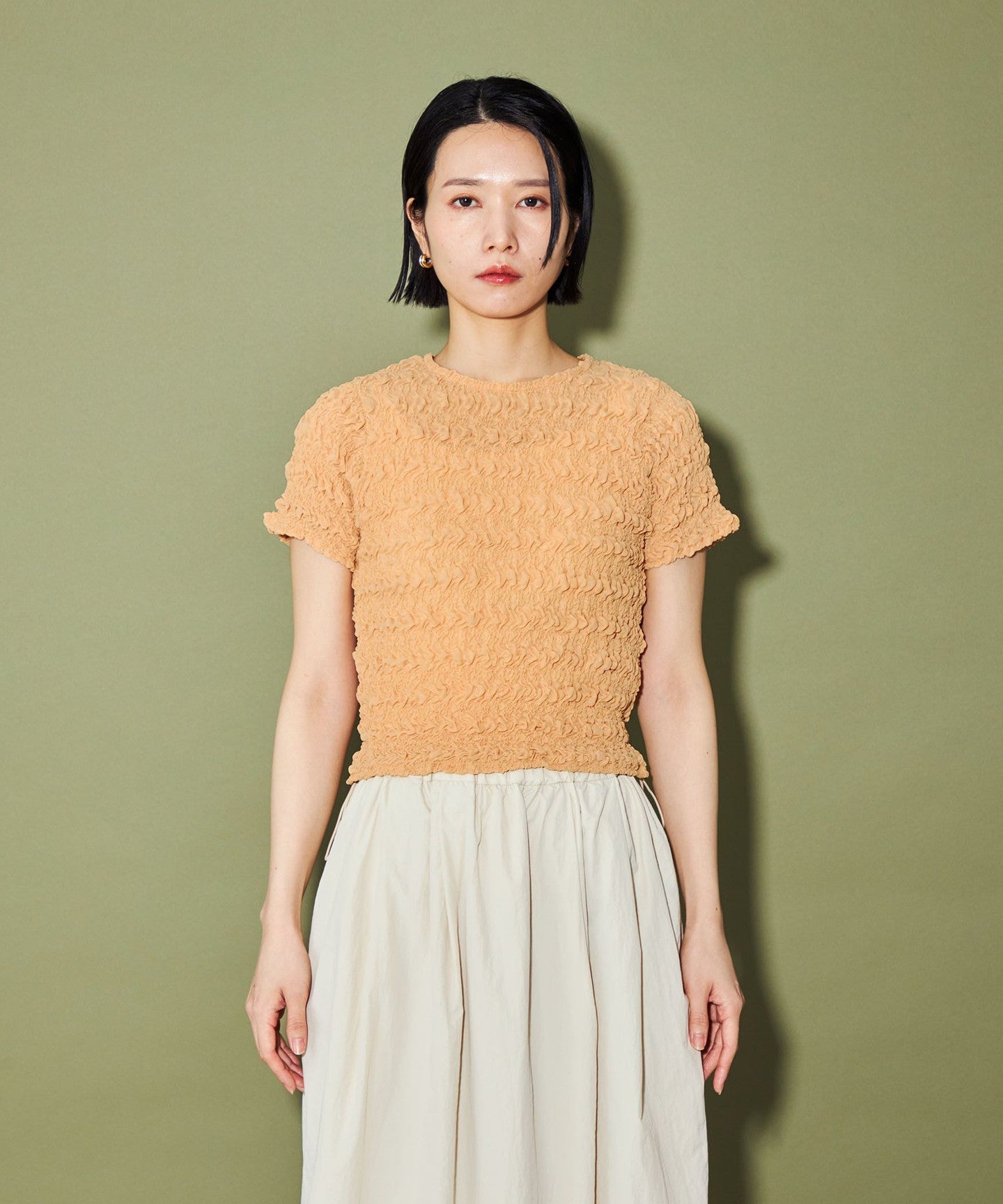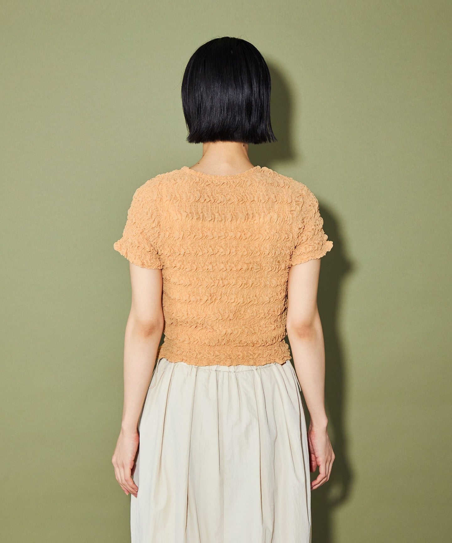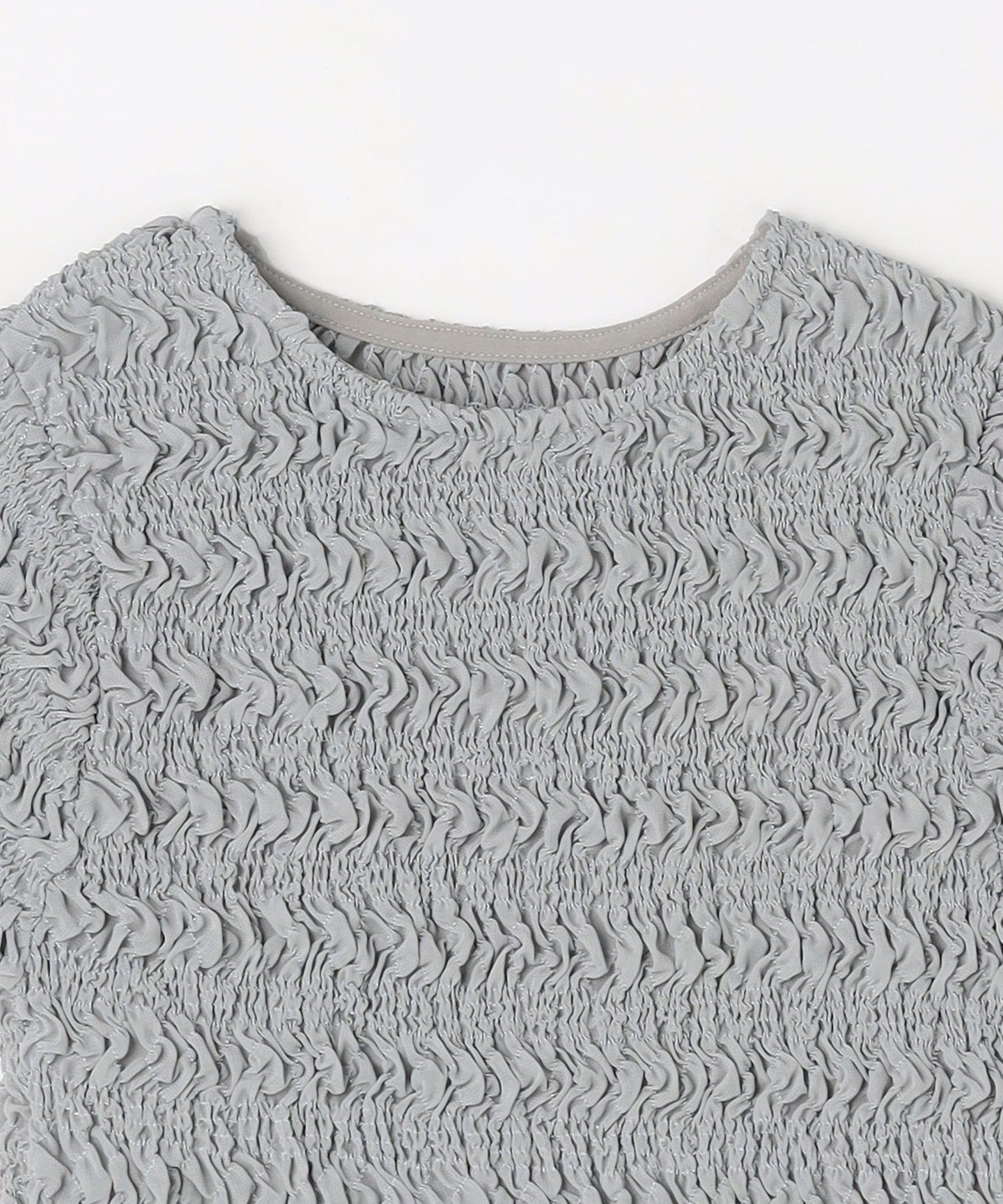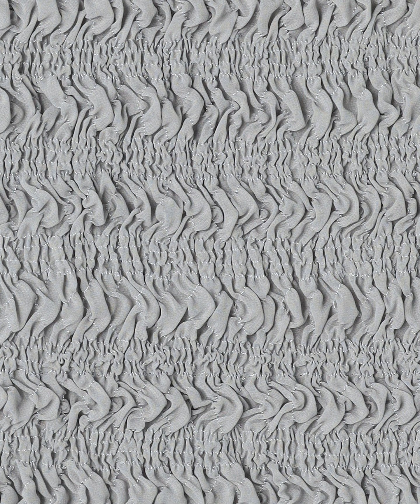 The thin and light fabric is finished with random border shirring to create a rich and expressive look.