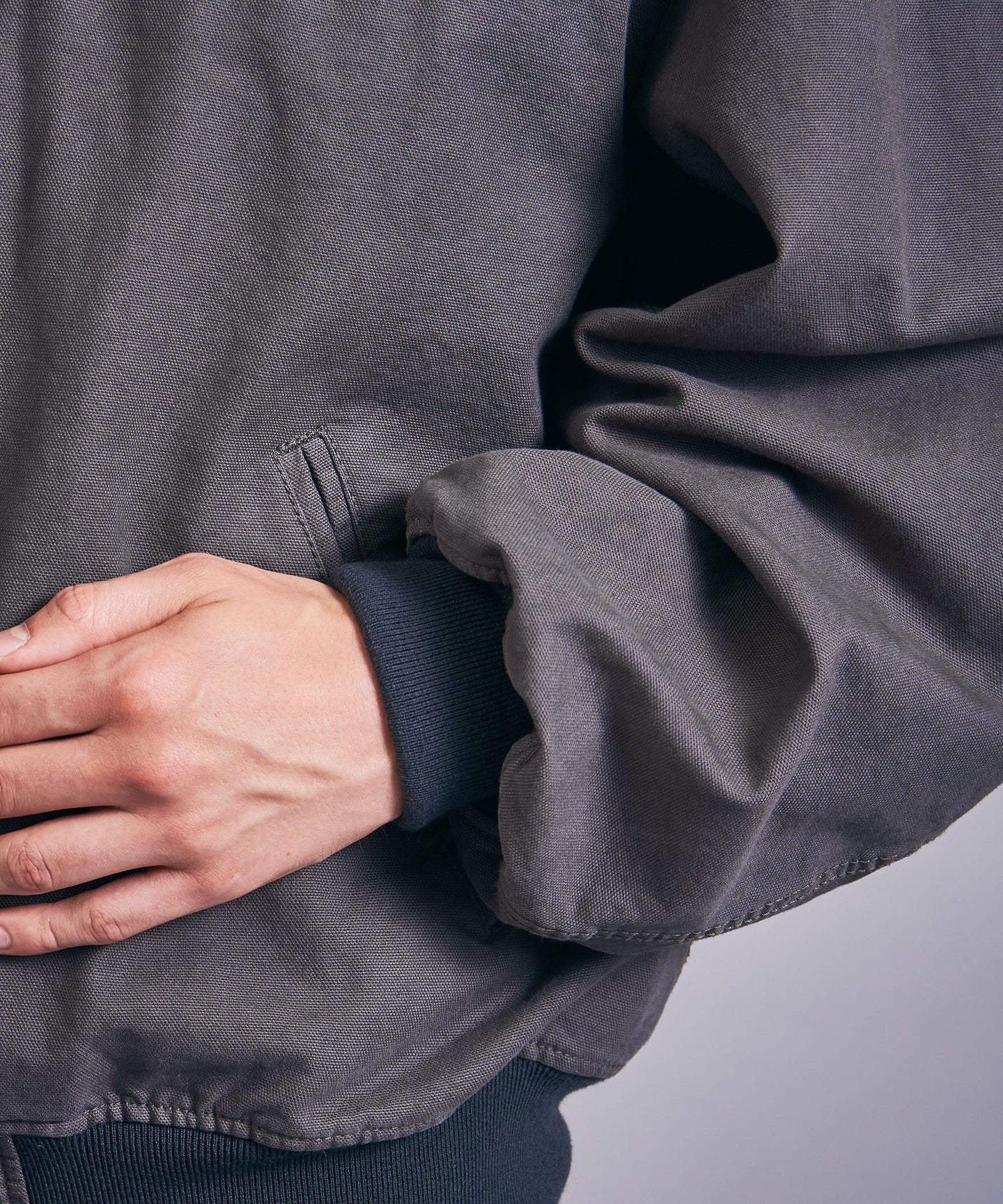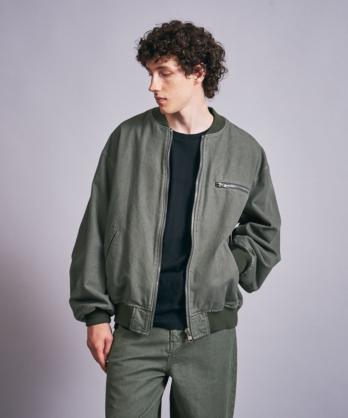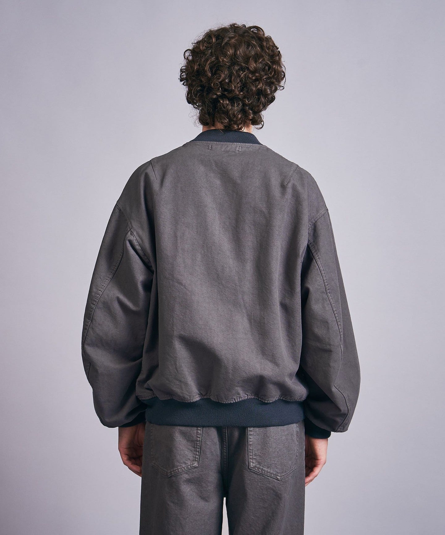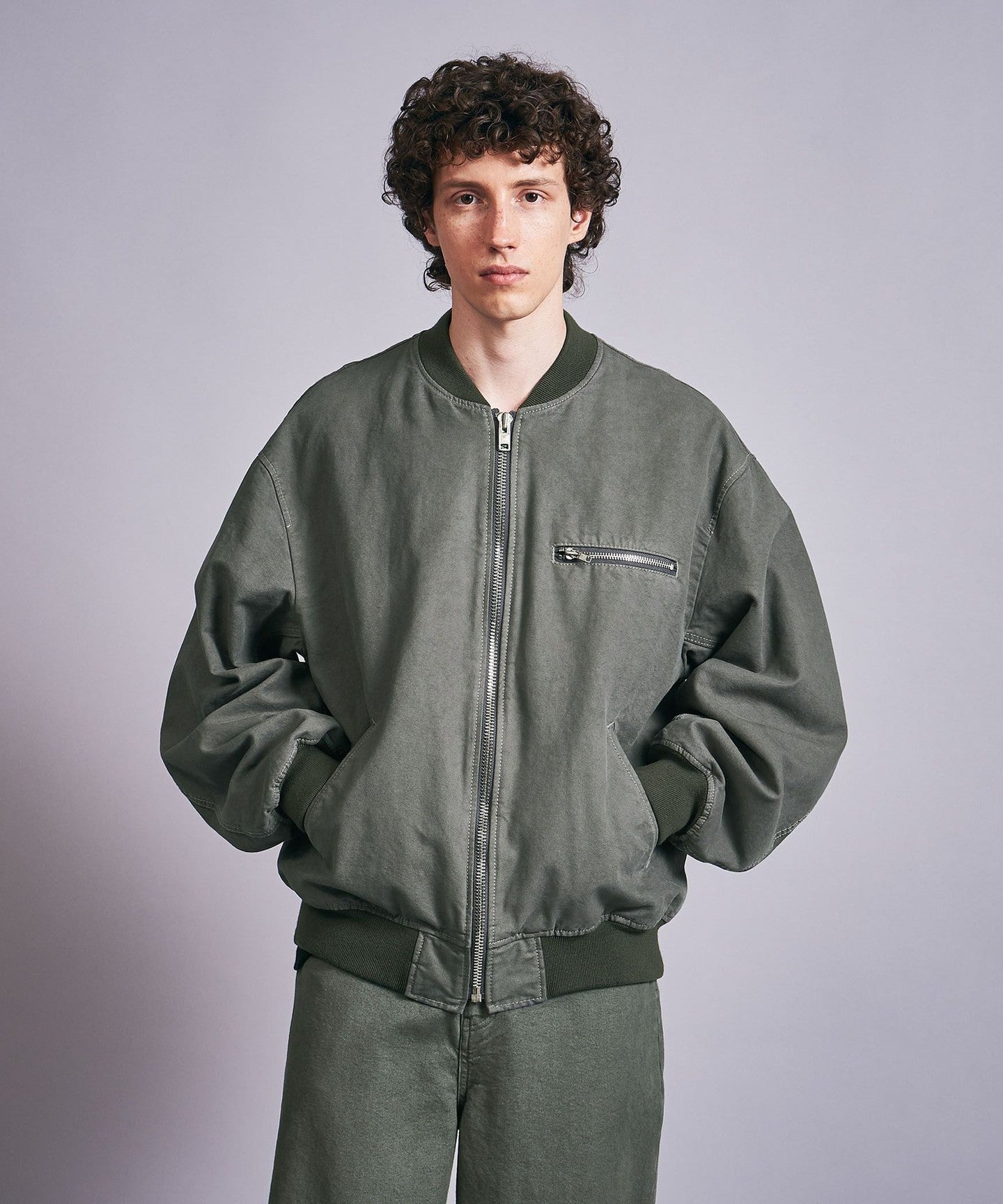 An oversized bomber jacket made from three-dimensional duck fabric.