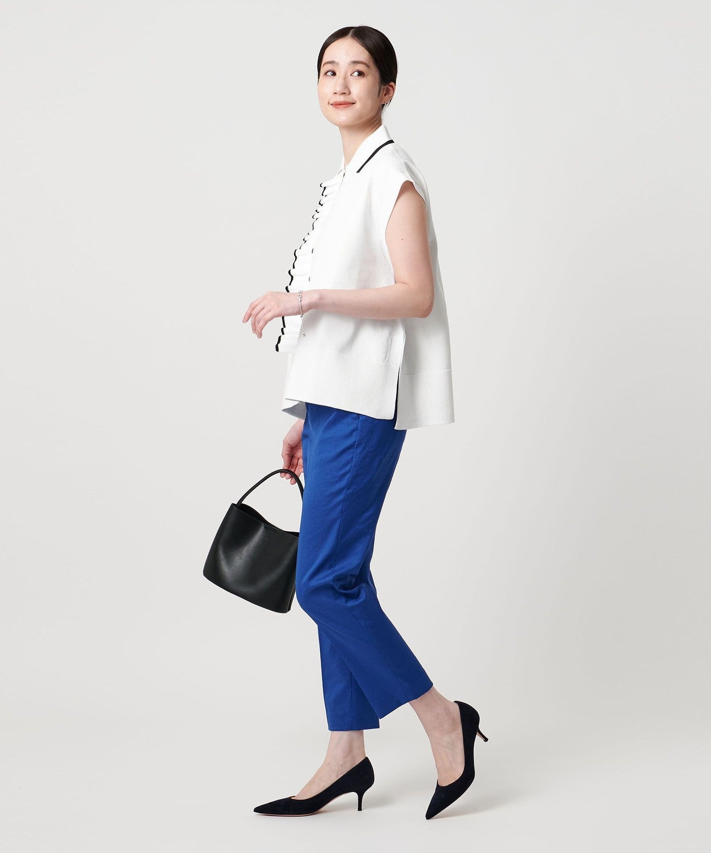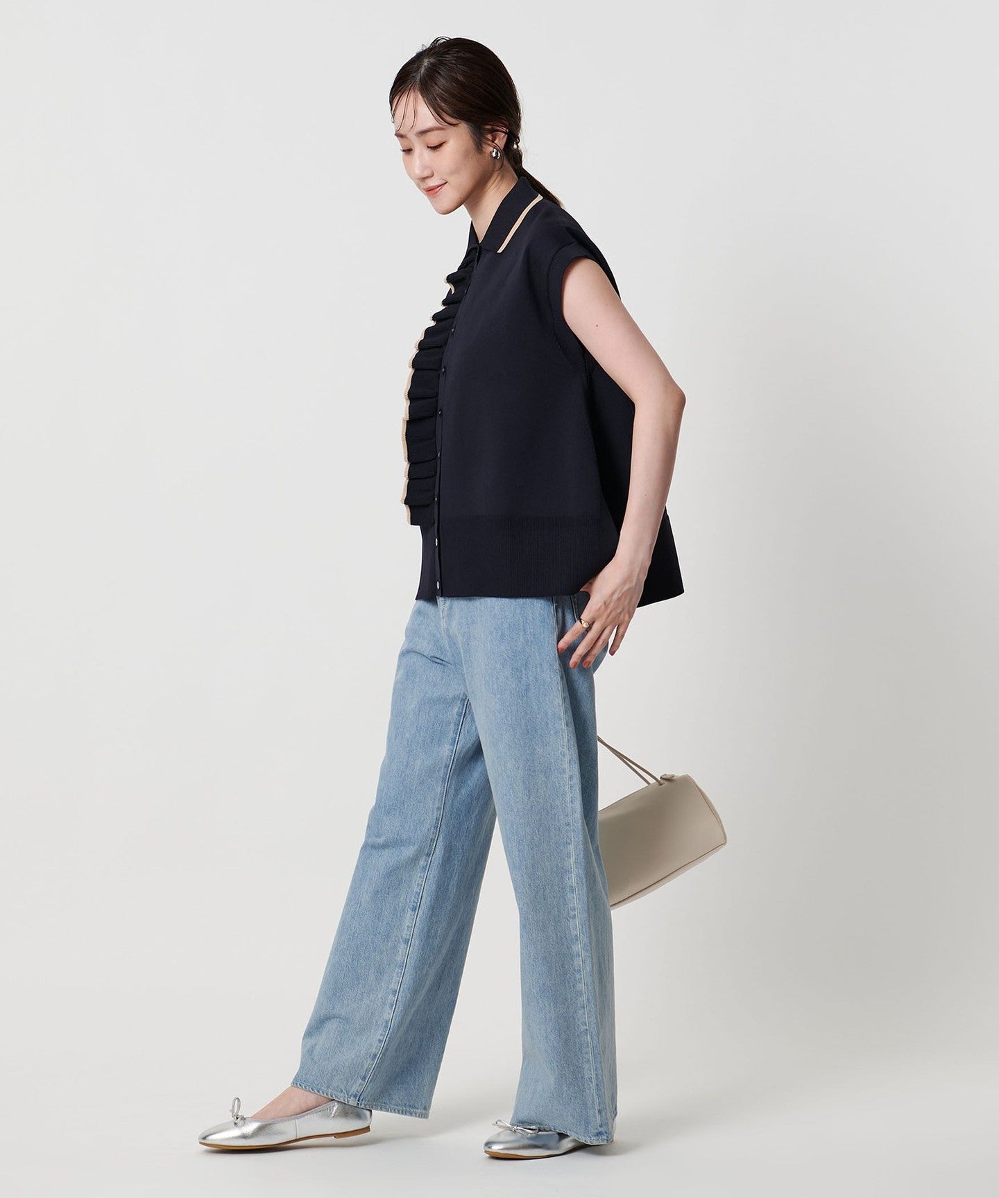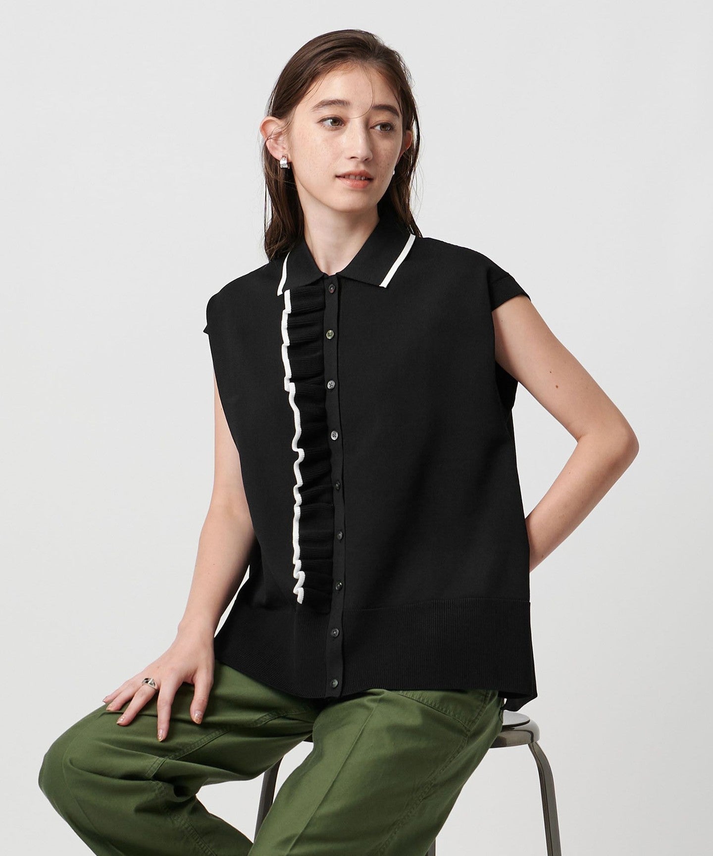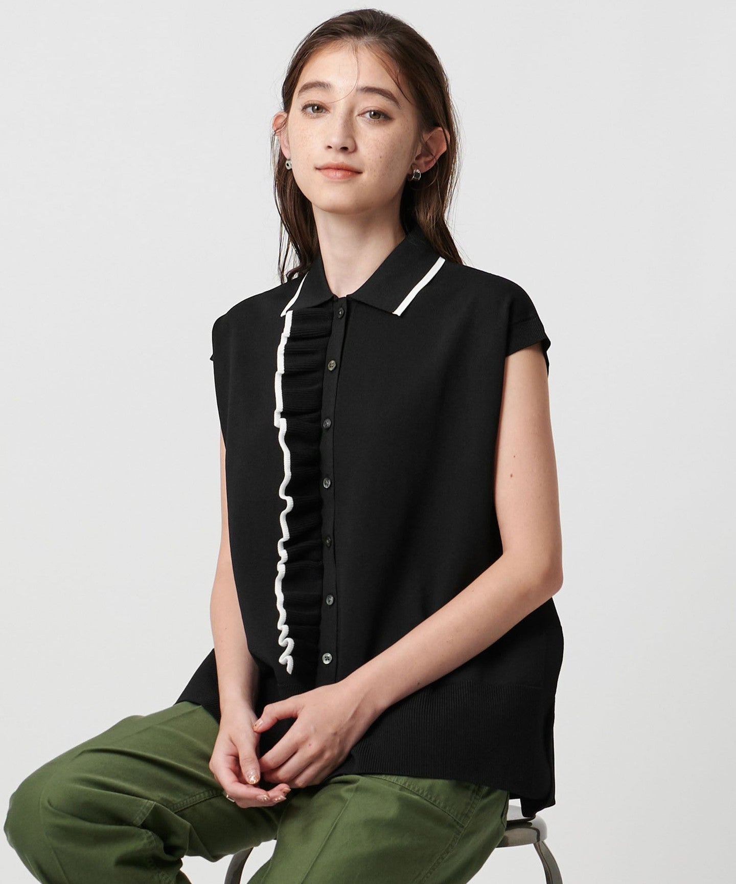 Pair it with wide pants for a mature, casual look with a subdued sweetness. The flowing frills match well with the silhouette of the skirt.