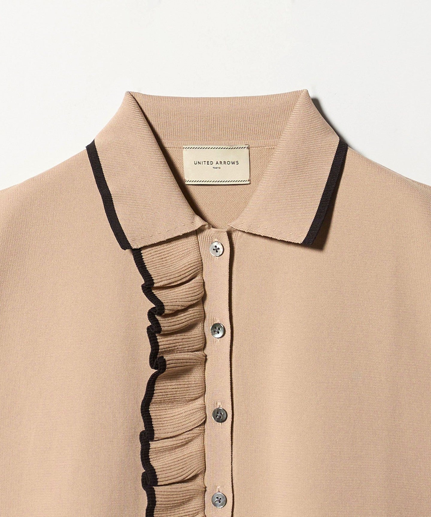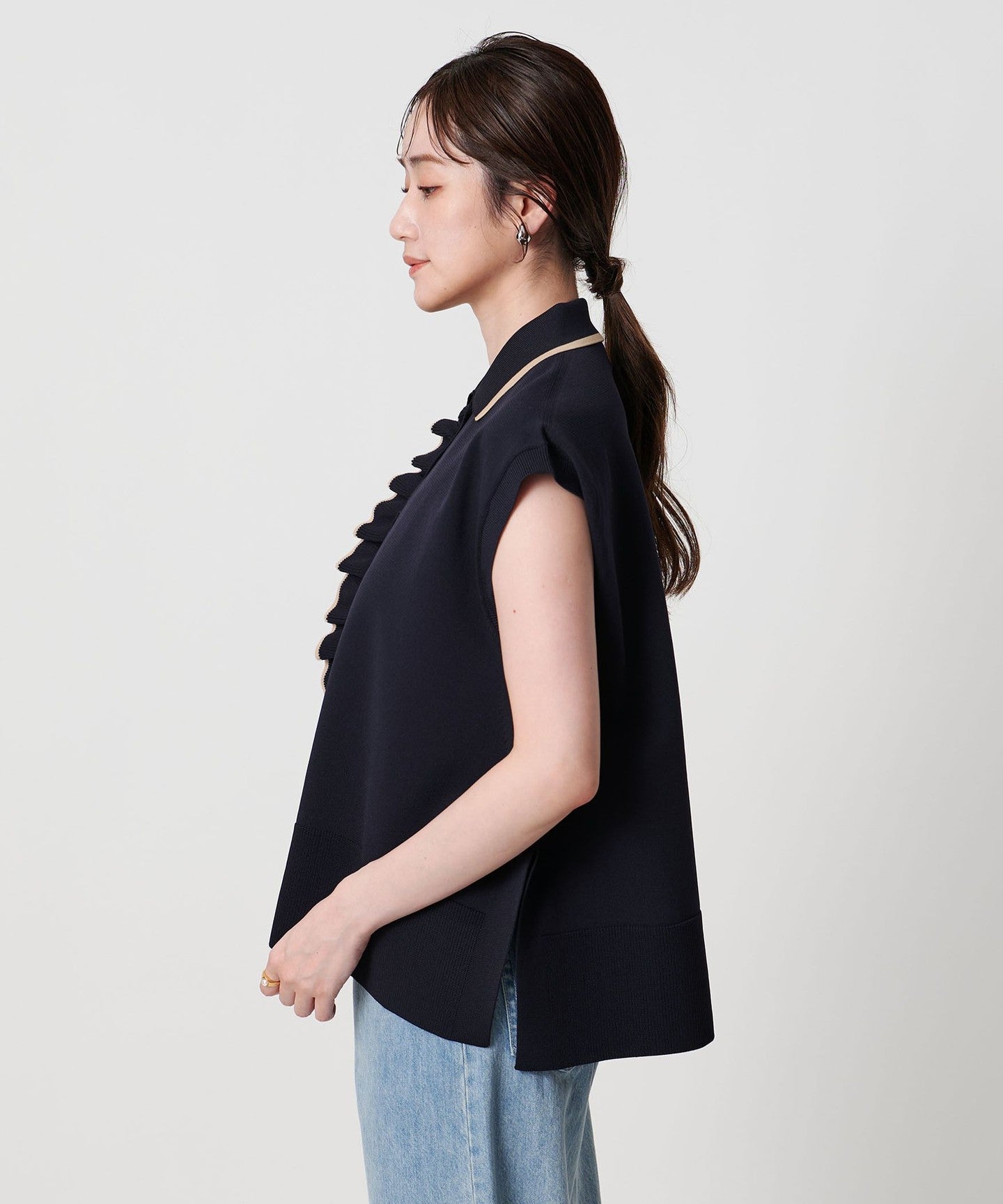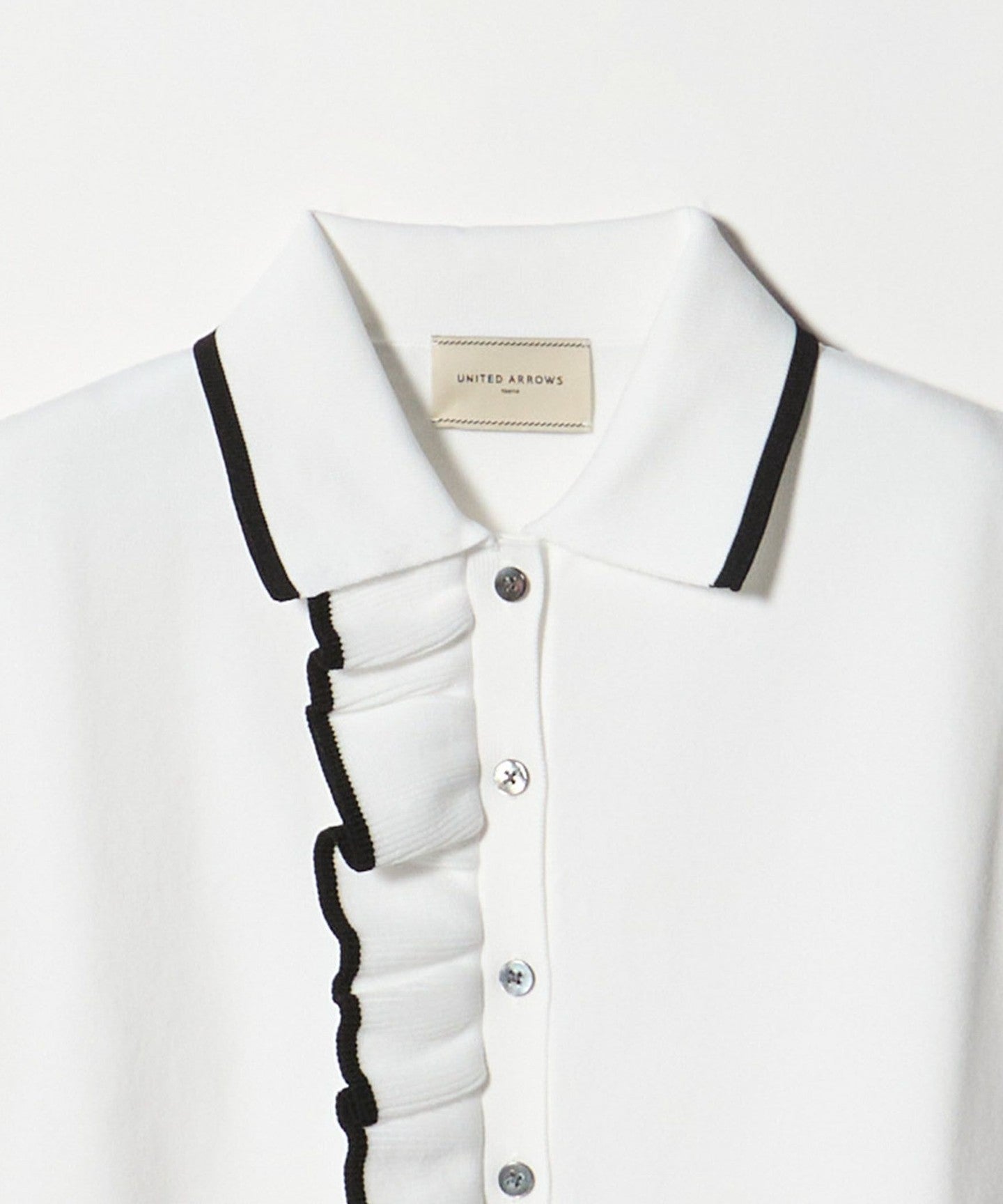 A polo collar knit with an impressive one-sided ruffle detail on the front.
