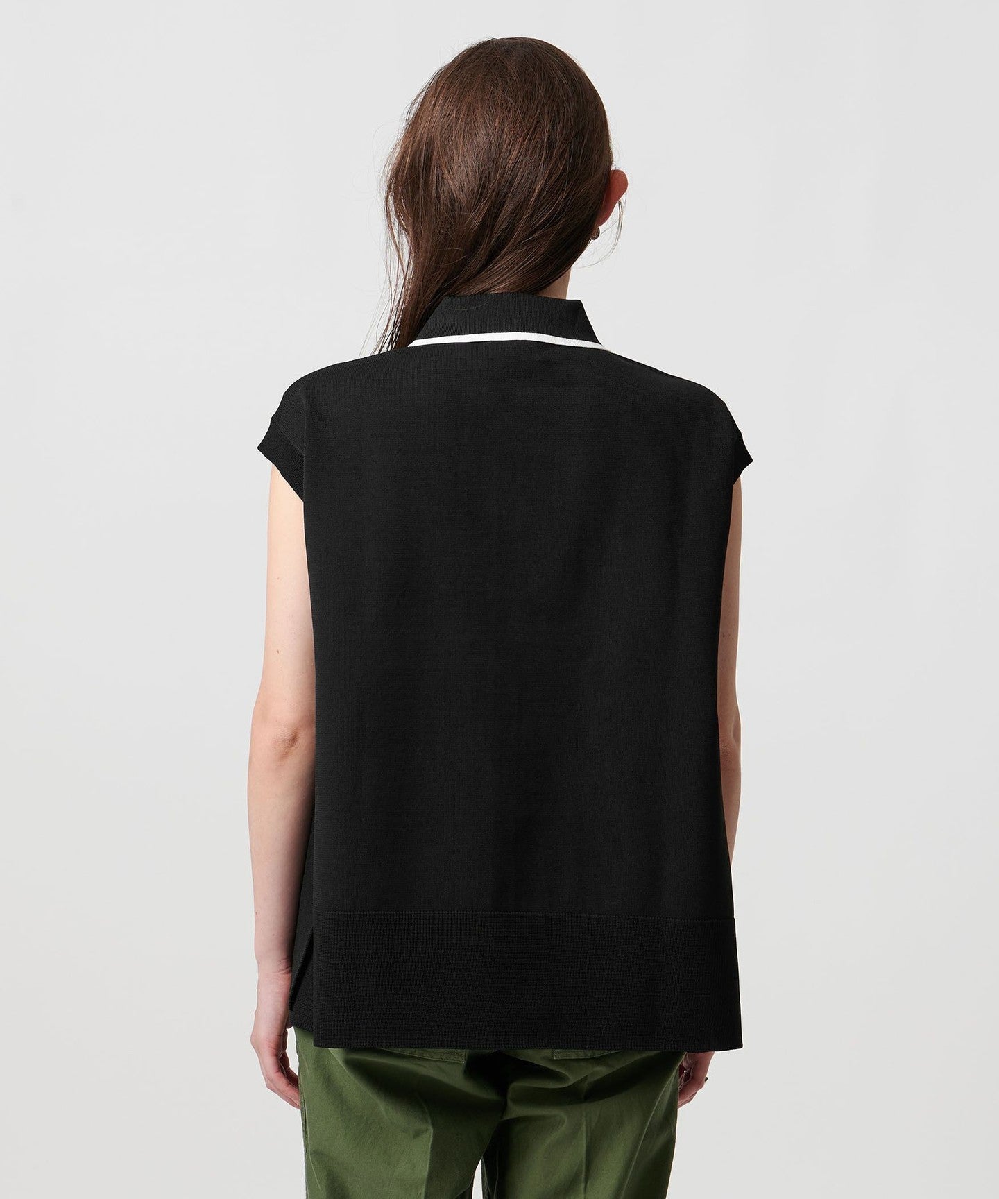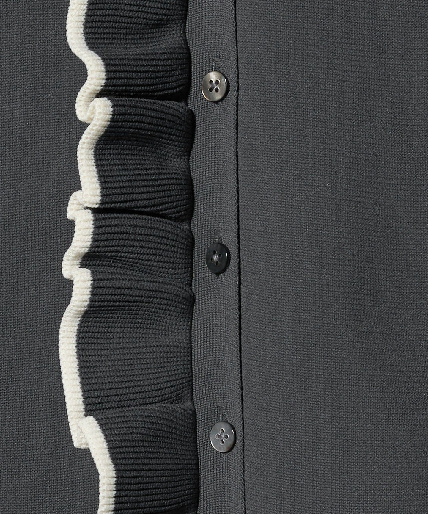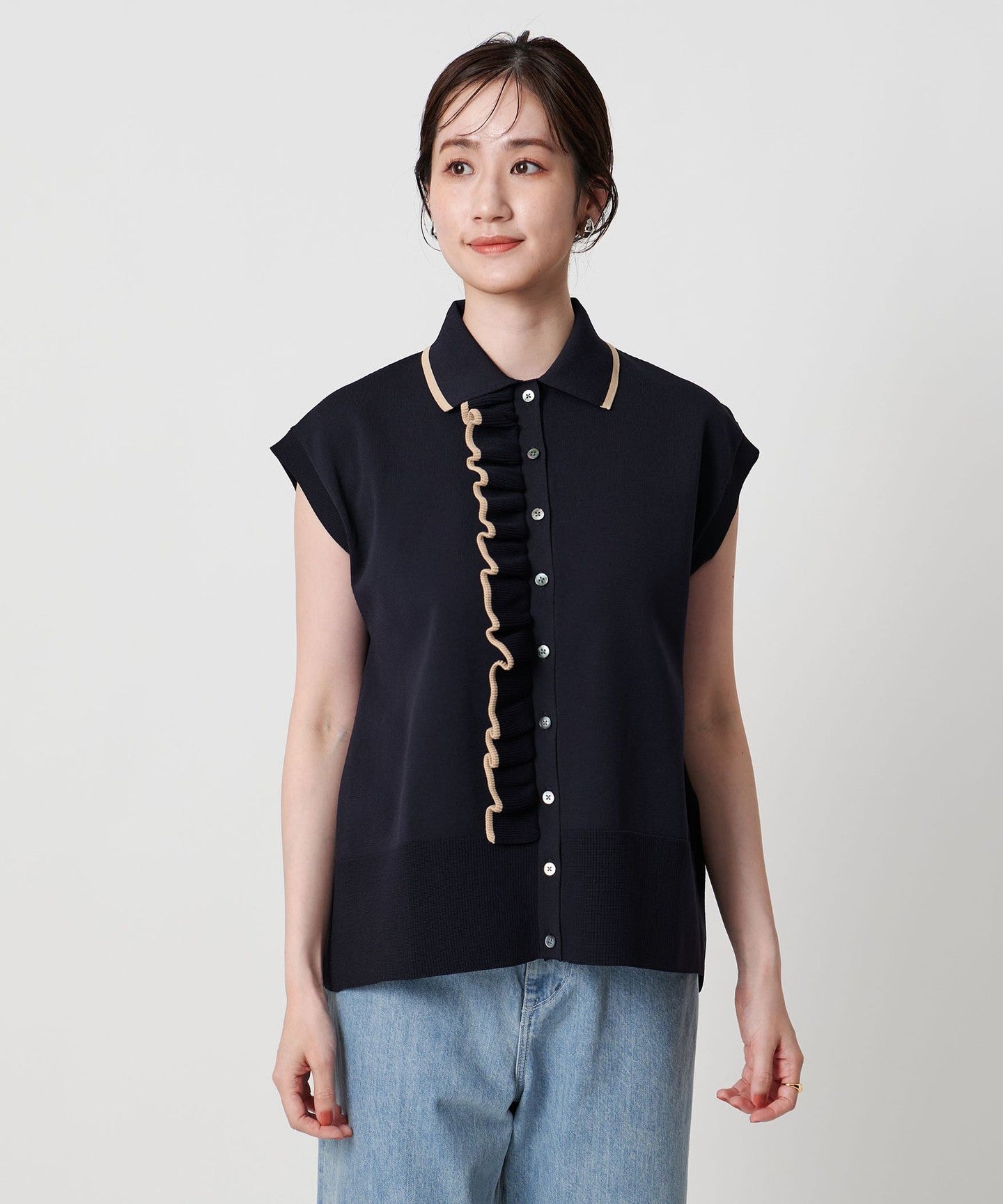 A polo collar knit with an impressive one-sided ruffle detail on the front.