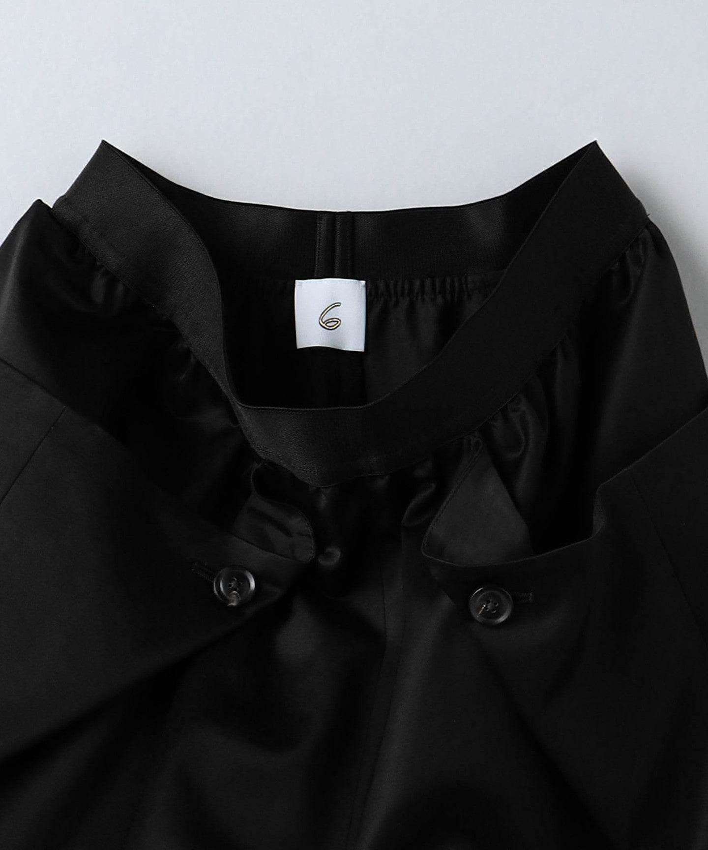 Glossy FABRIC A dress-like outfit using PANTS .