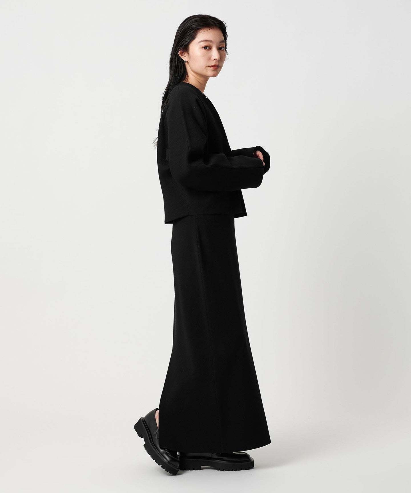 We also recommend wearing it as a set with a skirt made of the same material.