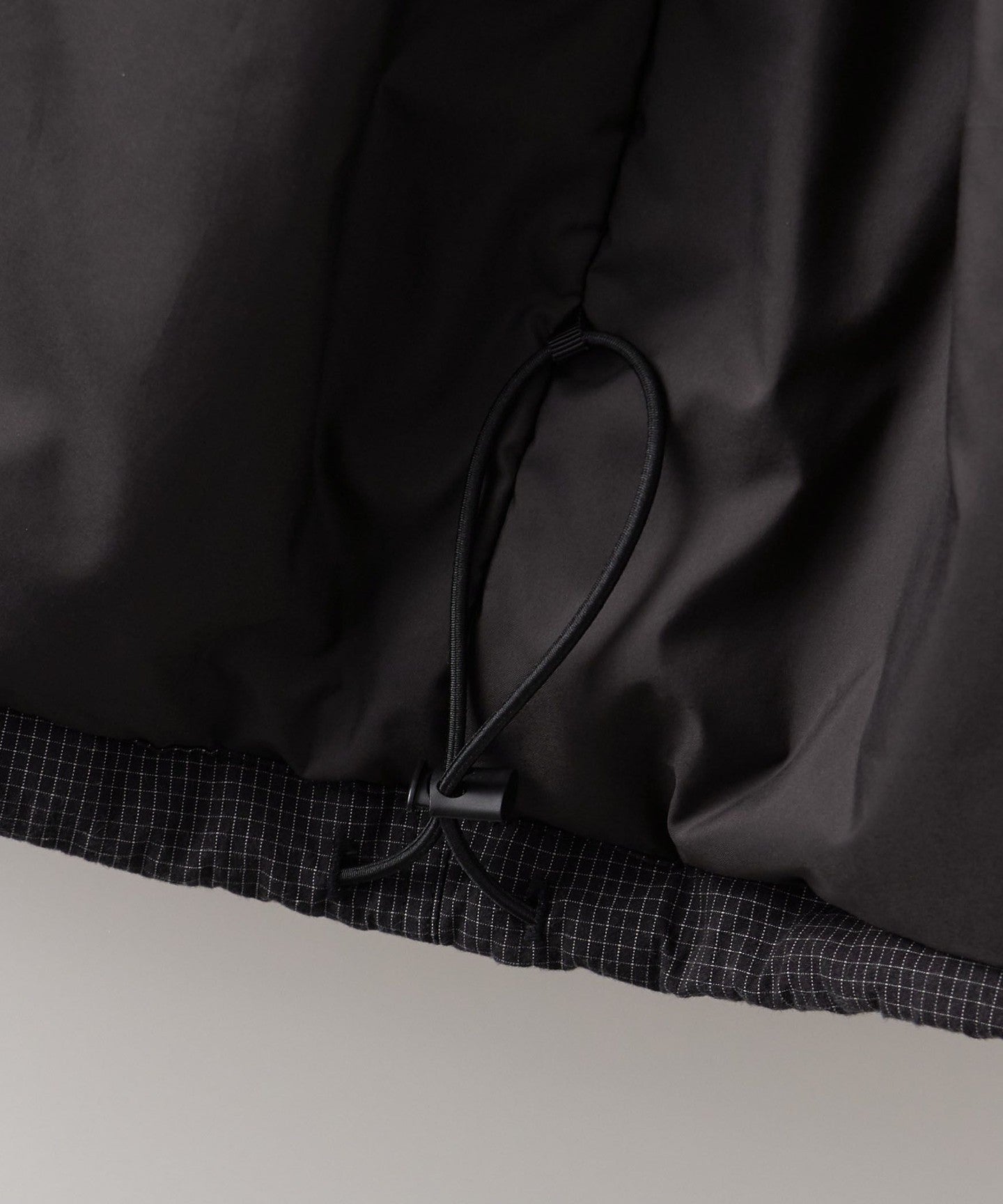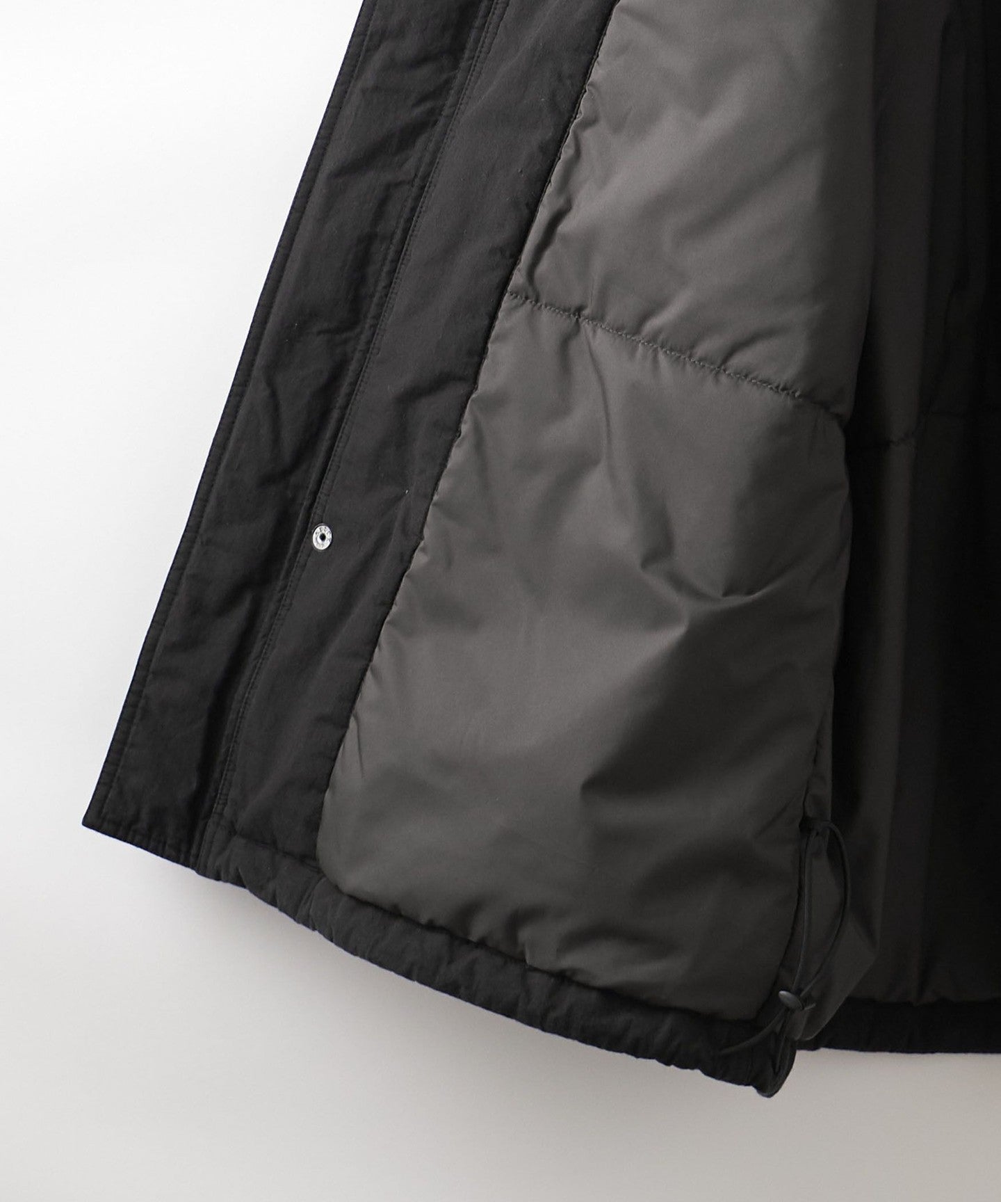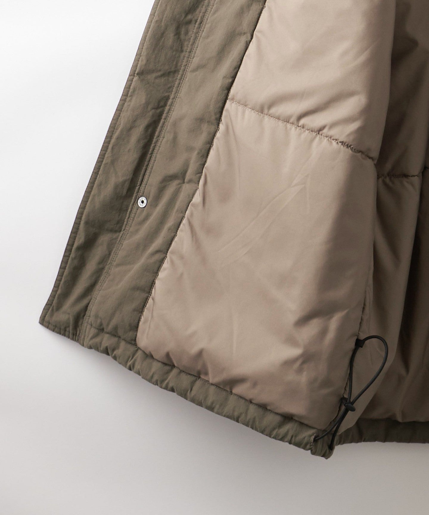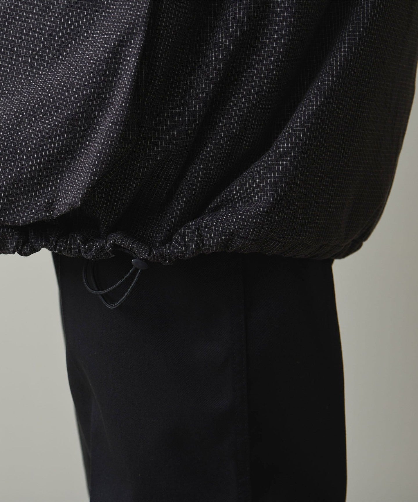 The silhouette can be adjusted using the snap buttons on the cuffs and the drawstring at the hem.