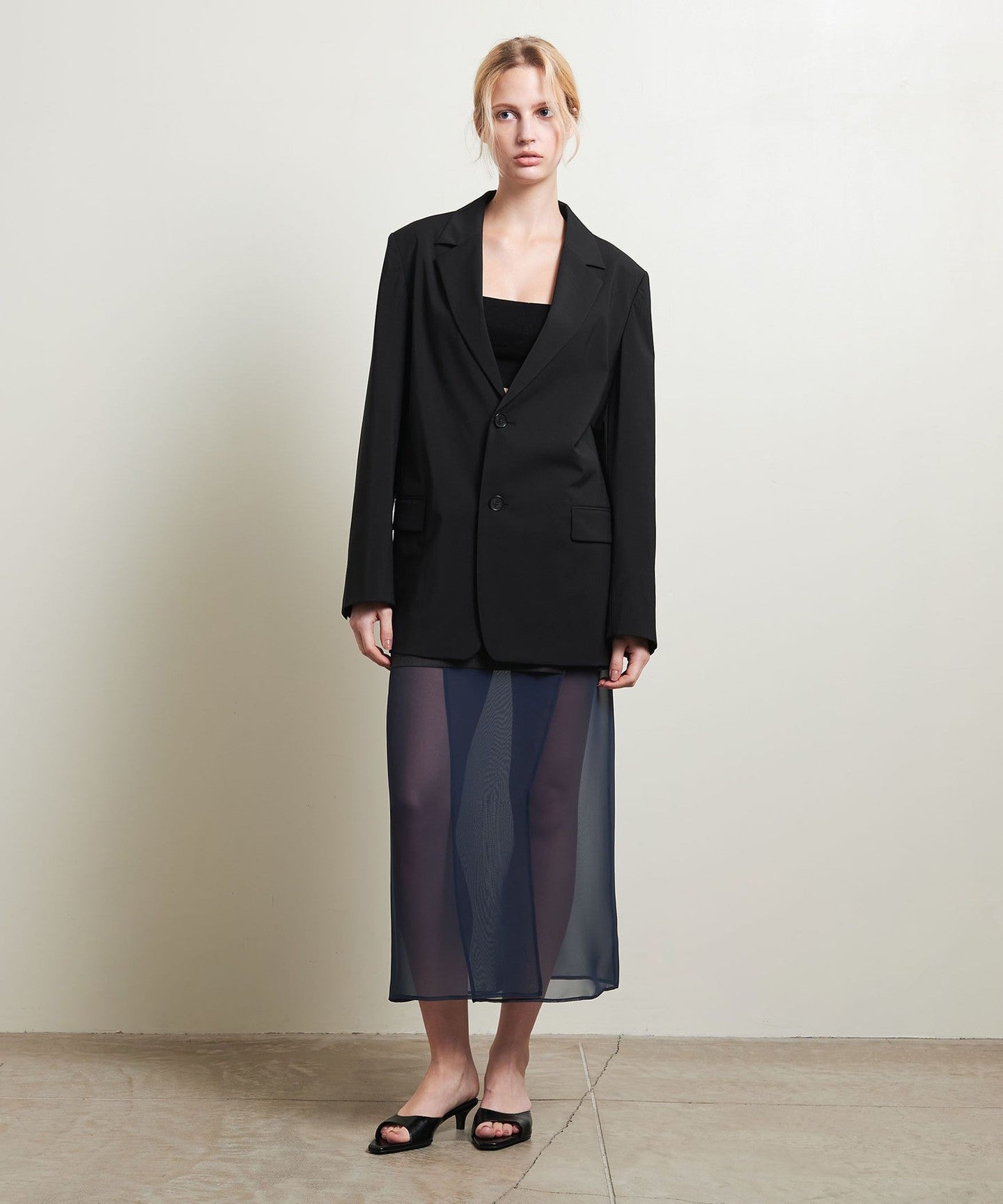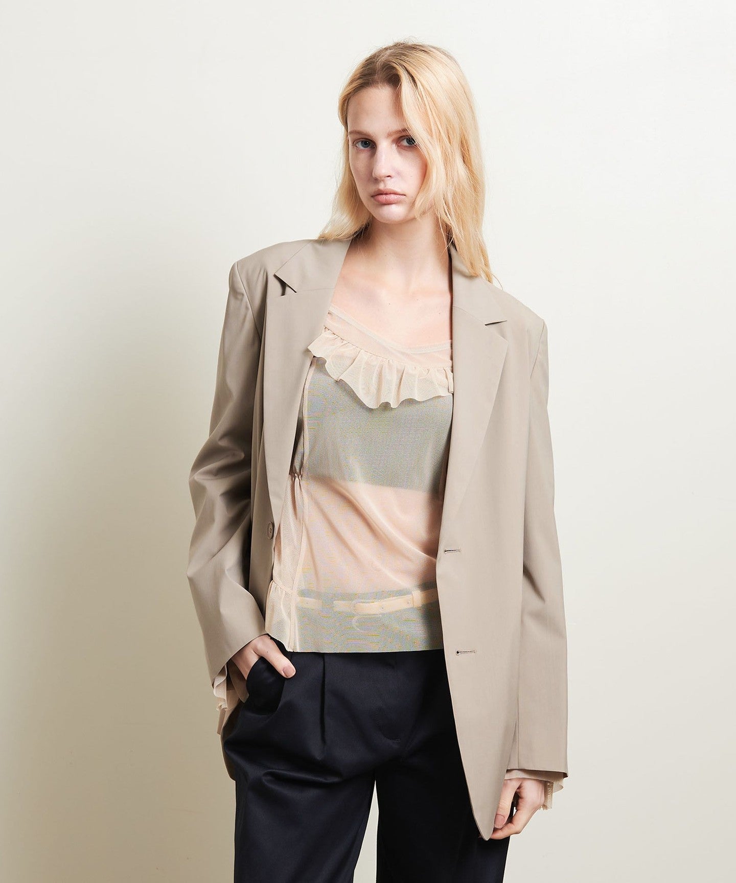 The shoulders are well-constructed and the boxy silhouette creates a relaxed mood.