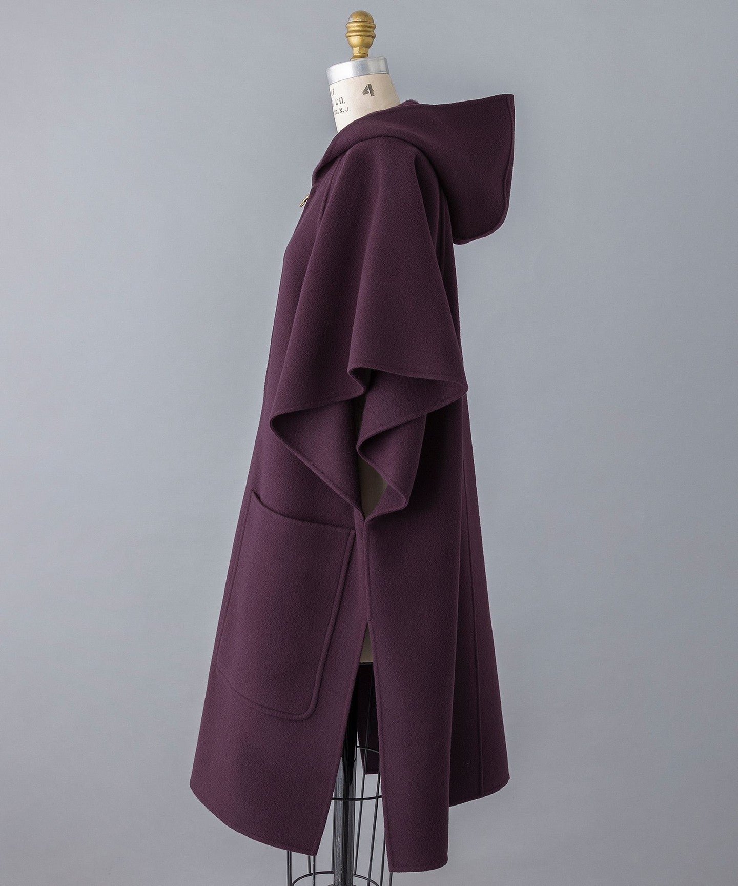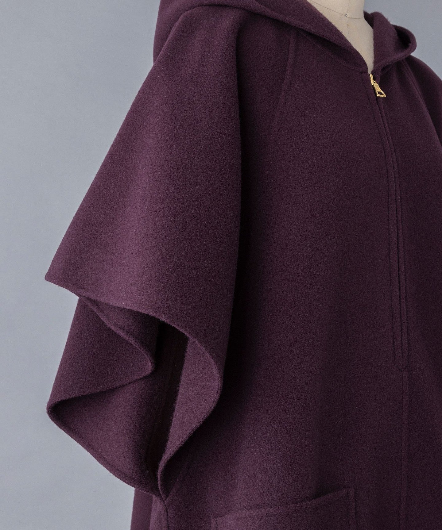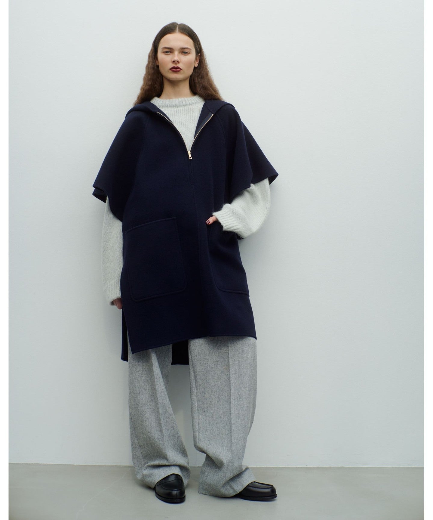 A poncho-style coat with a front zipper that allows for a wide range of coordination options.