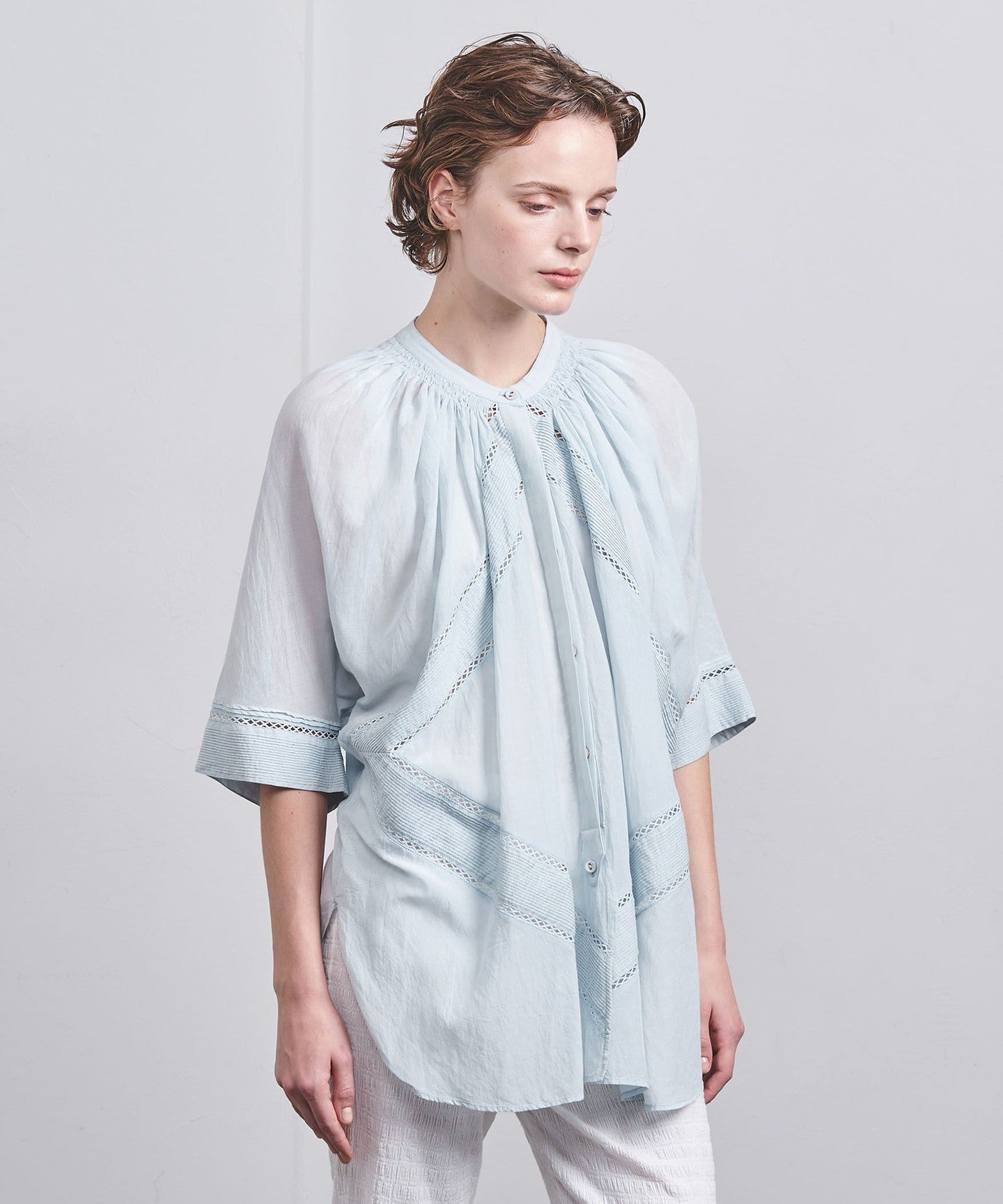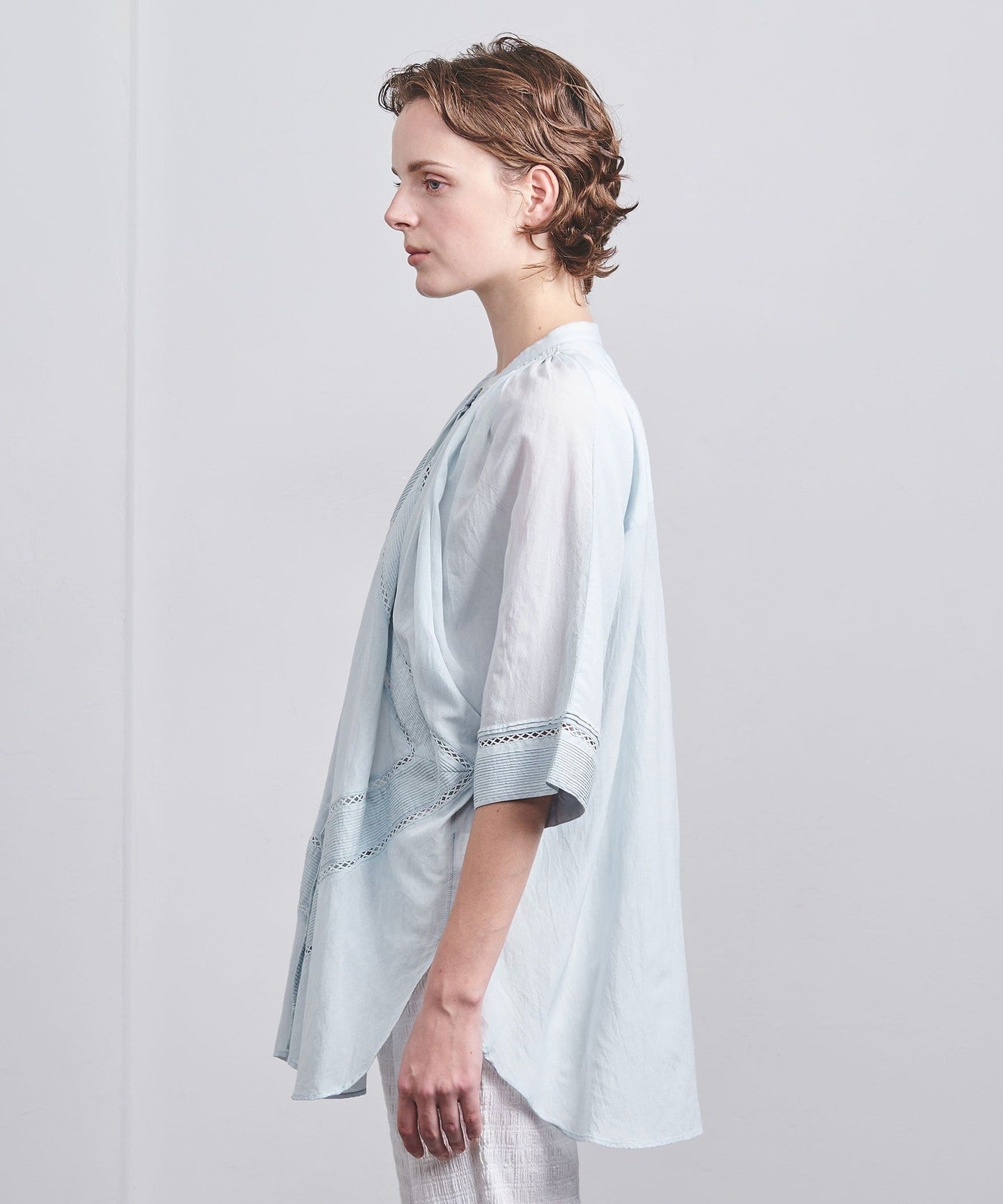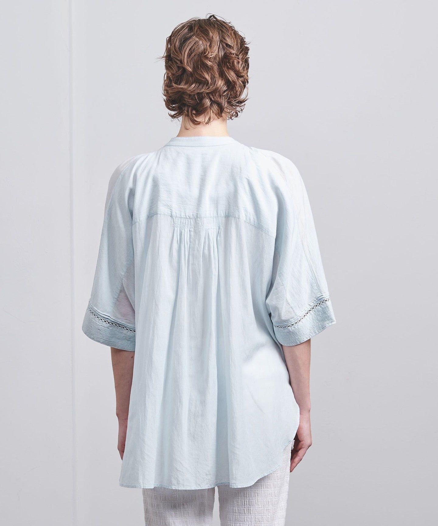 Taking advantage of the voile material, we created volume around the neck by manually gathering and tucking it.