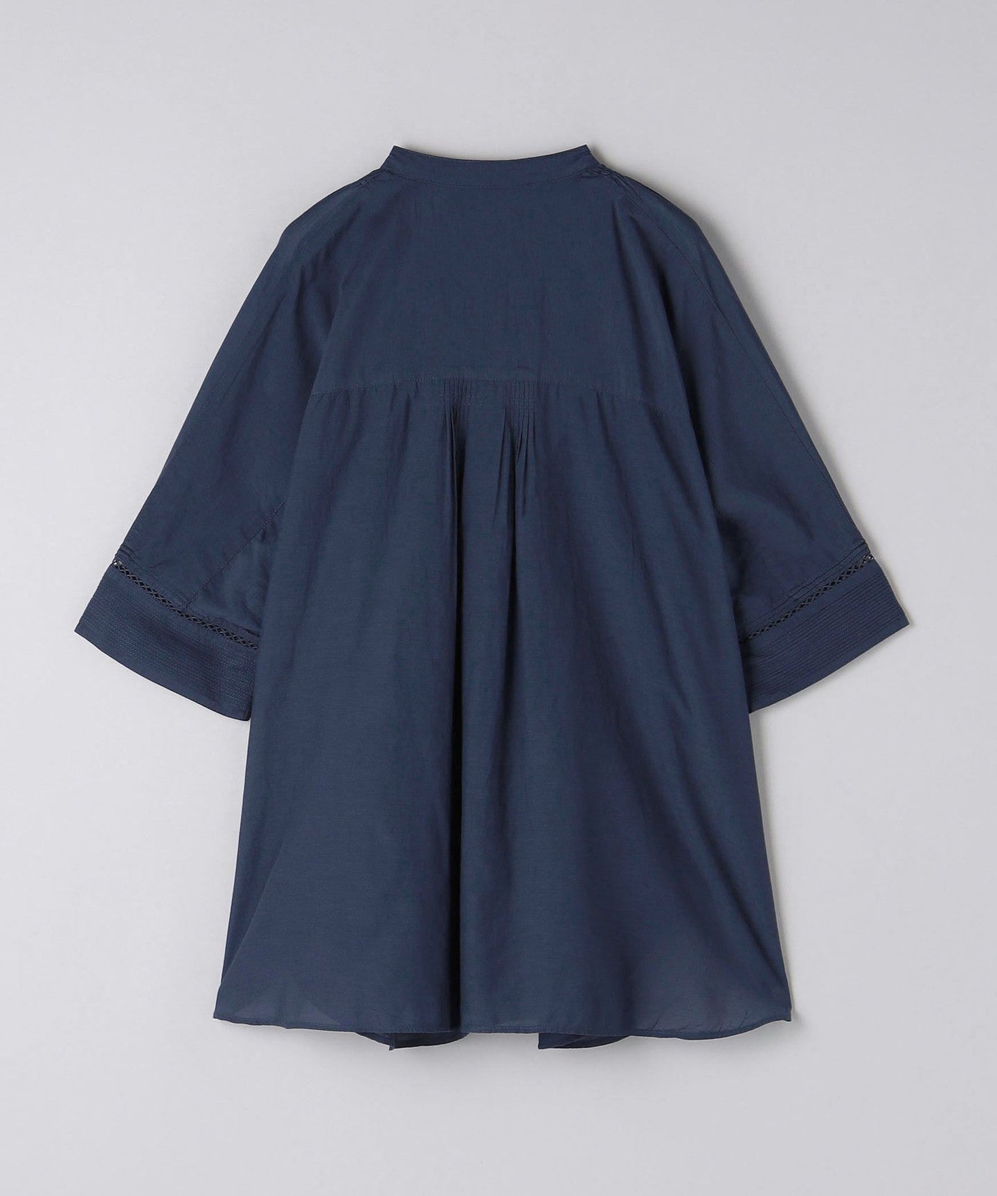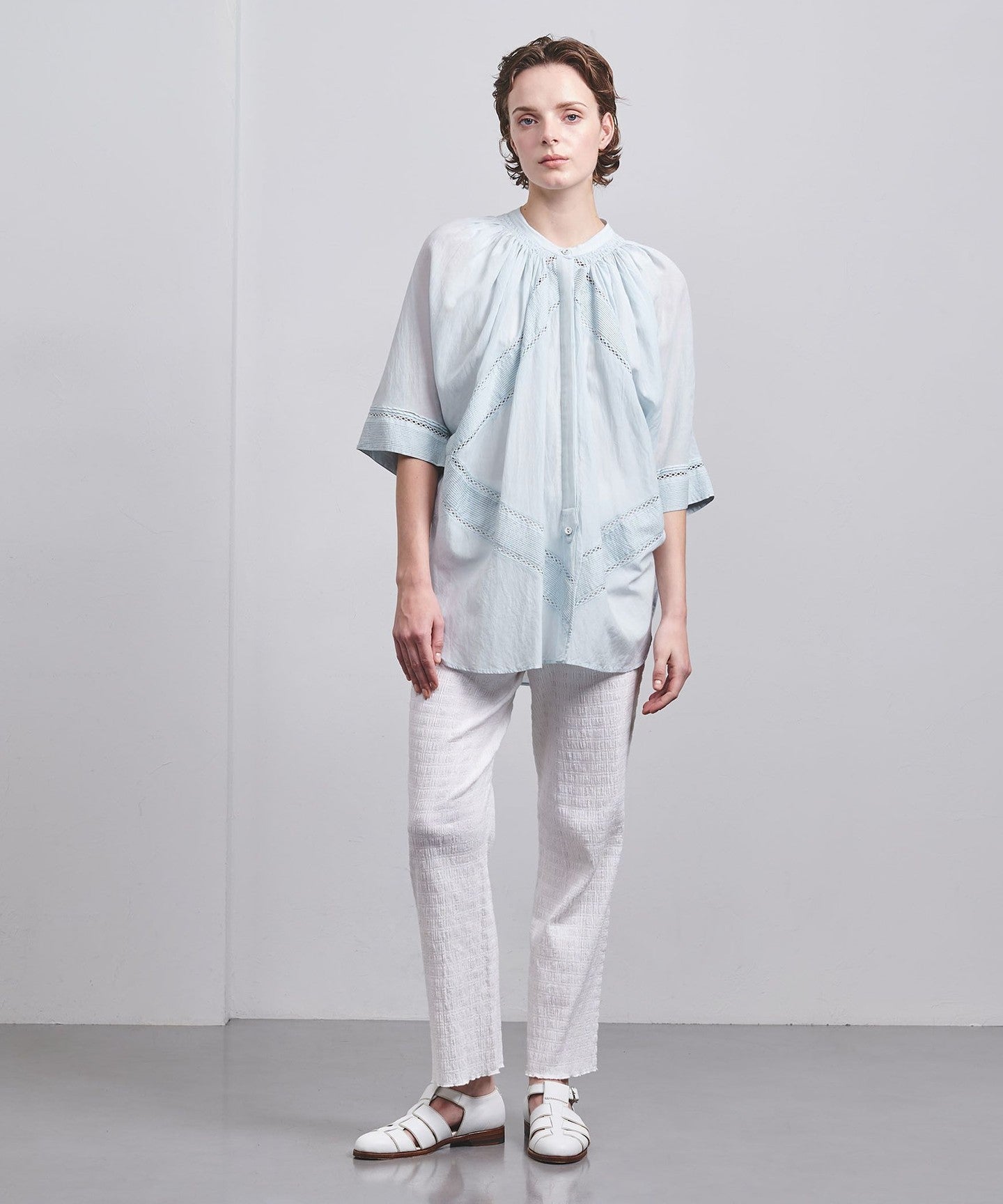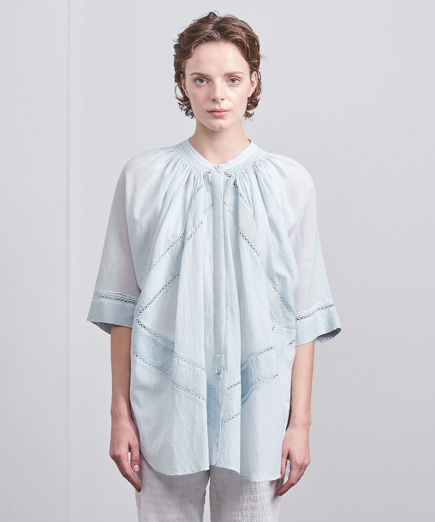 Taking advantage of the voile material, we created volume around the neck by manually gathering and tucking it.