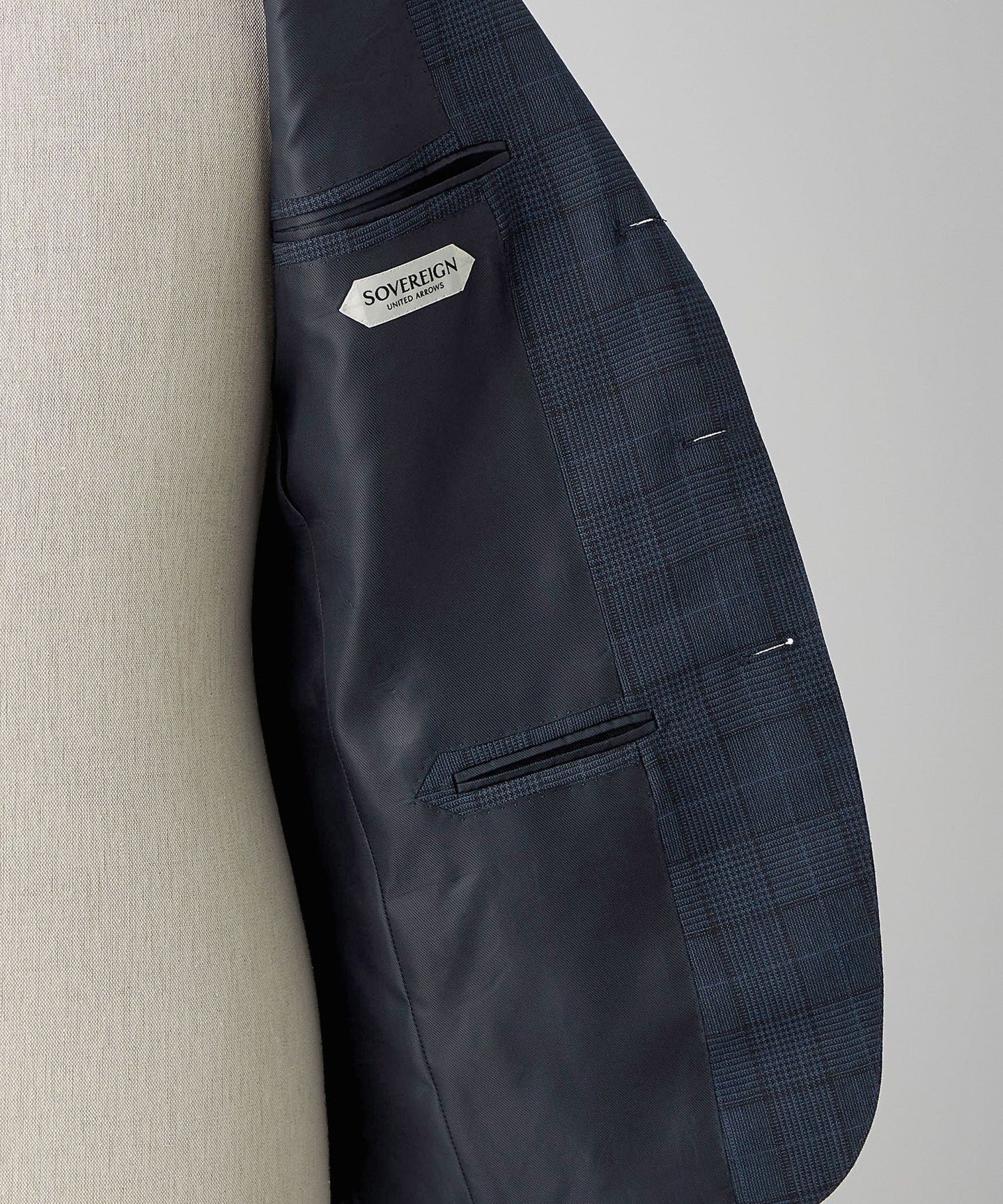 The tailored jacket has three single buttons, a notched lapel, and a moderately open V-zone, giving it a clean look.
