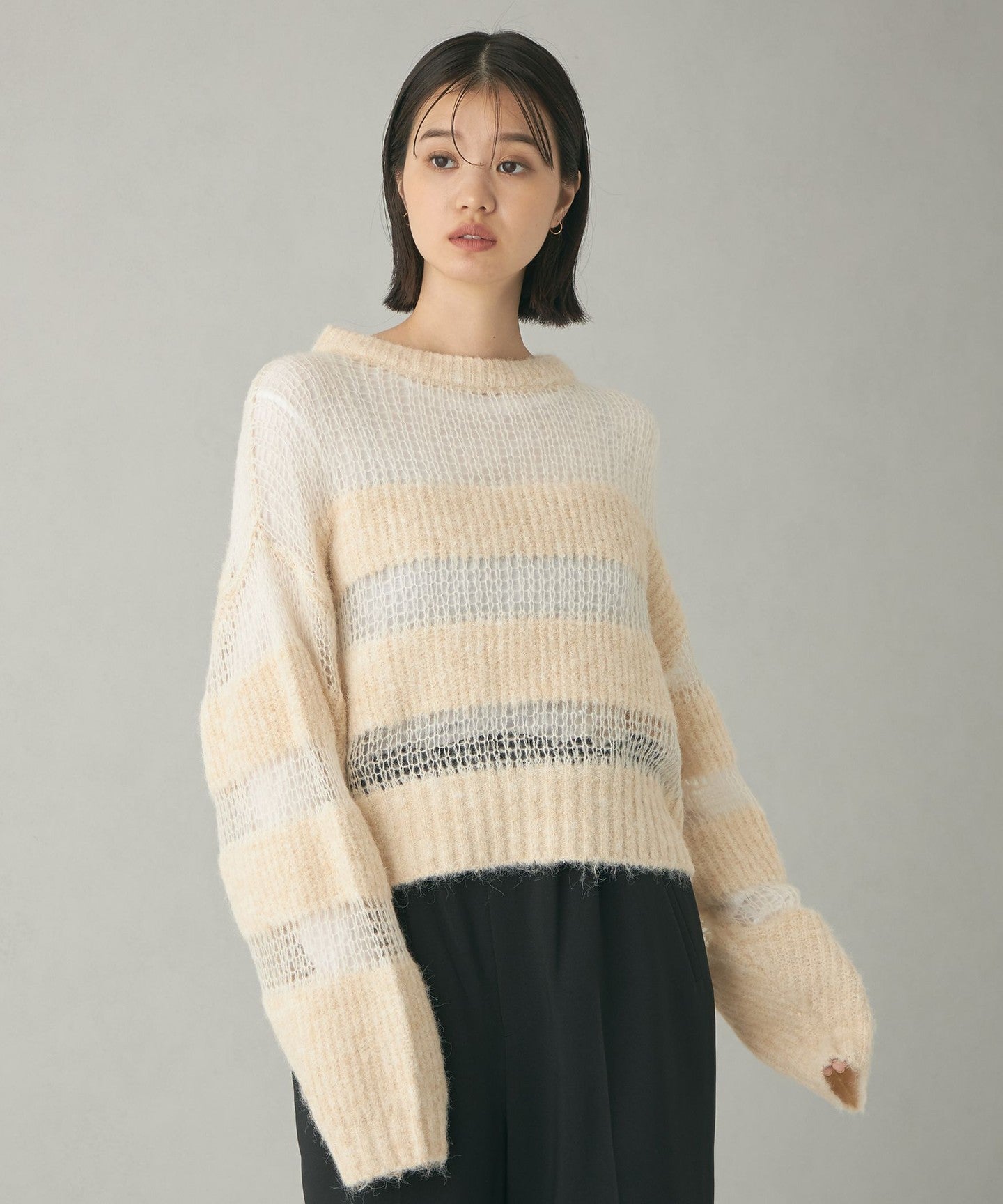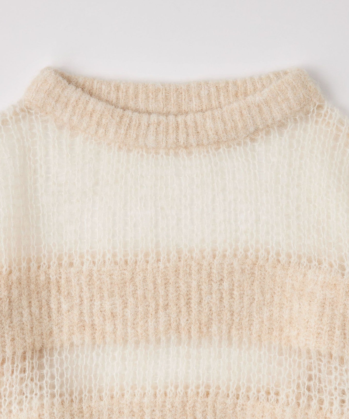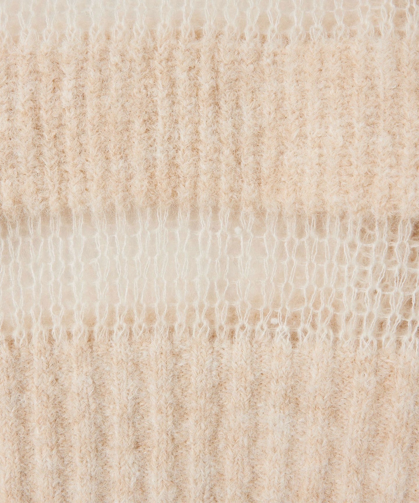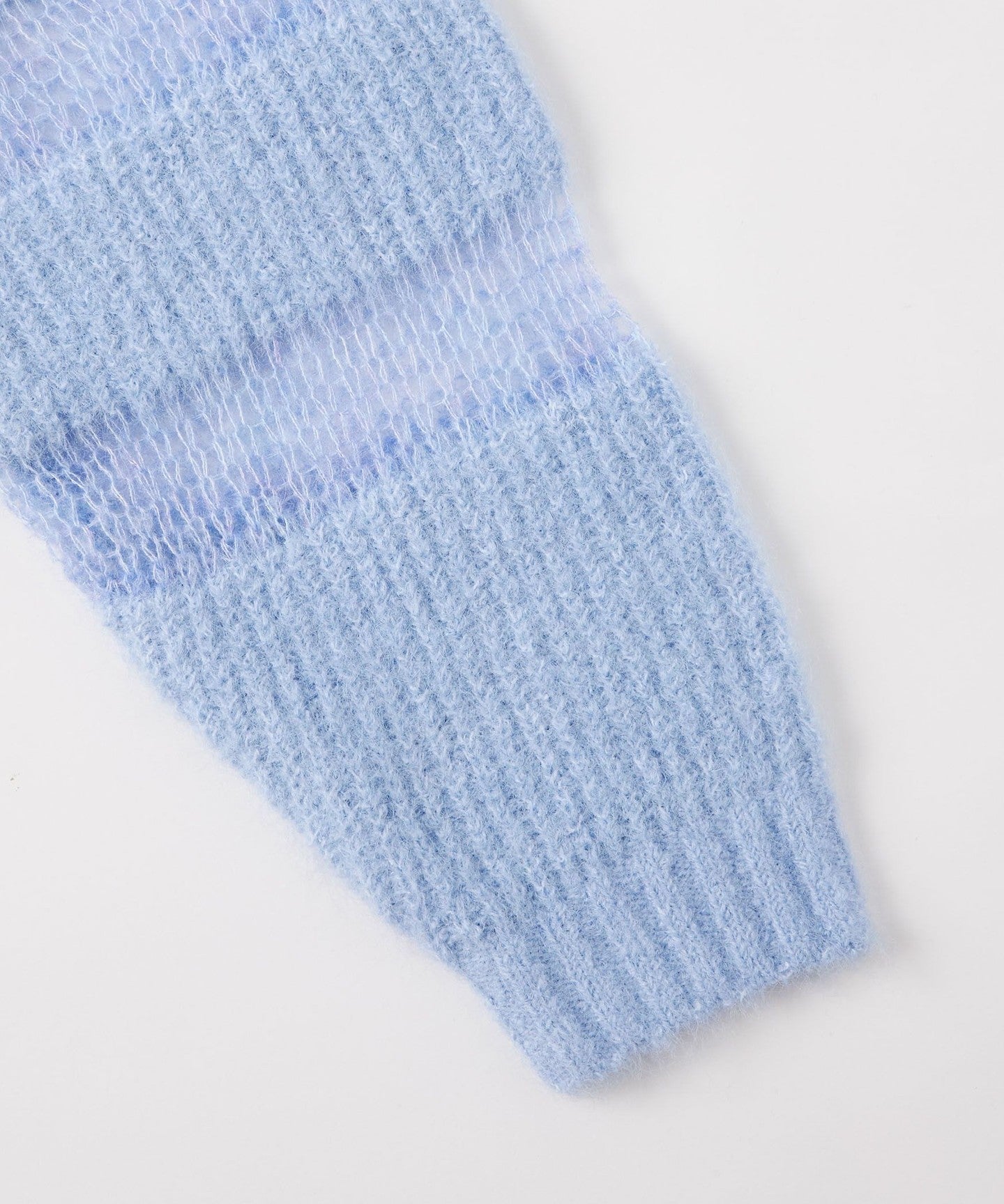 A one-tone border that combines a sheer knit fabric made from fluffy, long yarn with a thick, ribbed knit fabric.