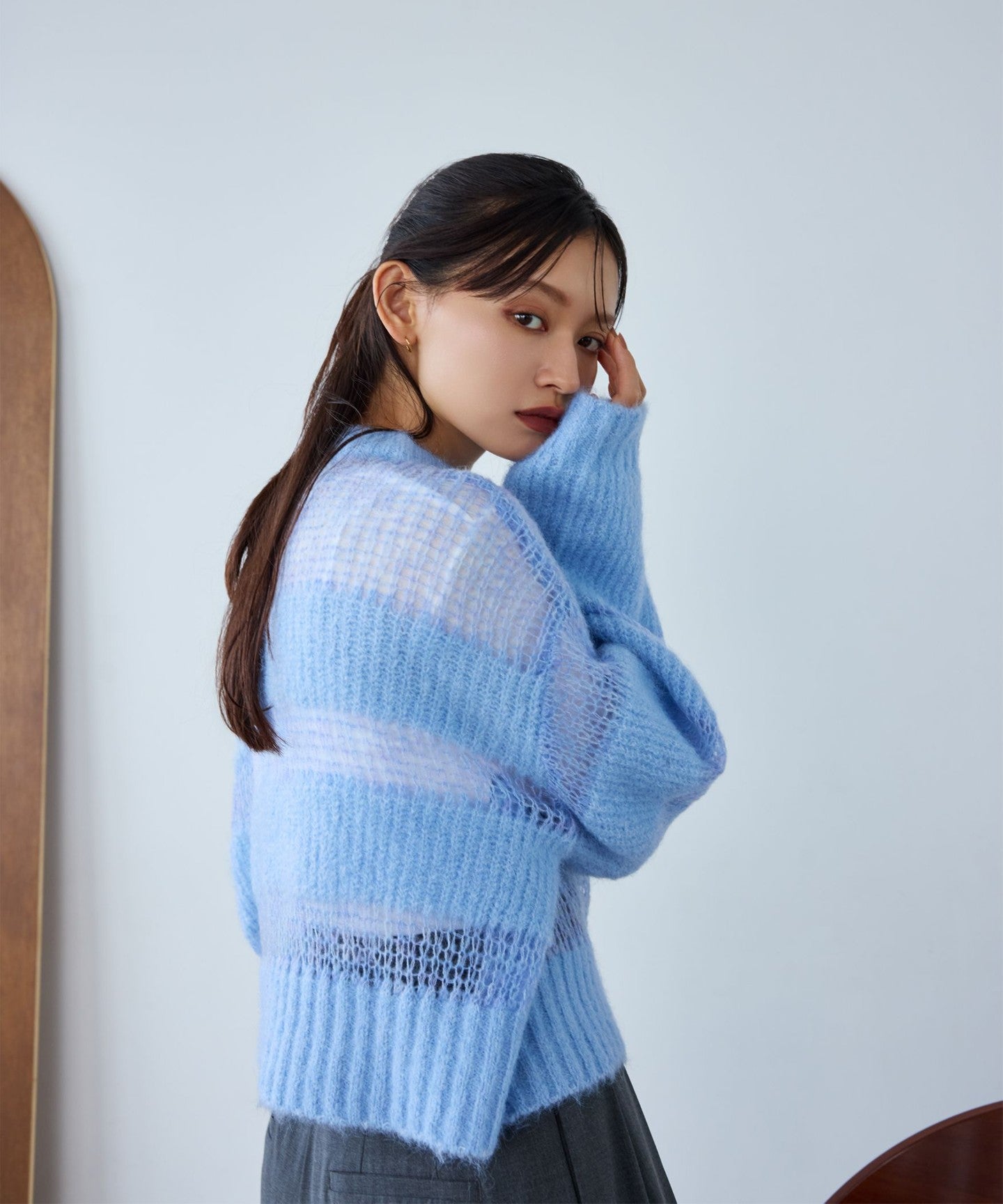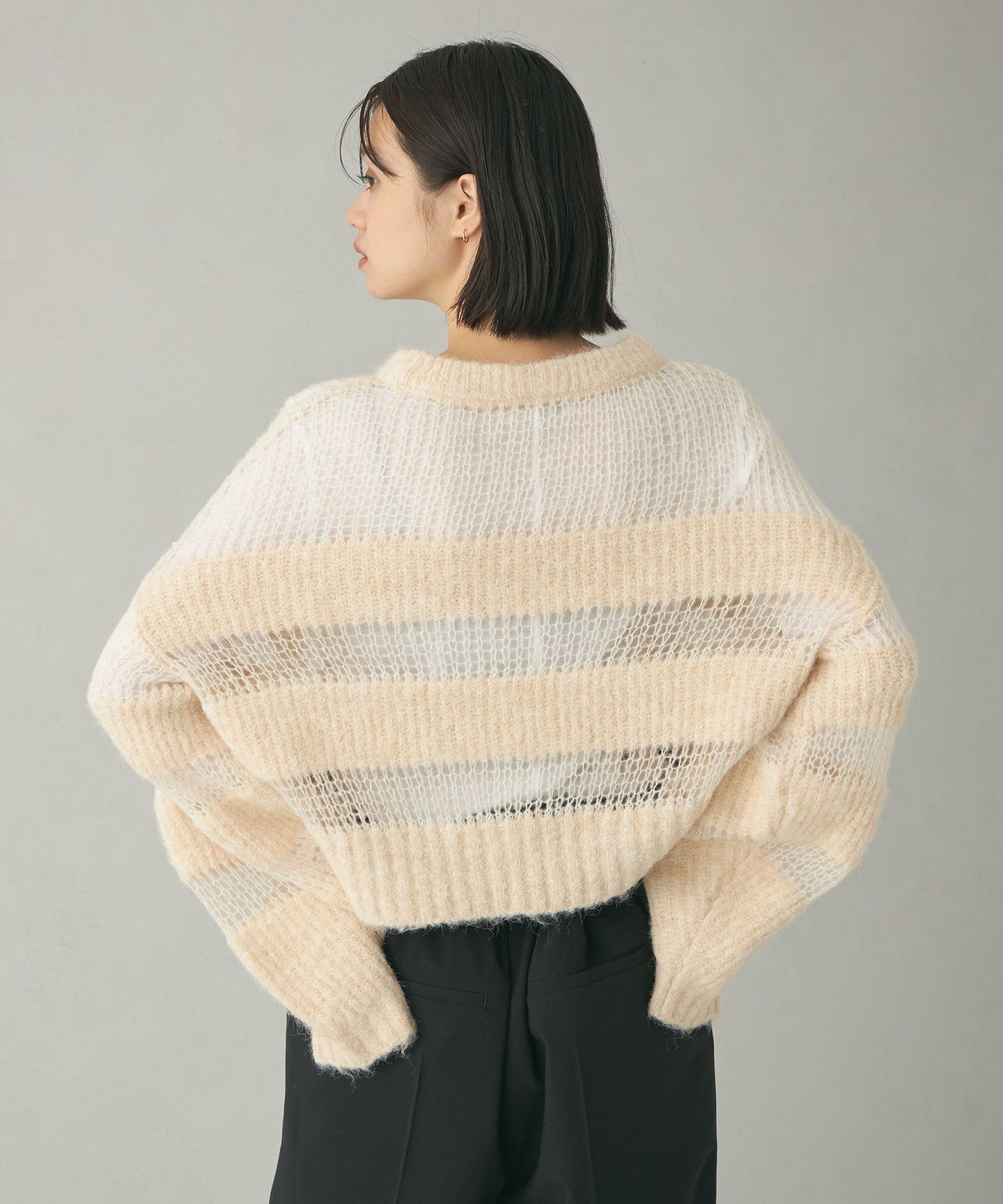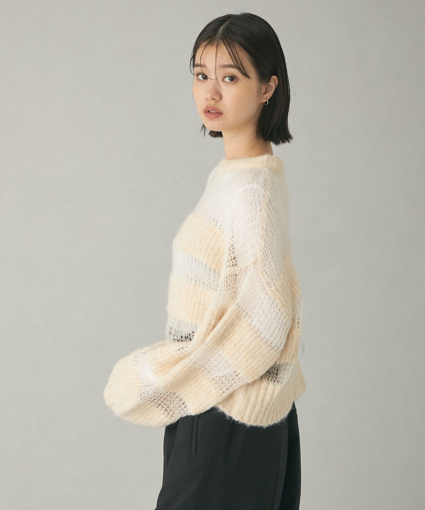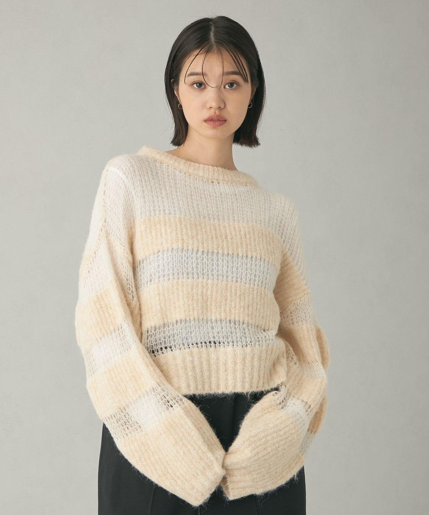 A one-tone border that combines a sheer knit fabric made from fluffy, long yarn with a thick, ribbed knit fabric.