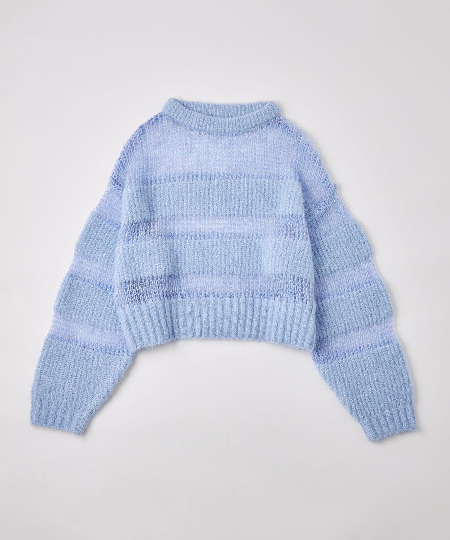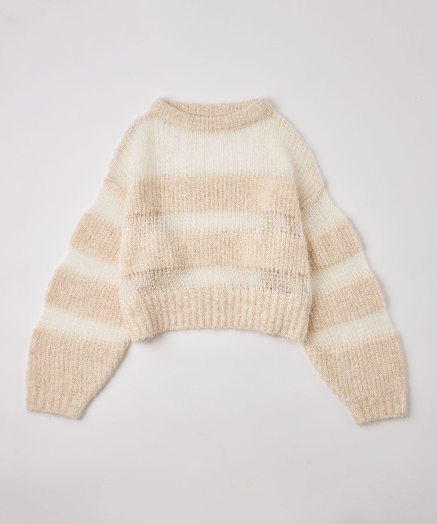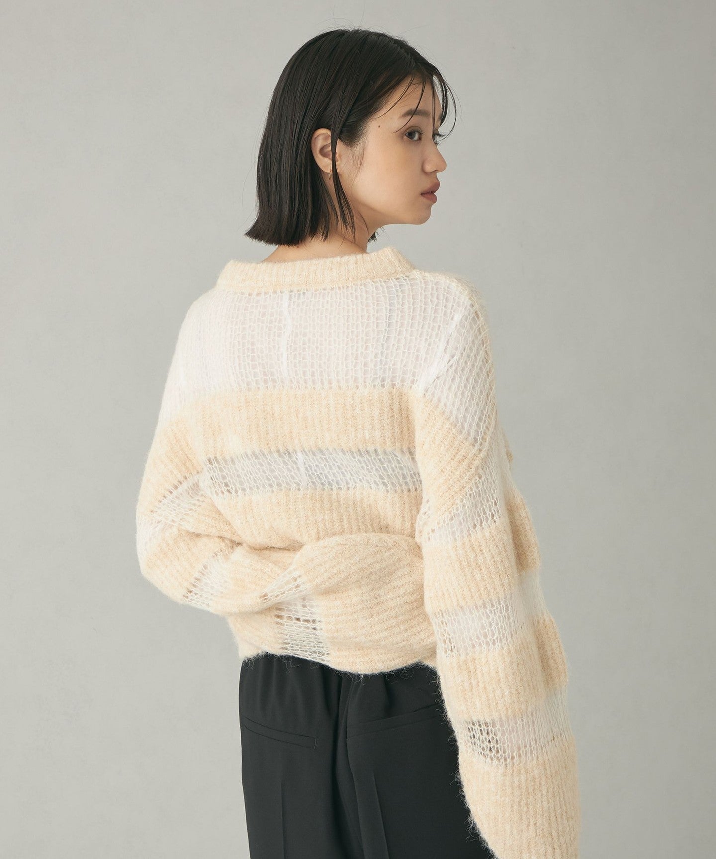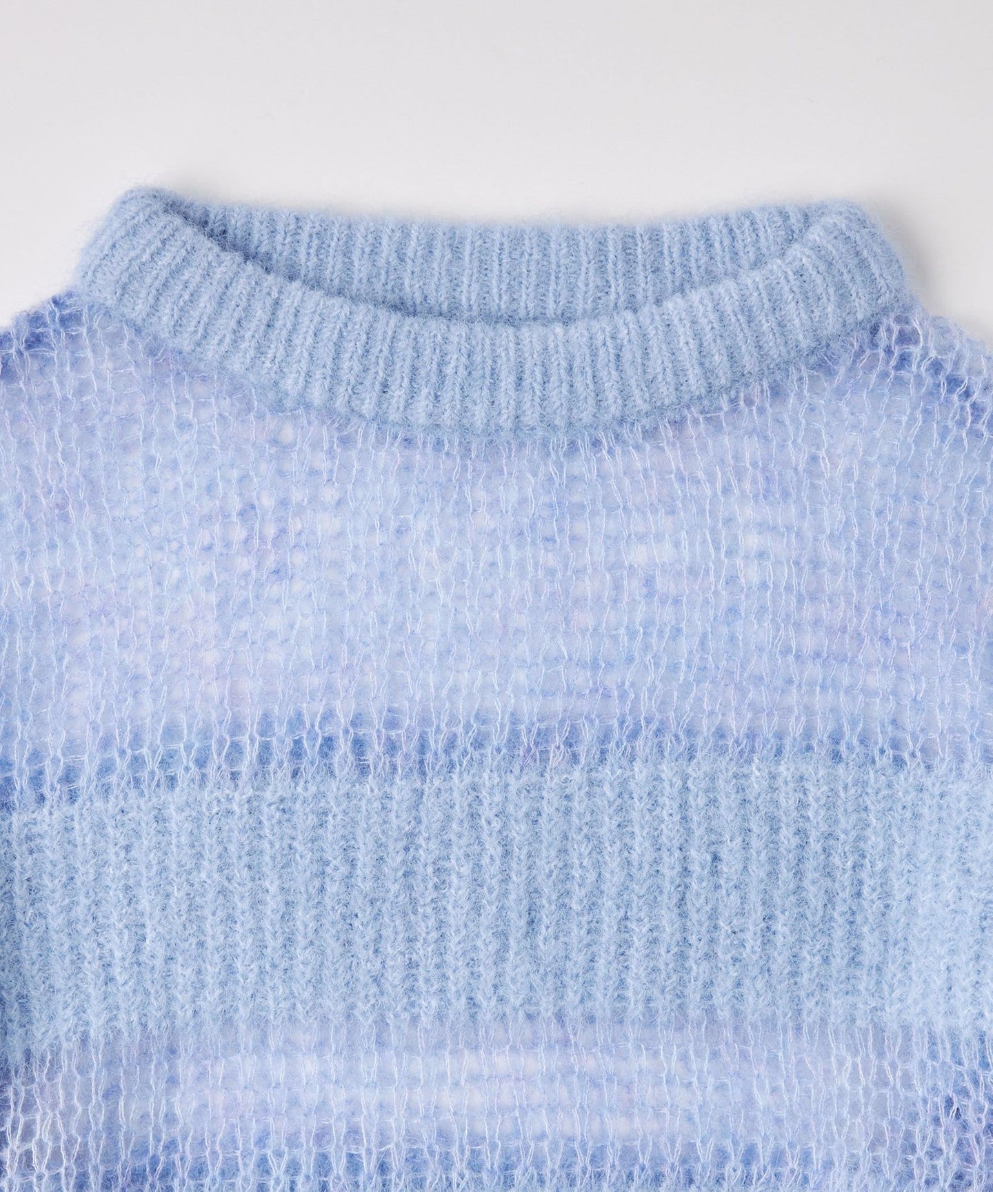 A one-tone border that combines a sheer knit fabric made from fluffy, long yarn with a thick, ribbed knit fabric.