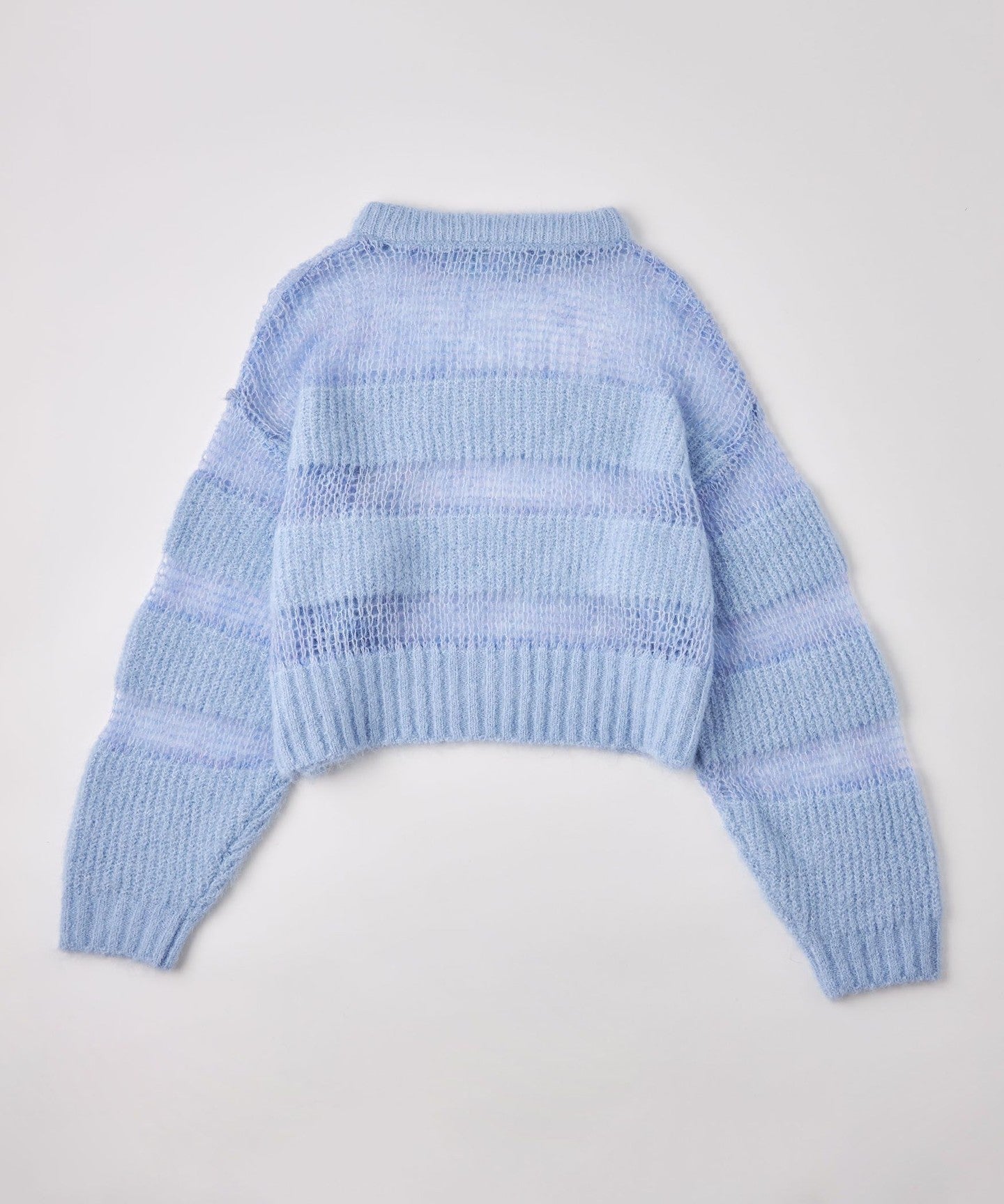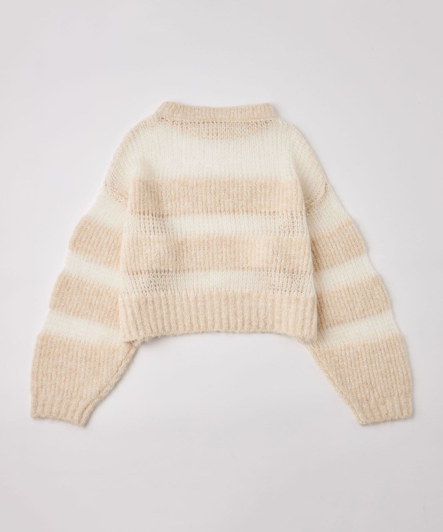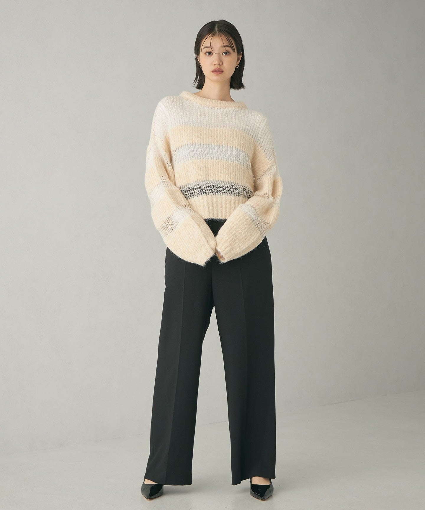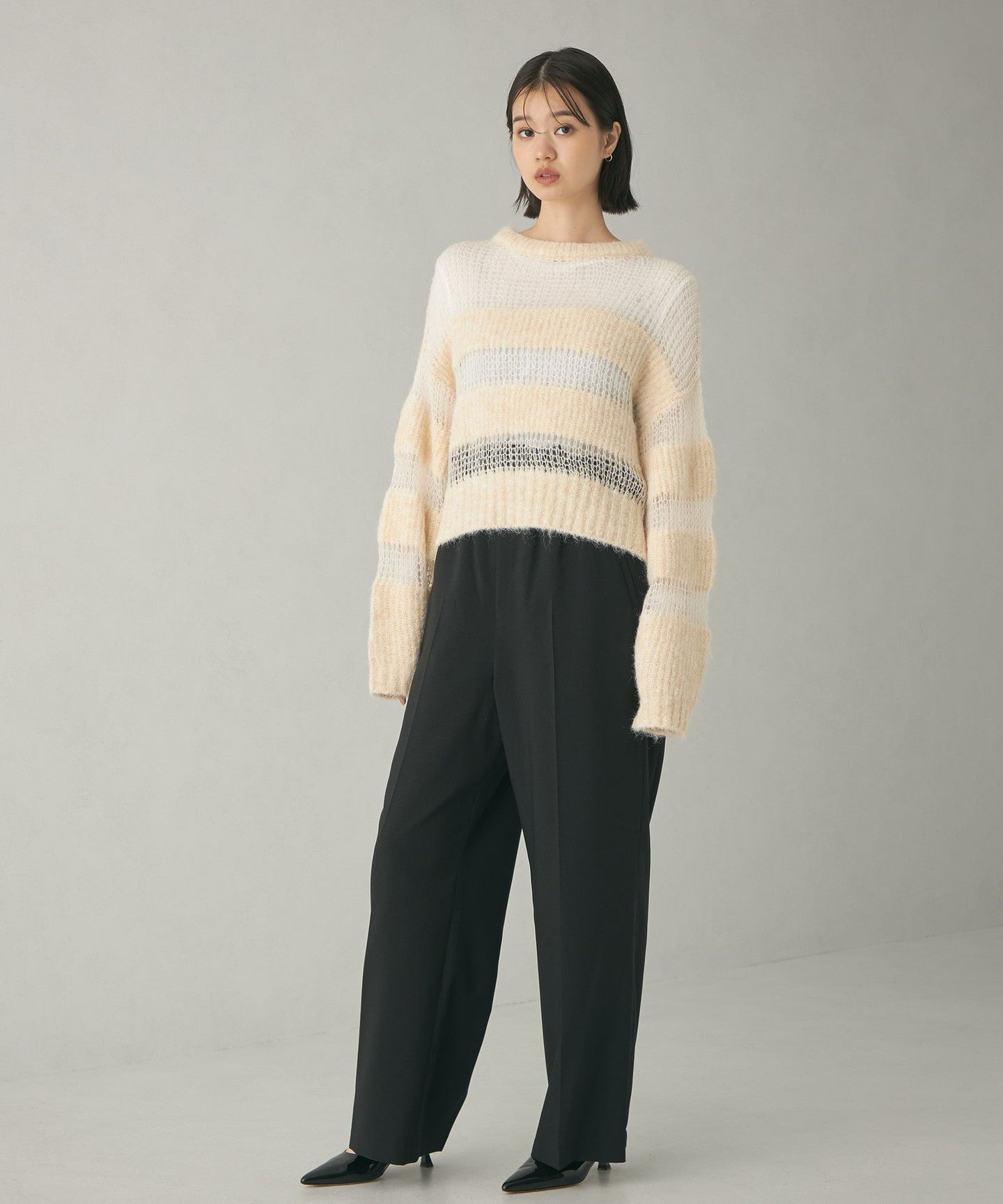 A one-tone border that combines a sheer knit fabric made from fluffy, long yarn with a thick, ribbed knit fabric.