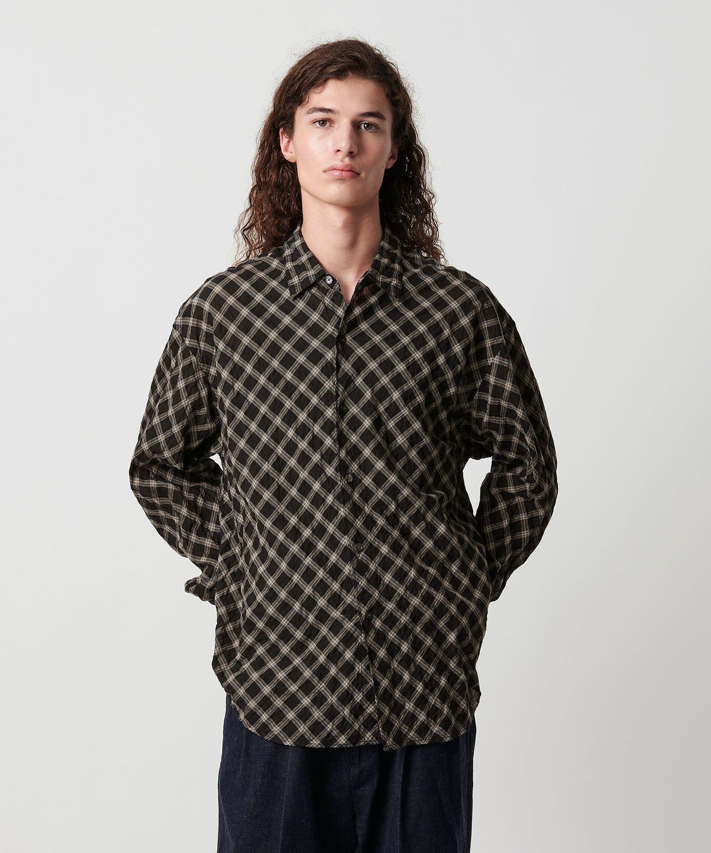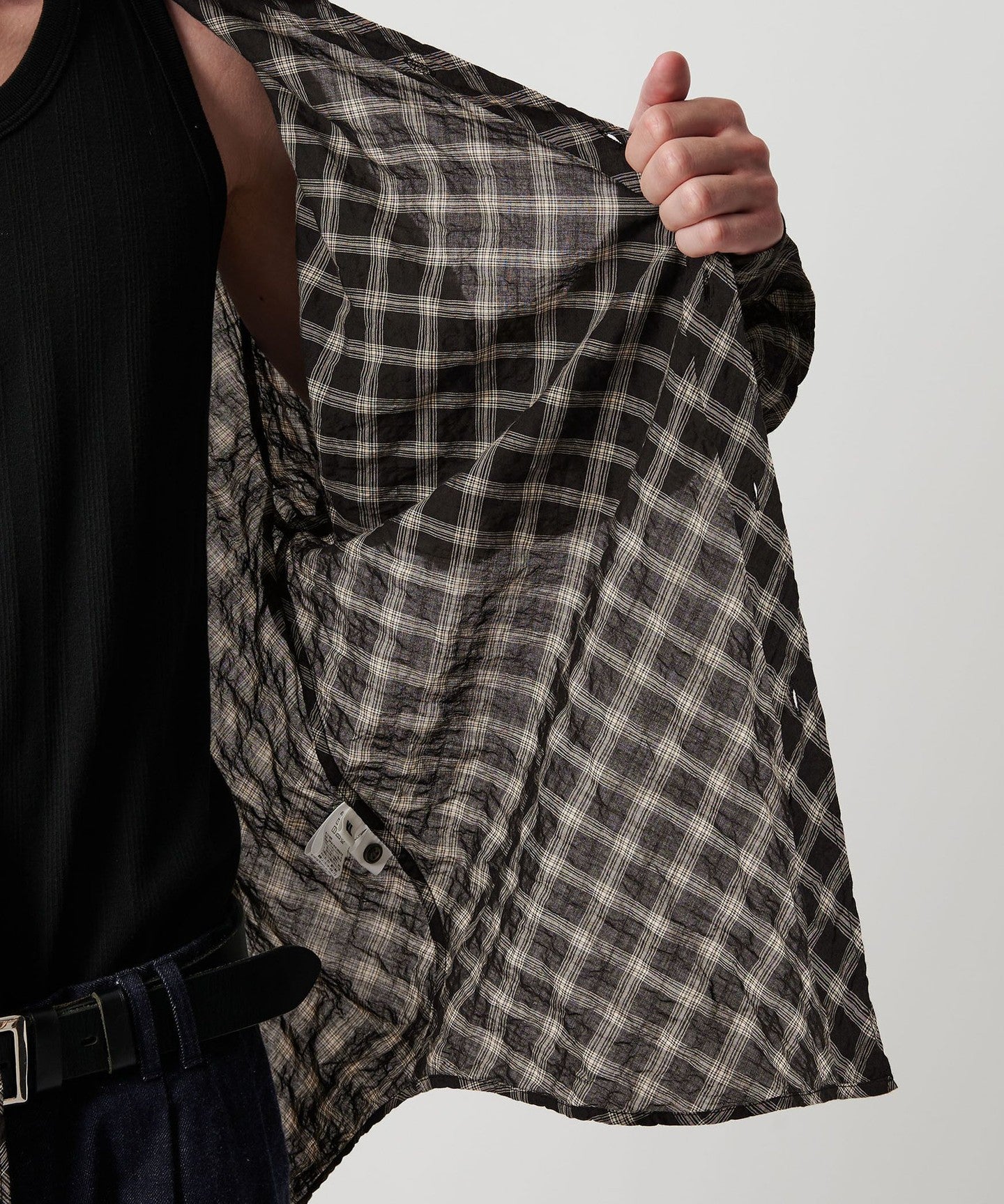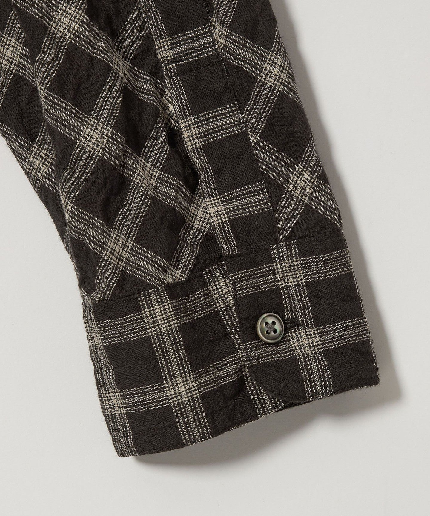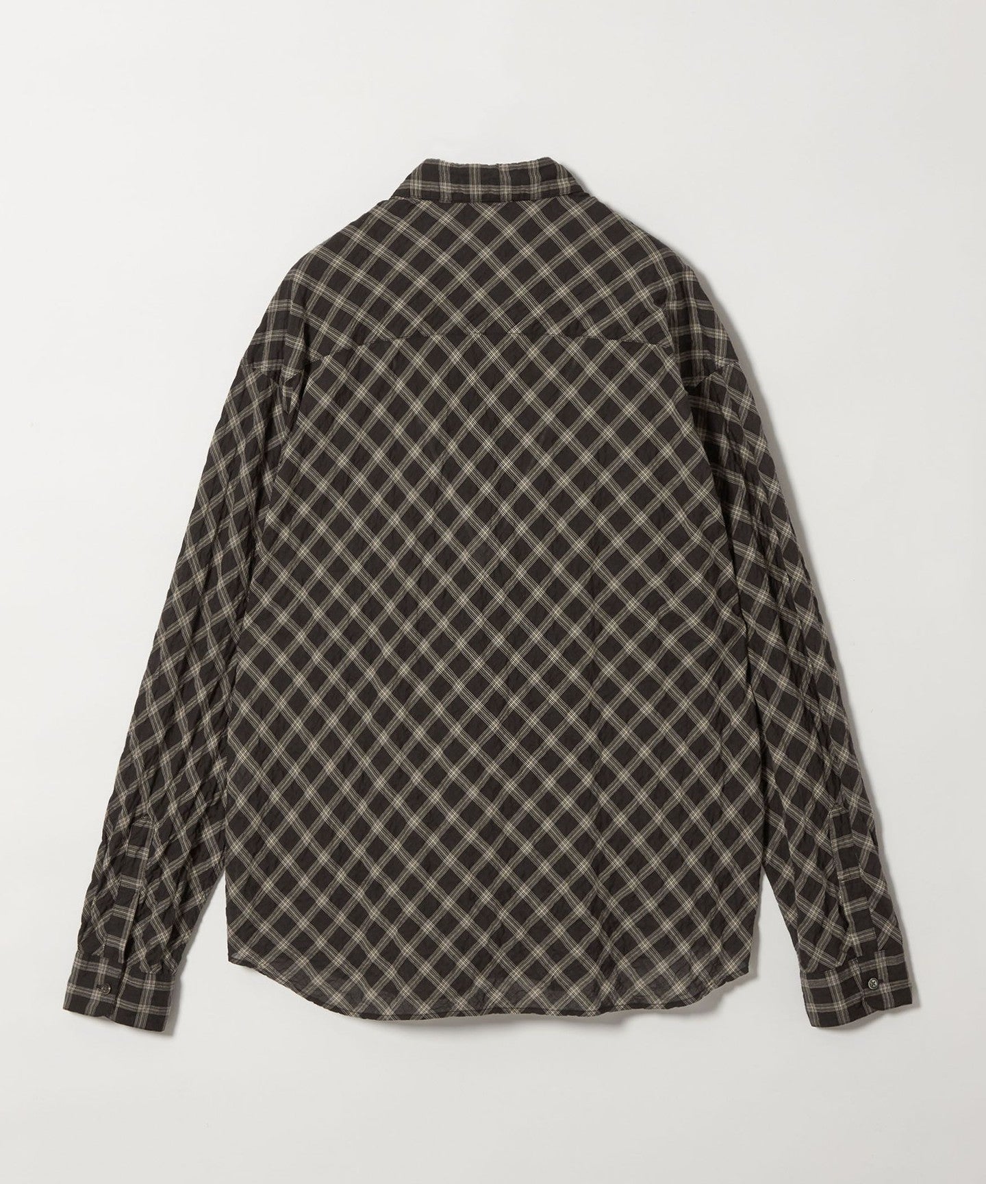 A shirt made from checked material that features a sheer feel and shirring that resembles natural washing wrinkles.