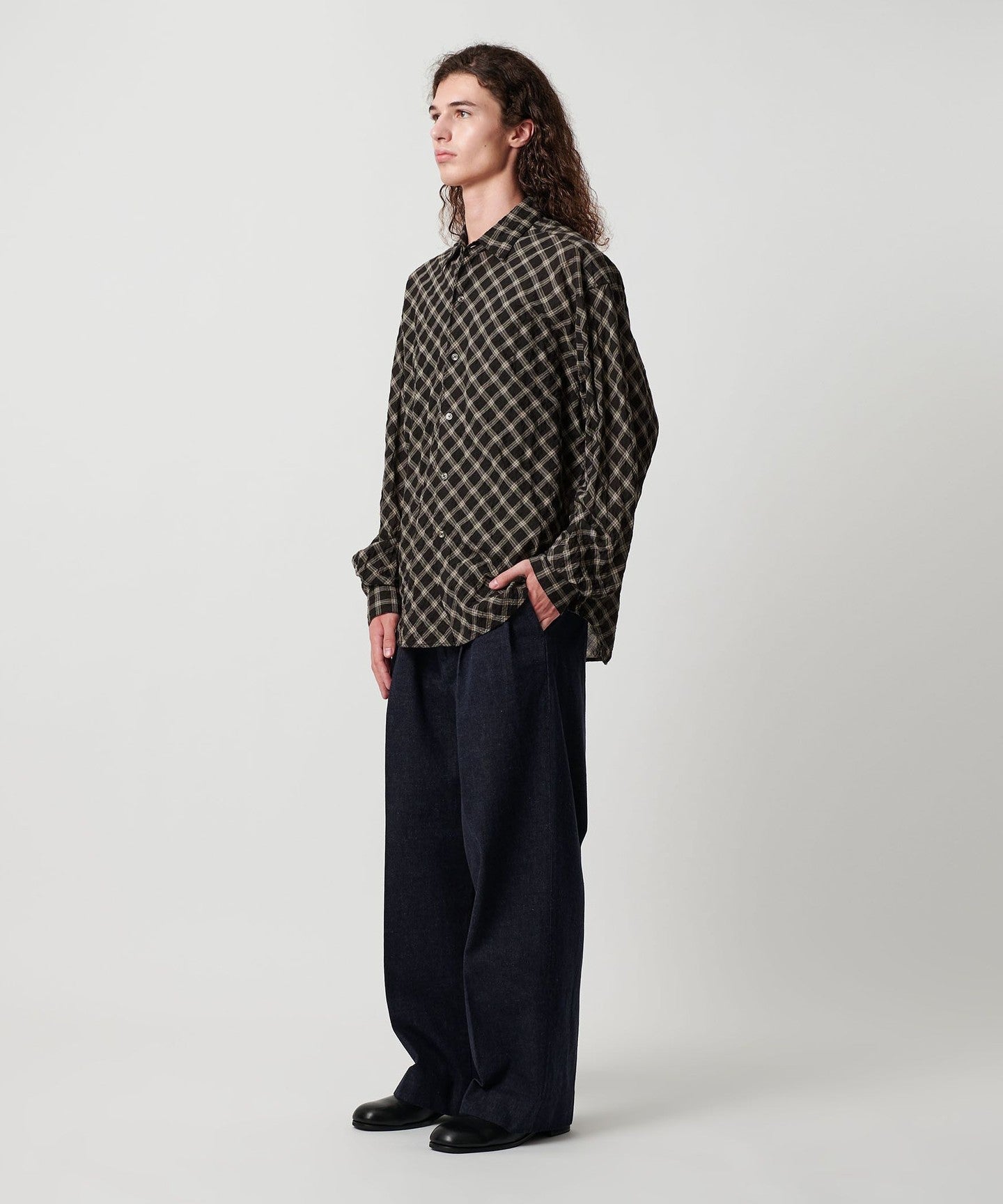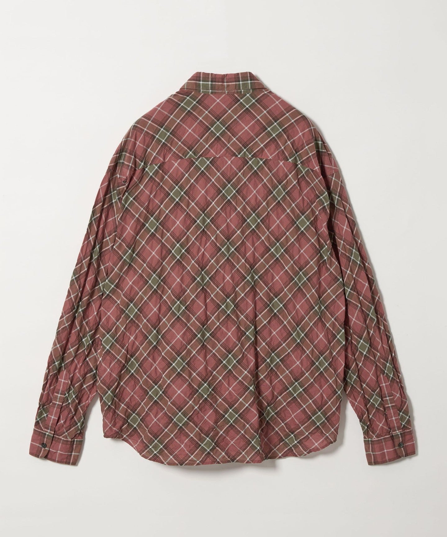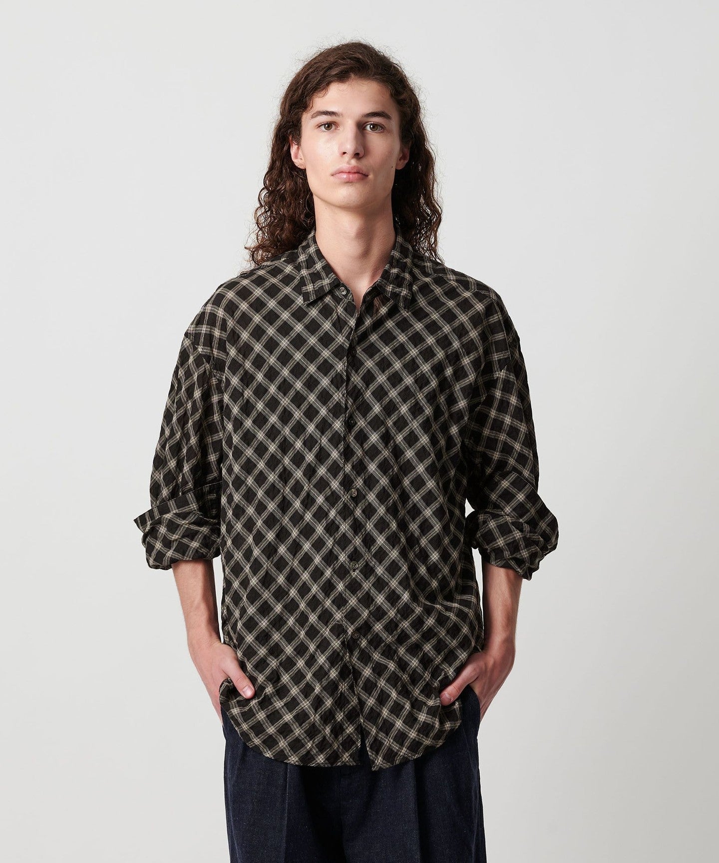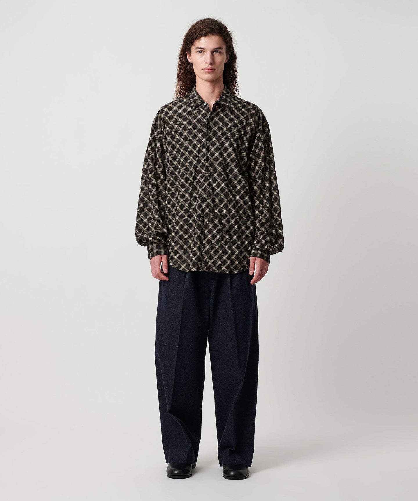 A shirt made from checked material that features a sheer feel and shirring that resembles natural washing wrinkles.