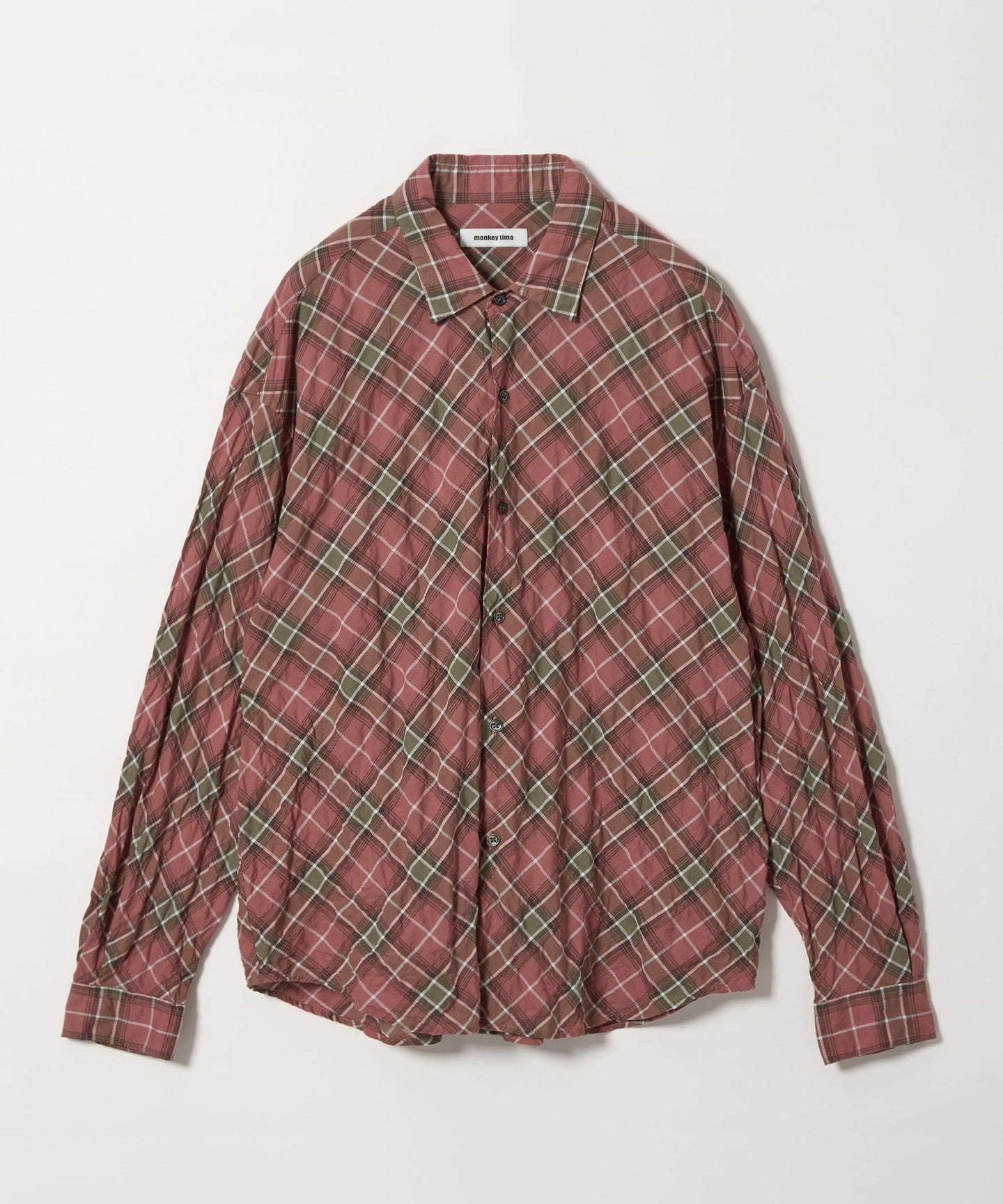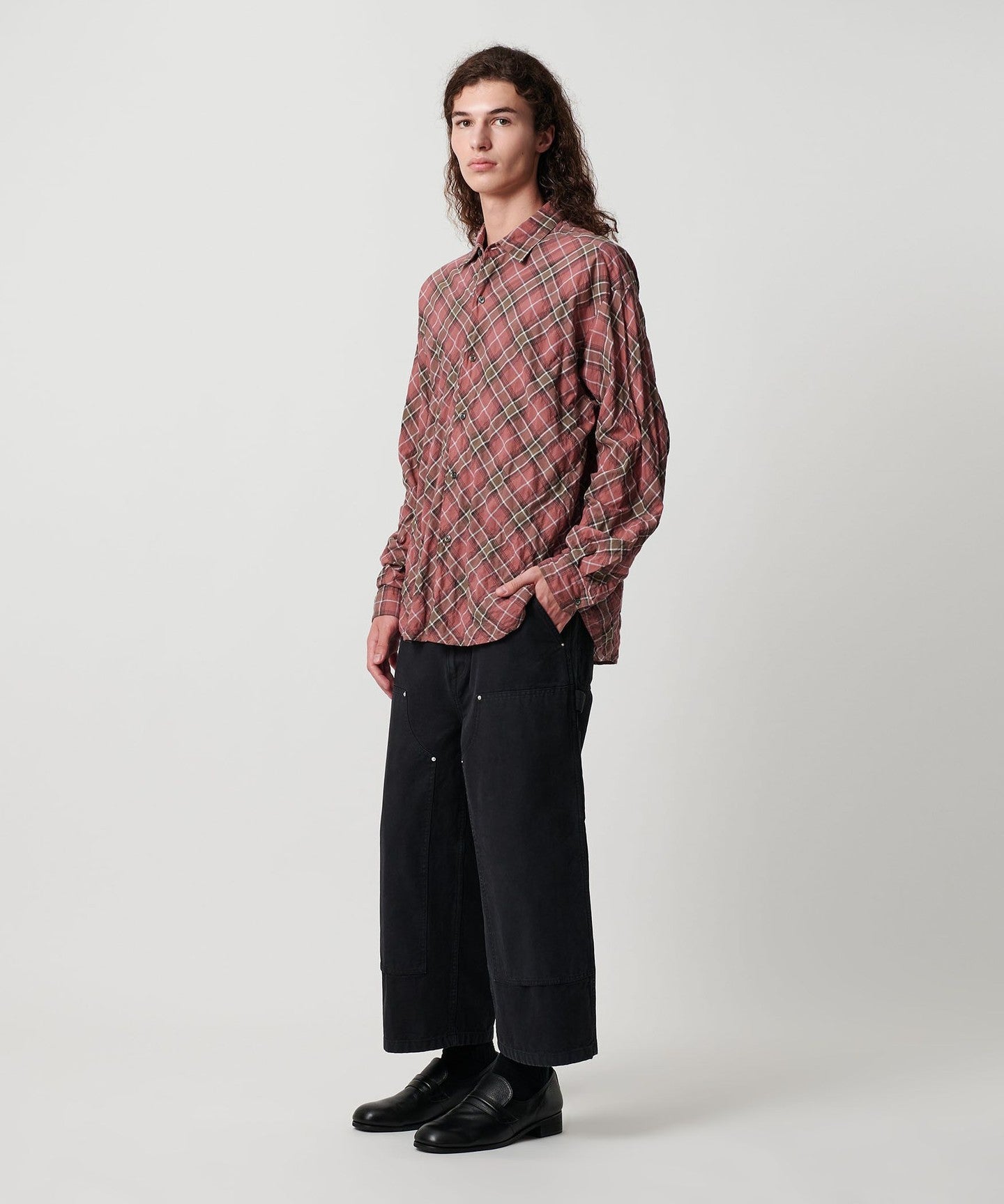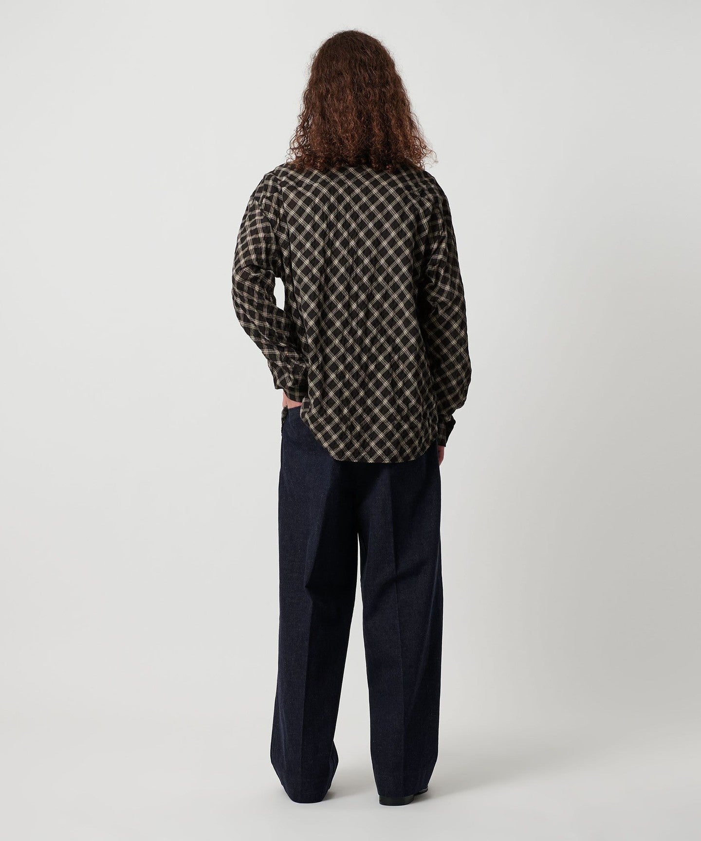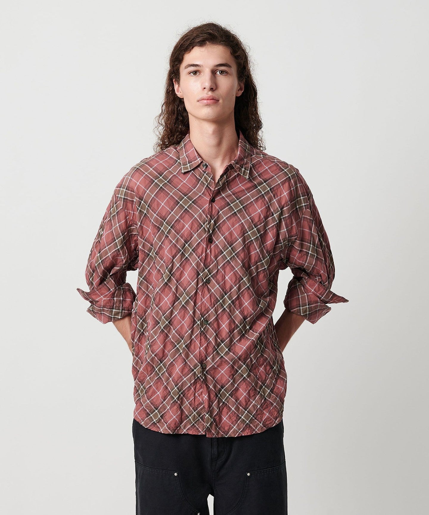 A shirt made from checked material that features a sheer feel and shirring that resembles natural washing wrinkles.