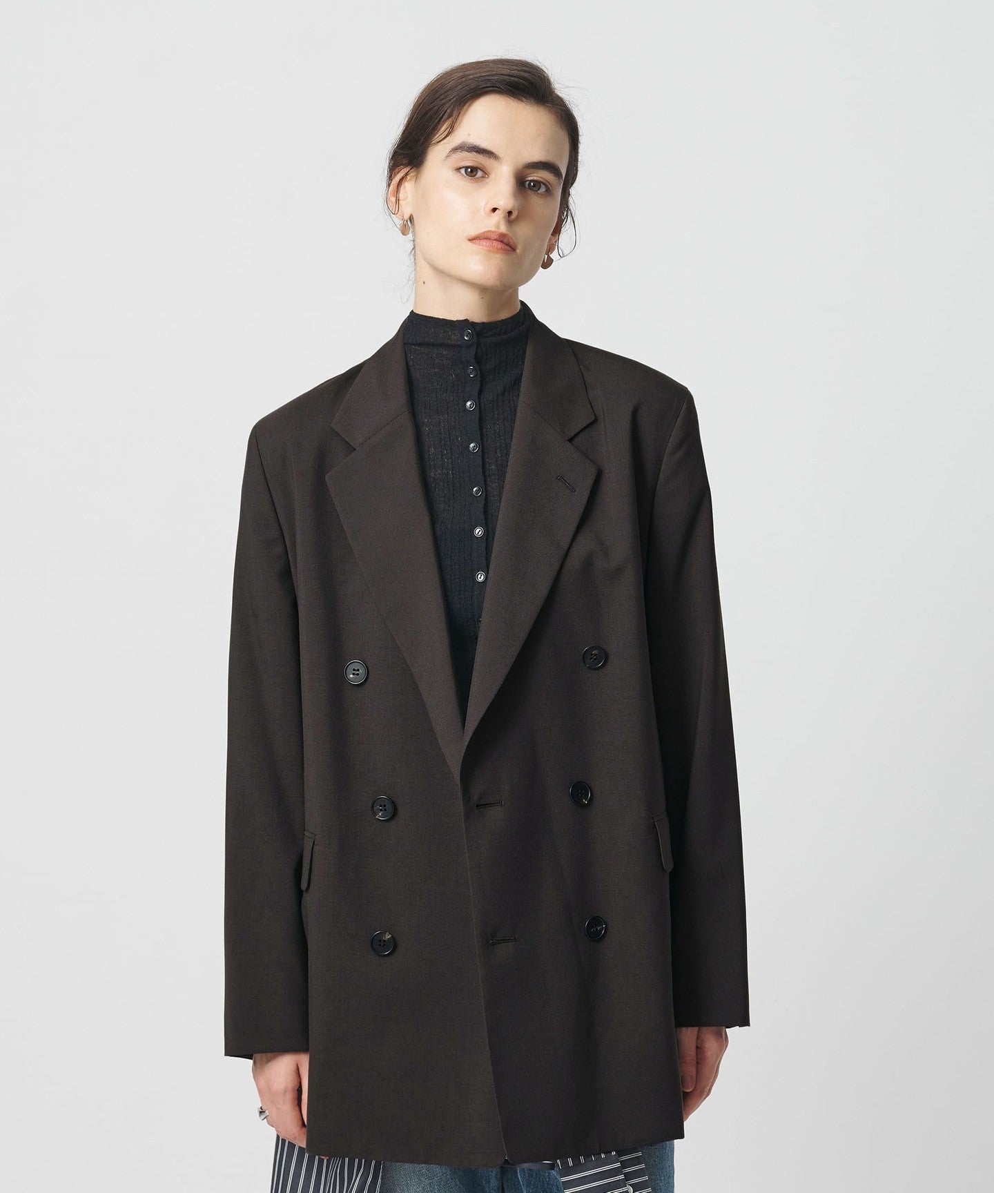 This oversized double-breasted jacket can also be worn as an outerwear piece. The shoulder pads add a refined touch, and the rounded shoulder line creates a relaxed silhouette with a gentle nuance. The double-breasted design gives it a luxurious, weighty look, while the smooth, light texture makes it easy to wear on a daily basis. This is a recommended piece that will give you a sophisticated style just by wearing it casually.