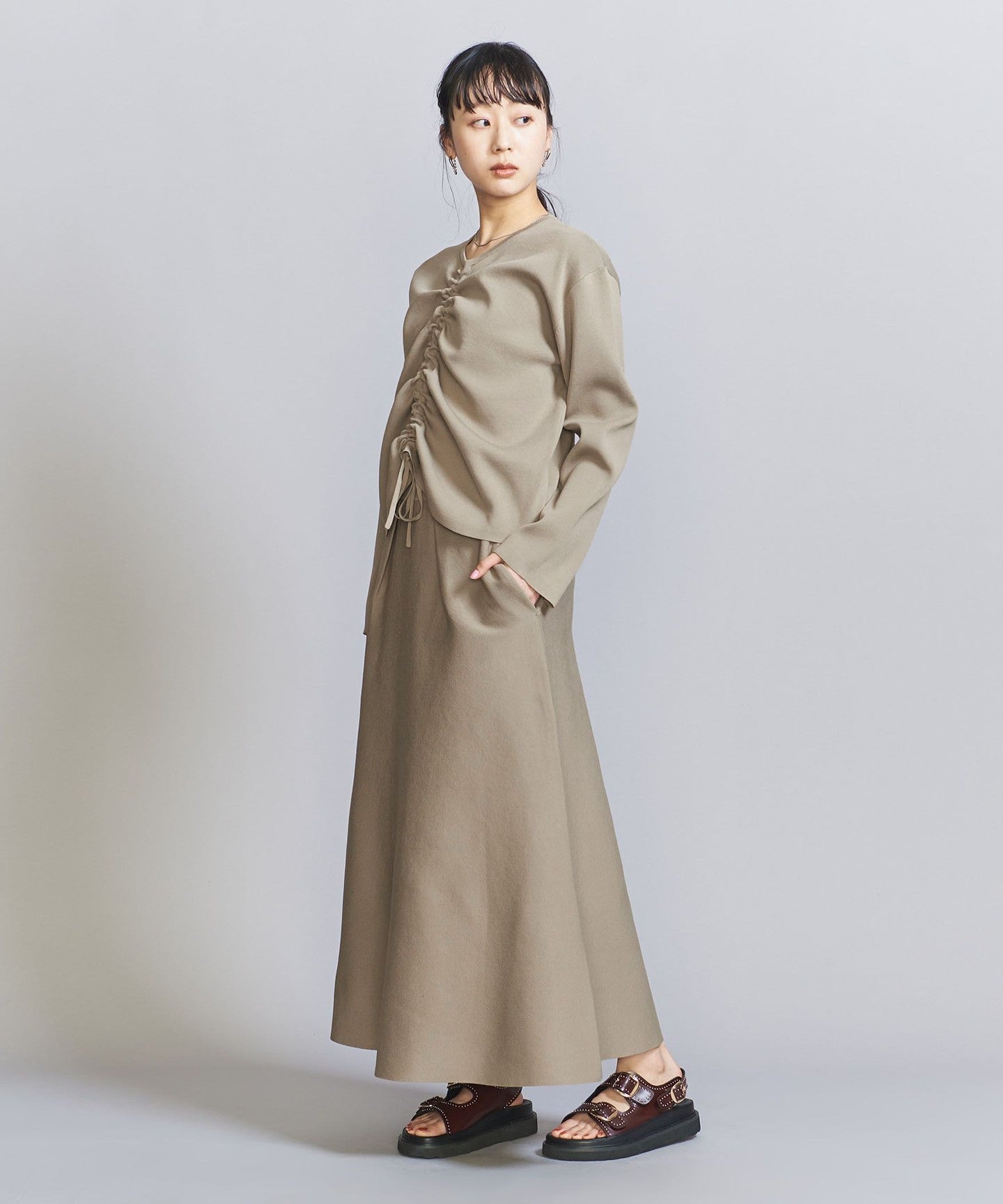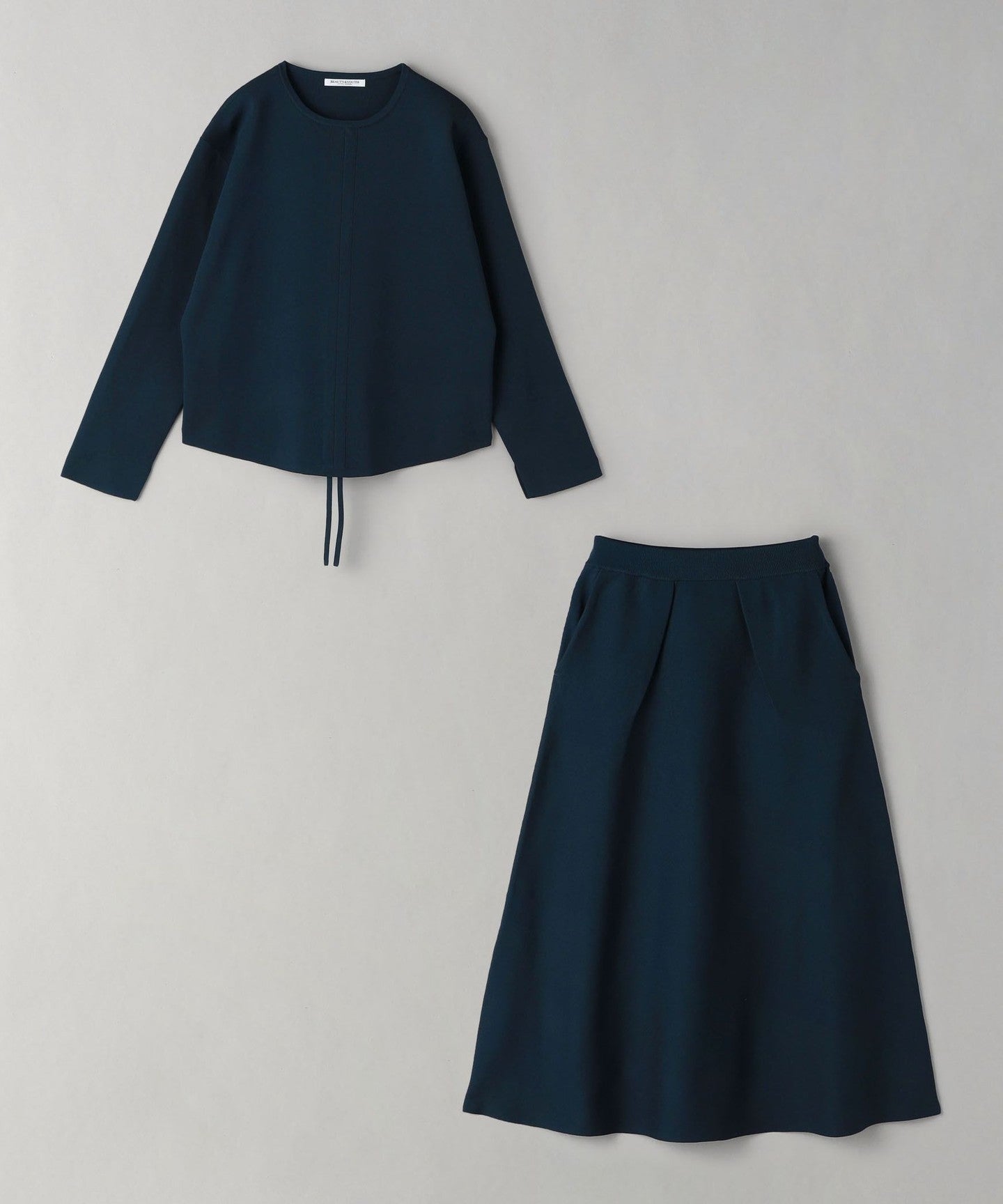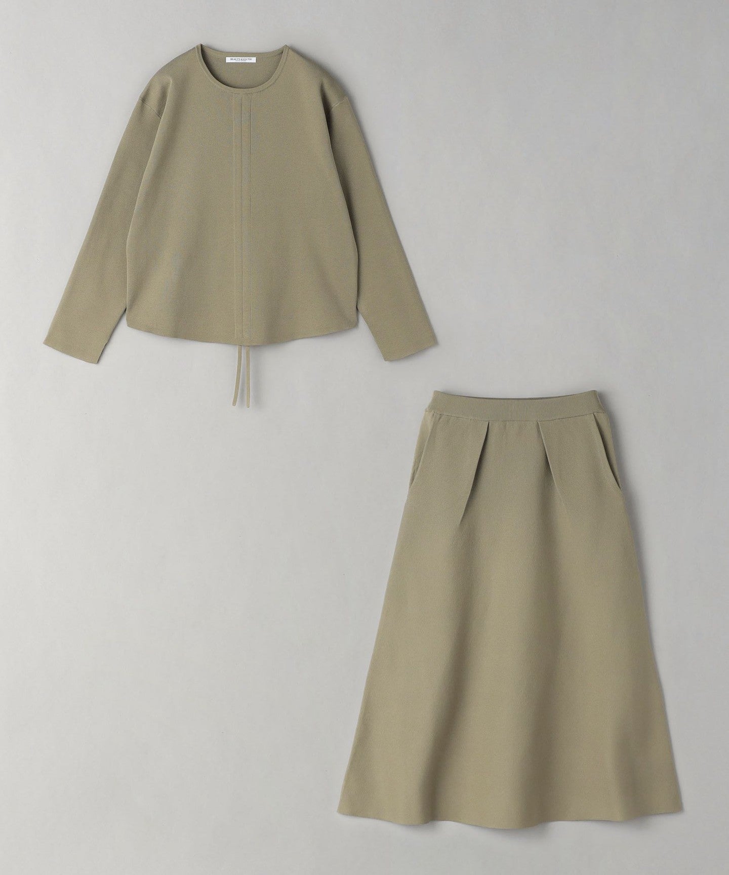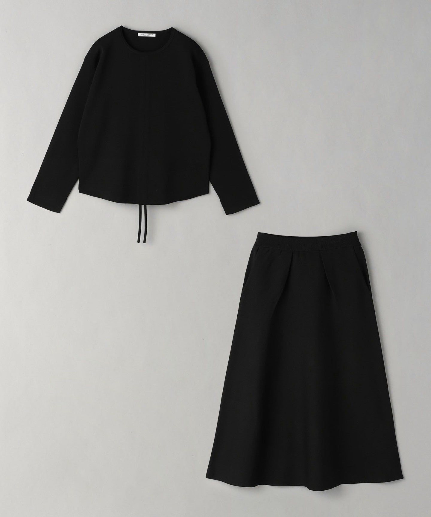 The top can be worn in various ways thanks to the drawstring at the front, and the simple flared skirt with tucks can both be worn on their own, making them extremely versatile pieces.