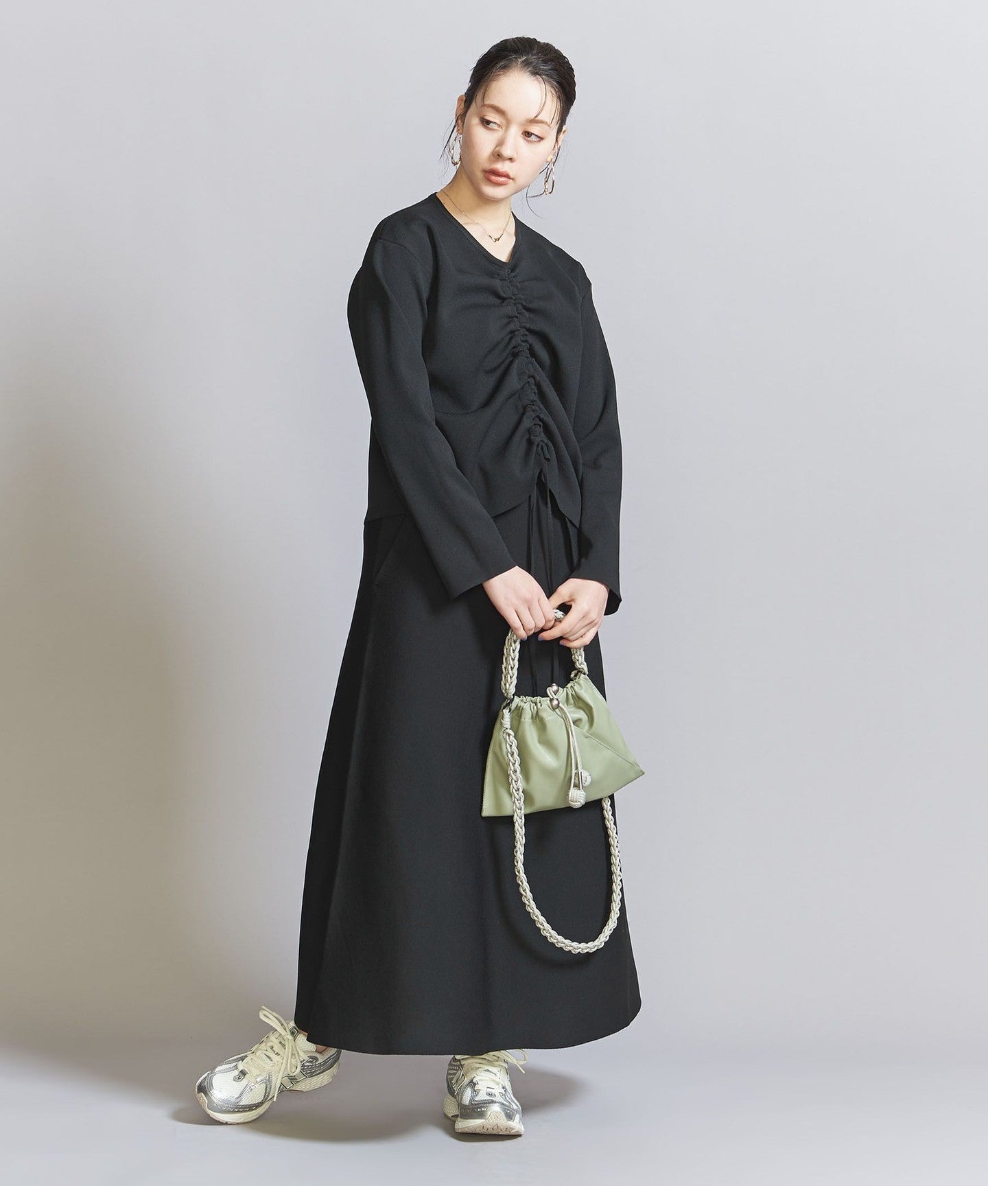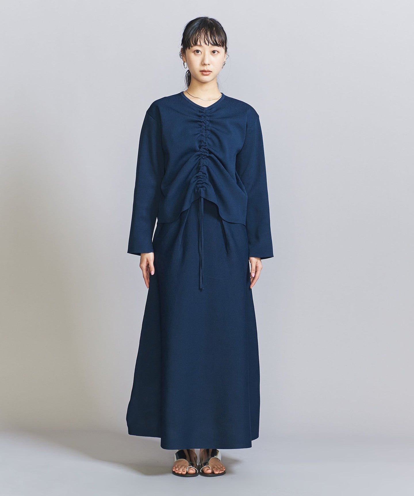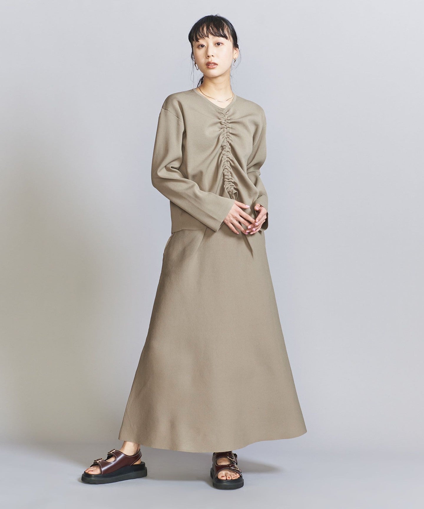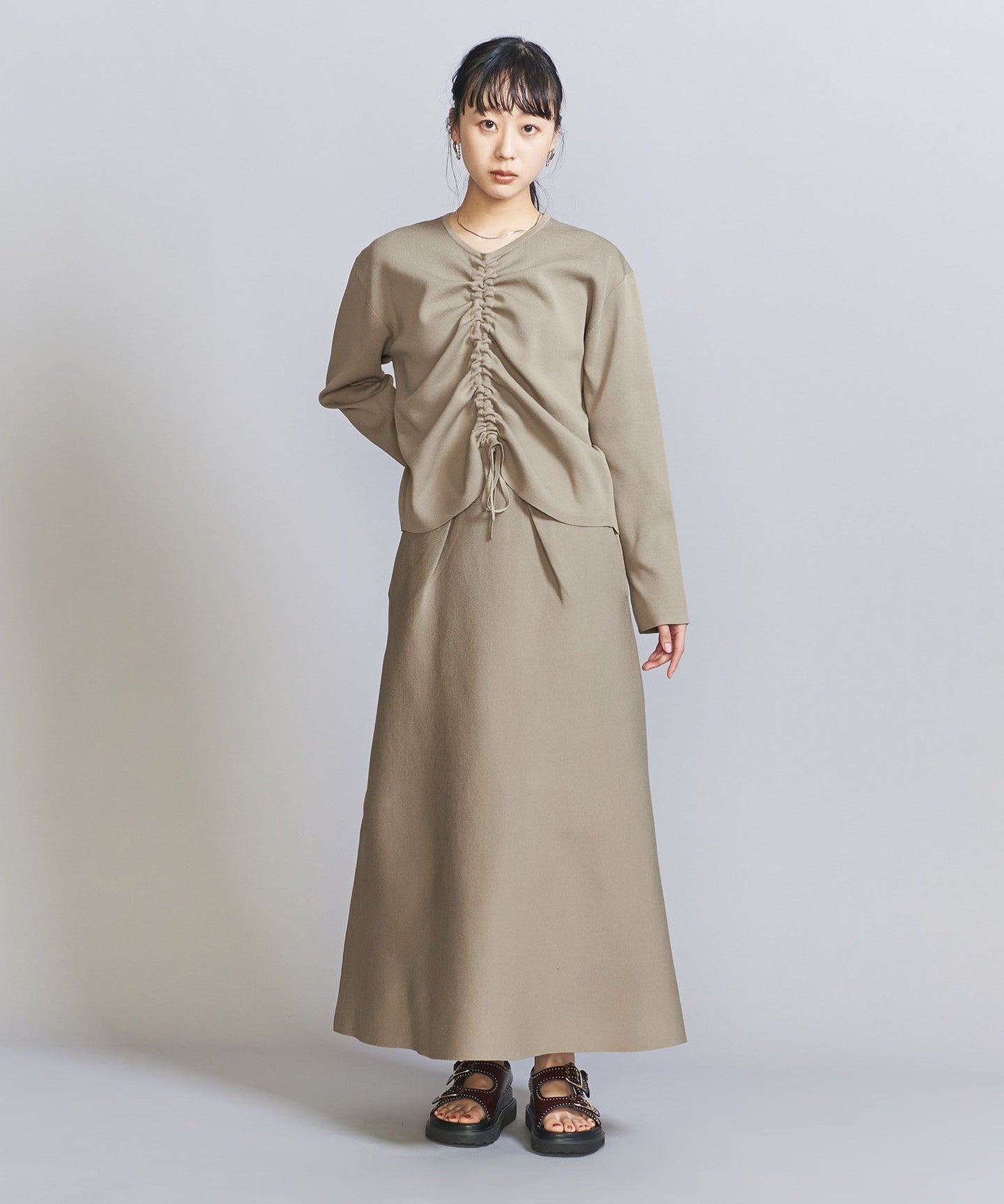 The top can be worn in various ways thanks to the drawstring at the front, and the simple flared skirt with tucks can both be worn on their own, making them extremely versatile pieces.