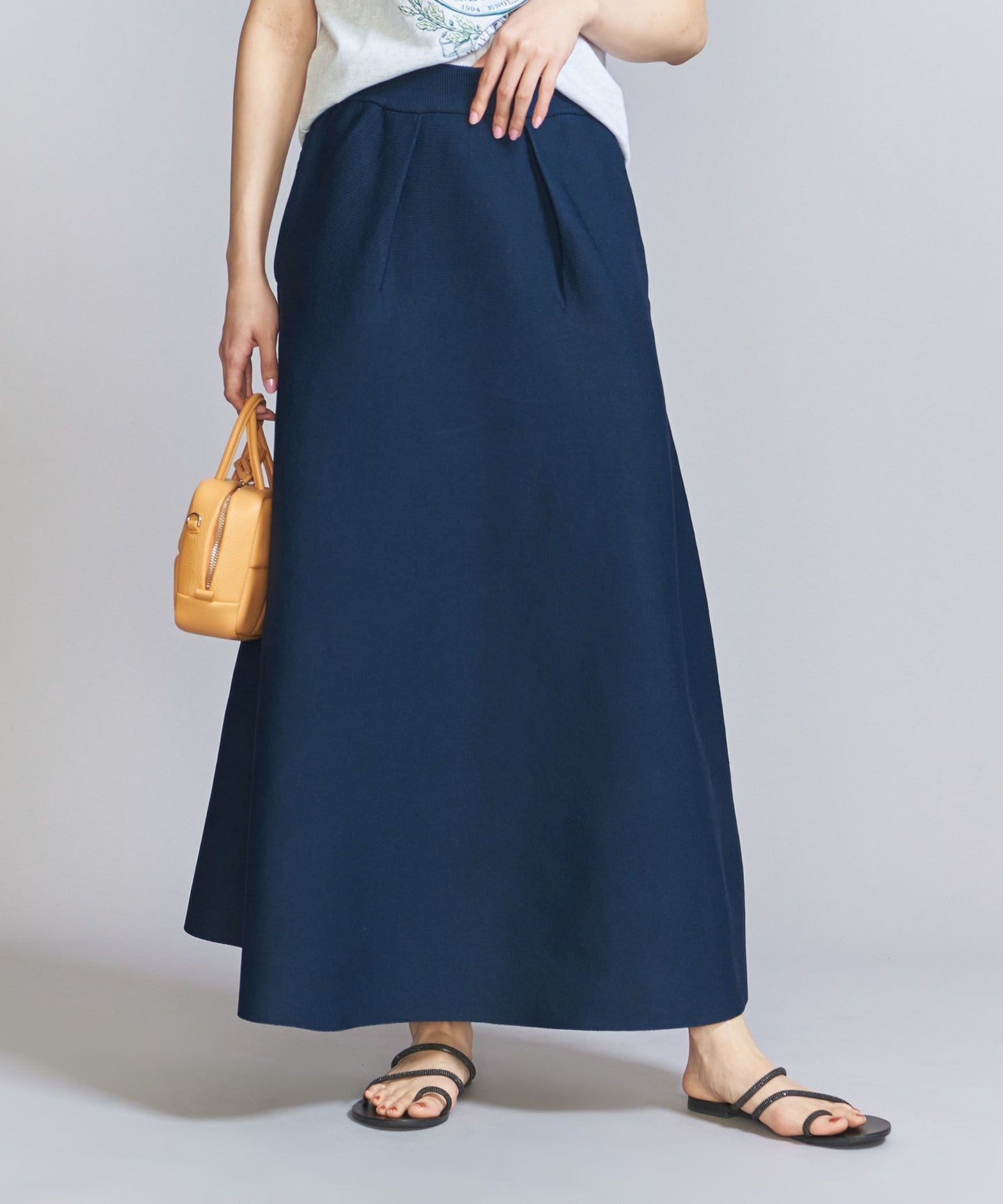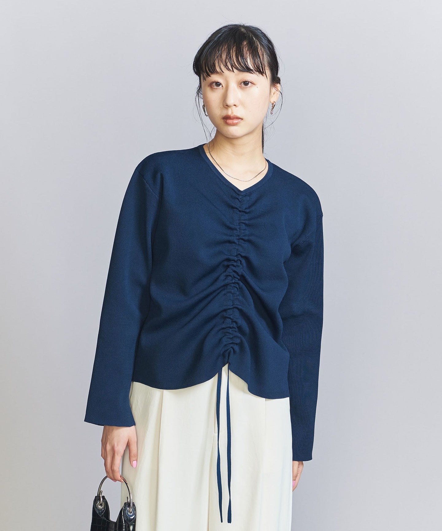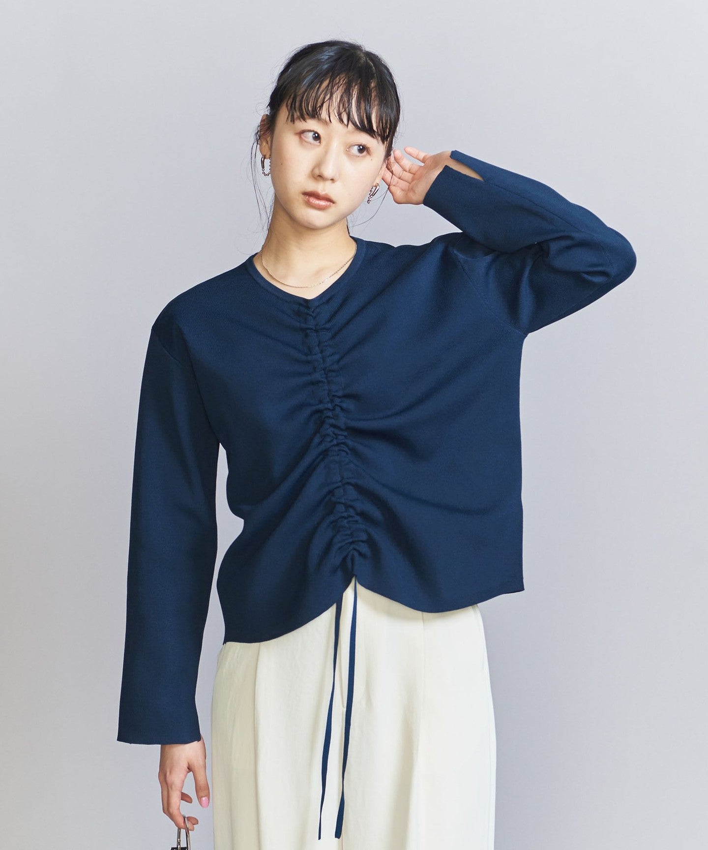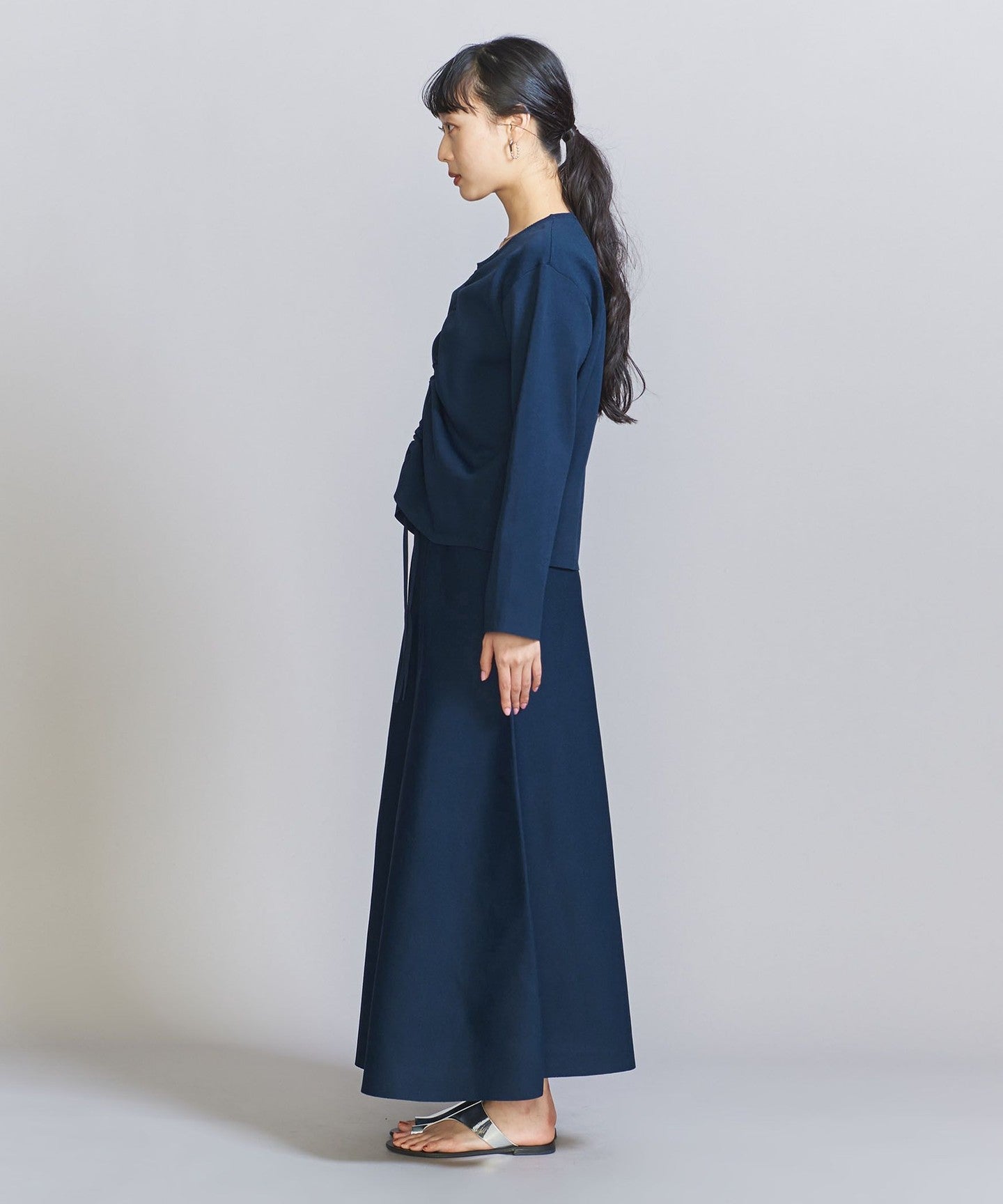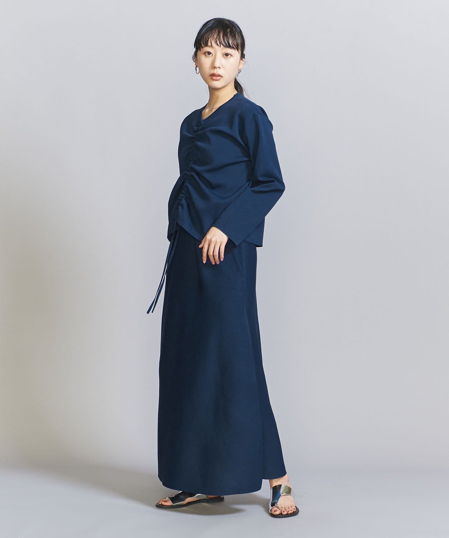 The top can be worn in various ways thanks to the drawstring at the front, and the simple flared skirt with tucks can both be worn on their own, making them extremely versatile pieces.