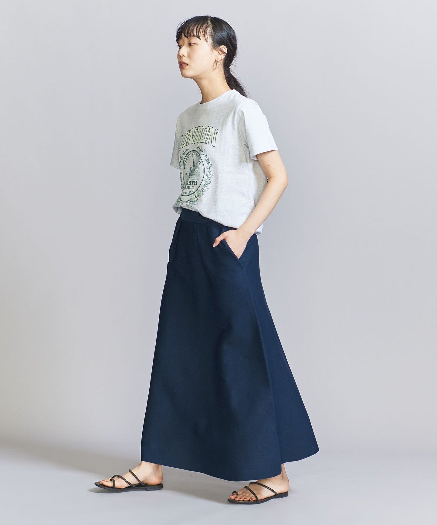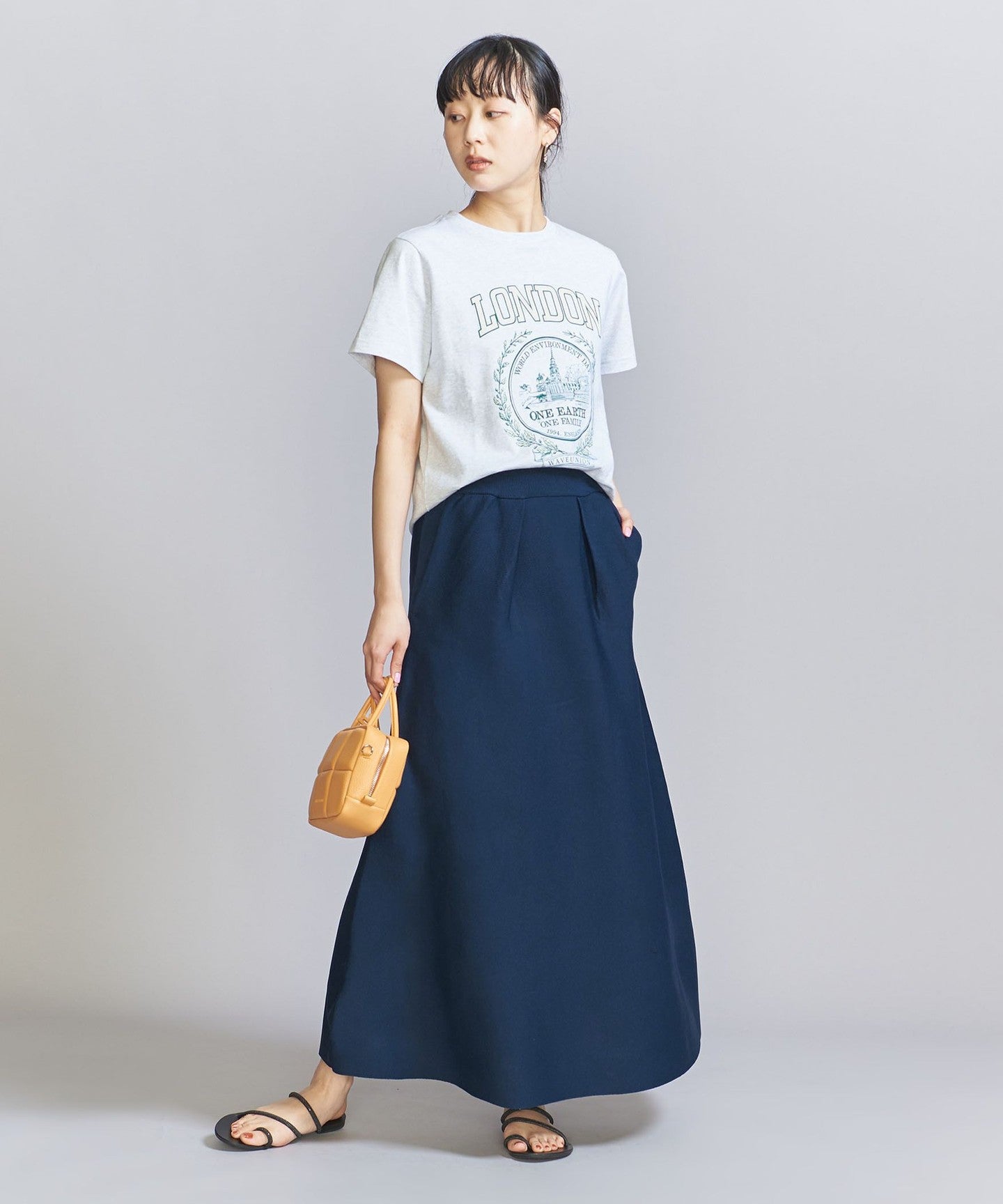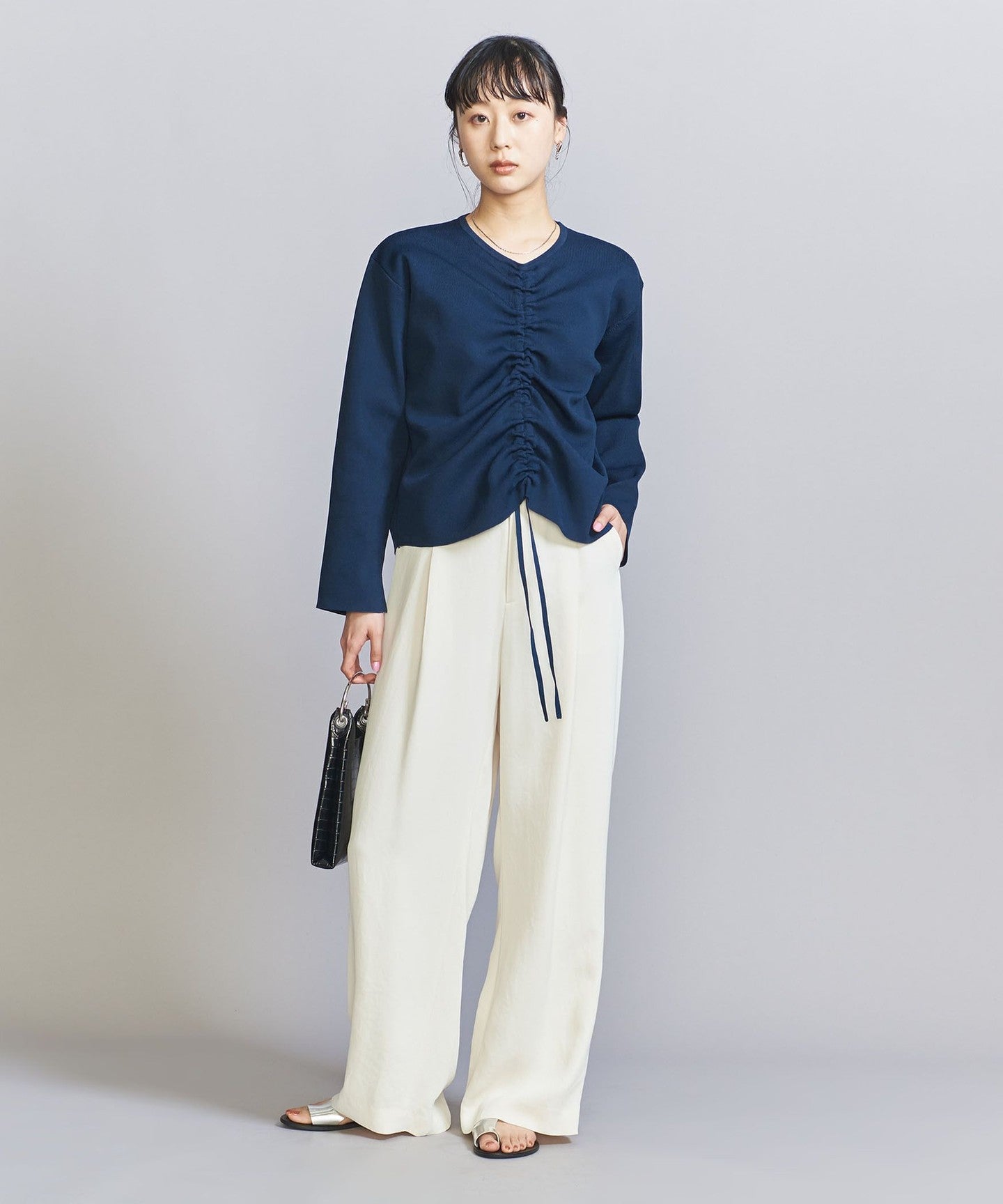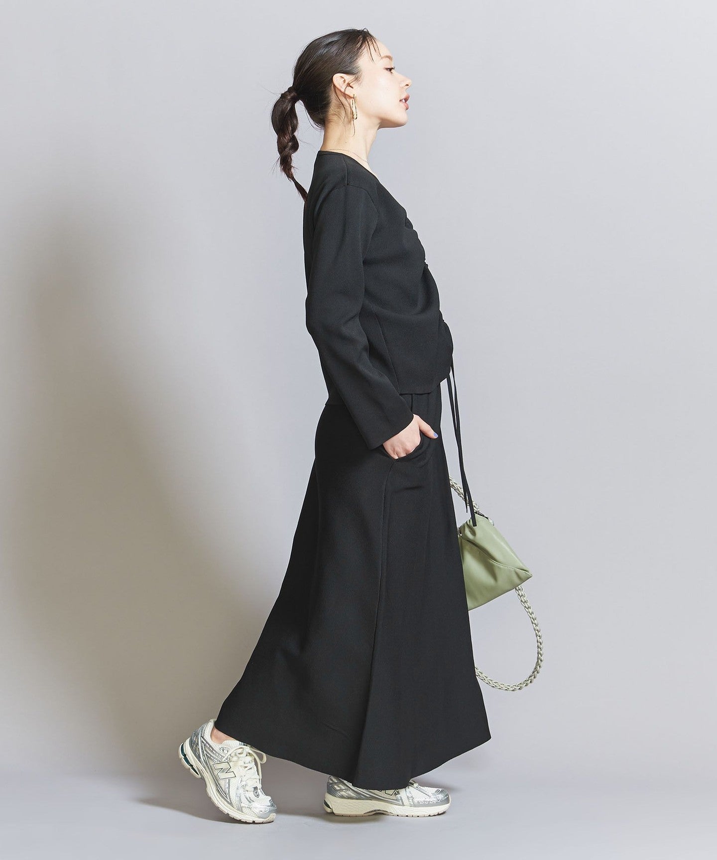 The top can be worn in various ways thanks to the drawstring at the front, and the simple flared skirt with tucks can both be worn on their own, making them extremely versatile pieces.