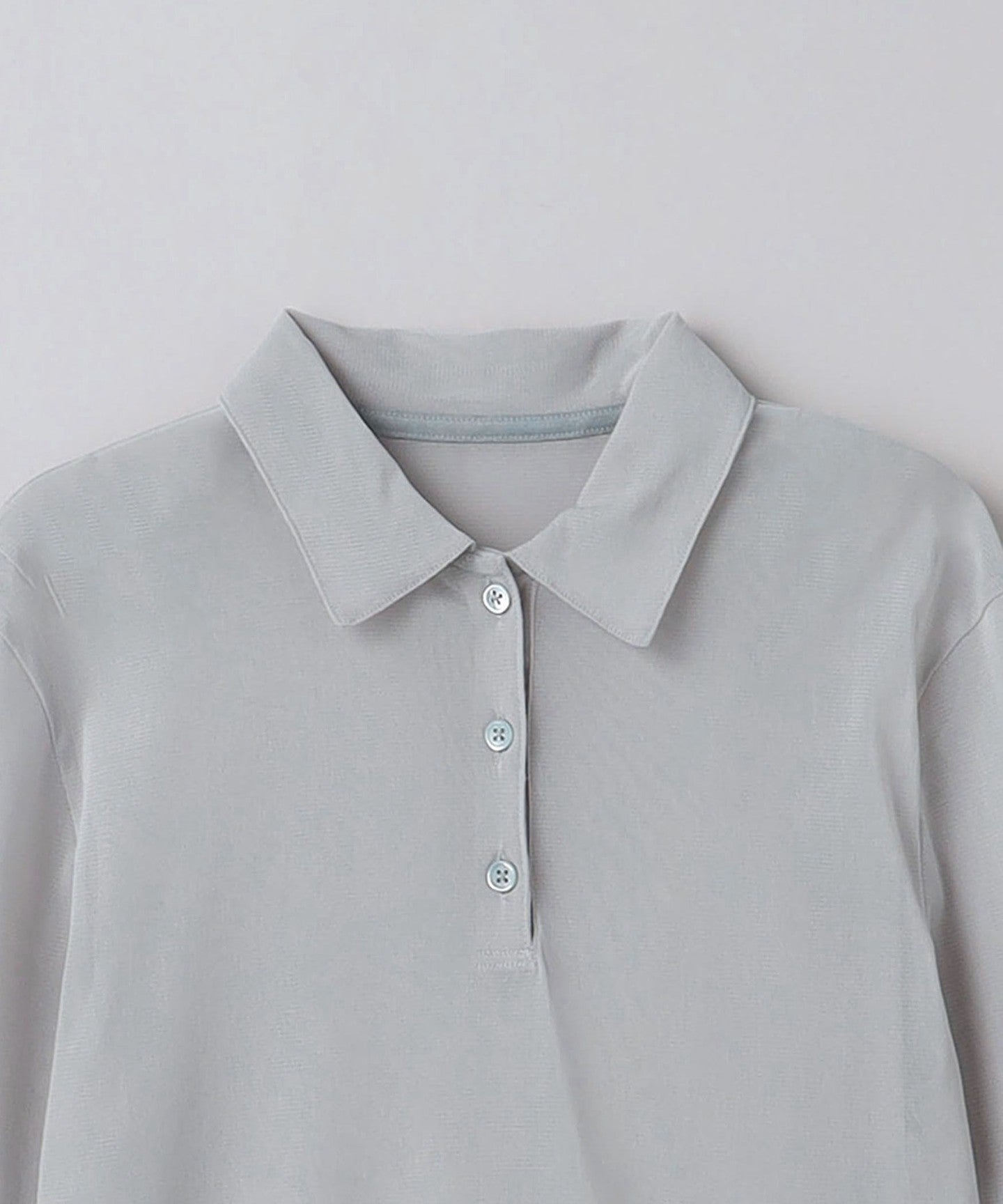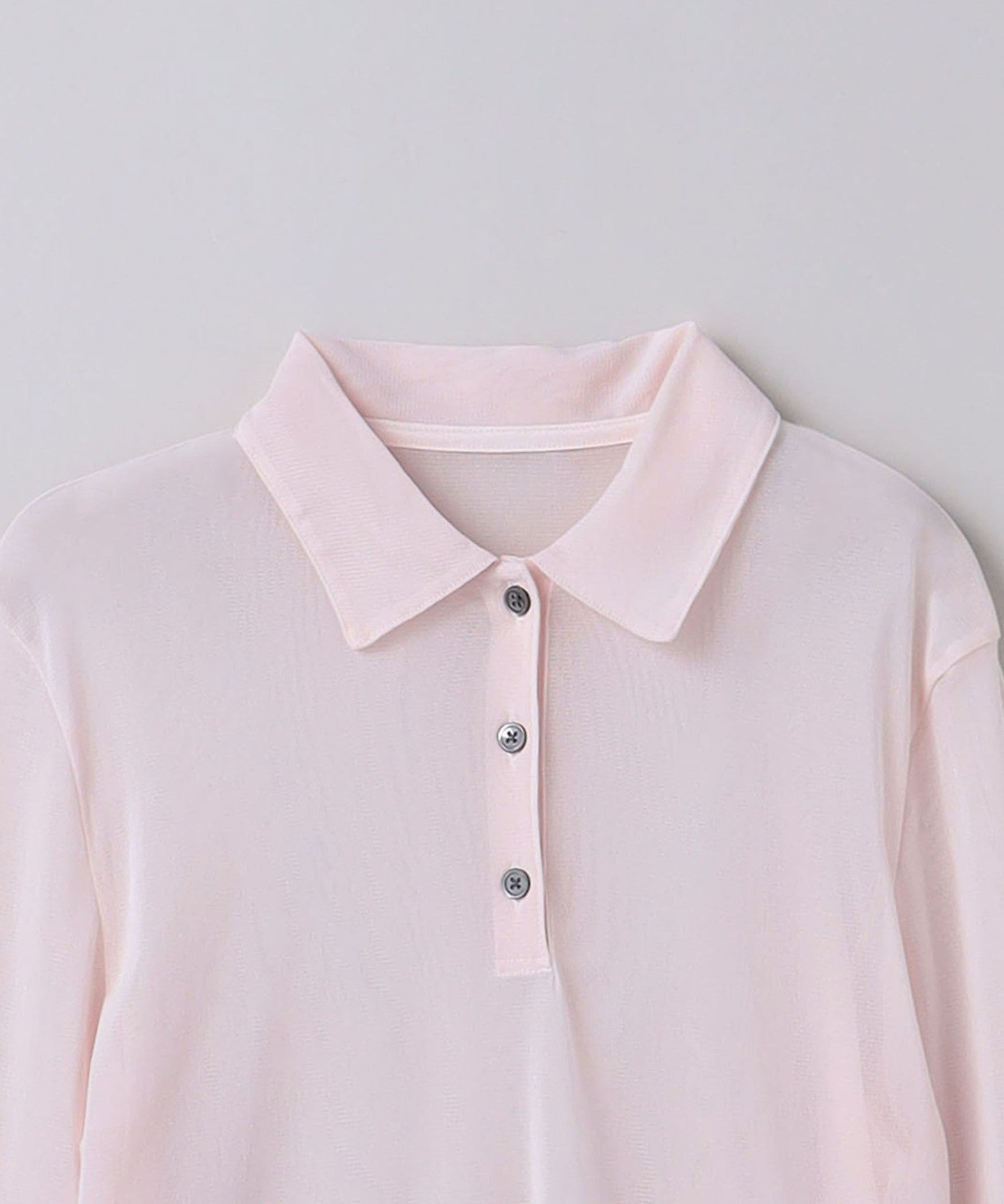 This polo shirt-style pullover top is made of sheer, transparent tulle material, giving it a light and airy feel.