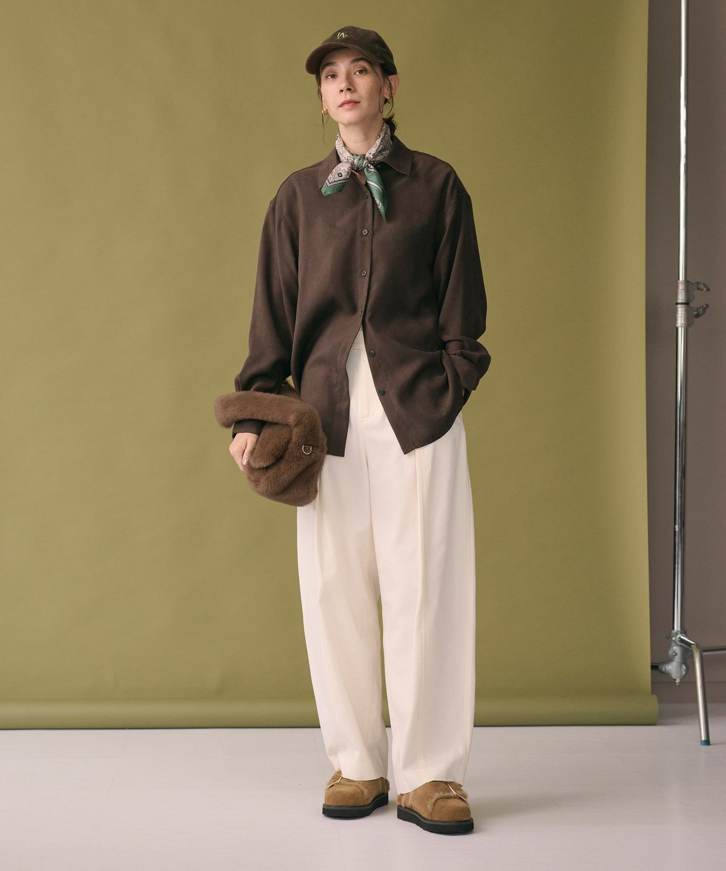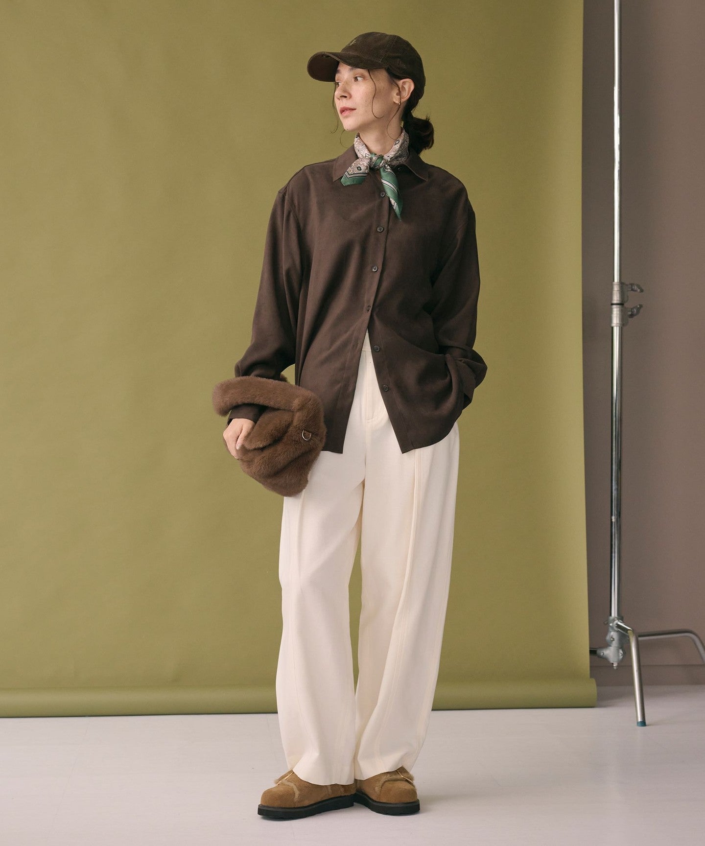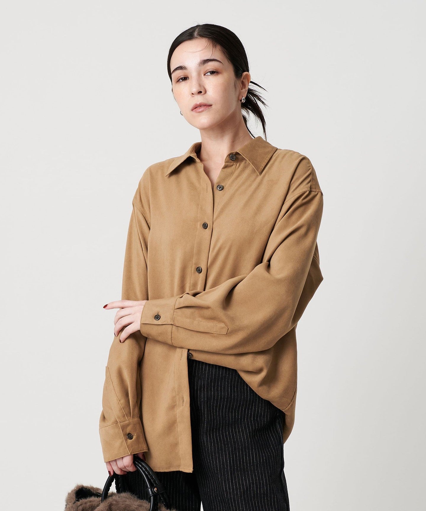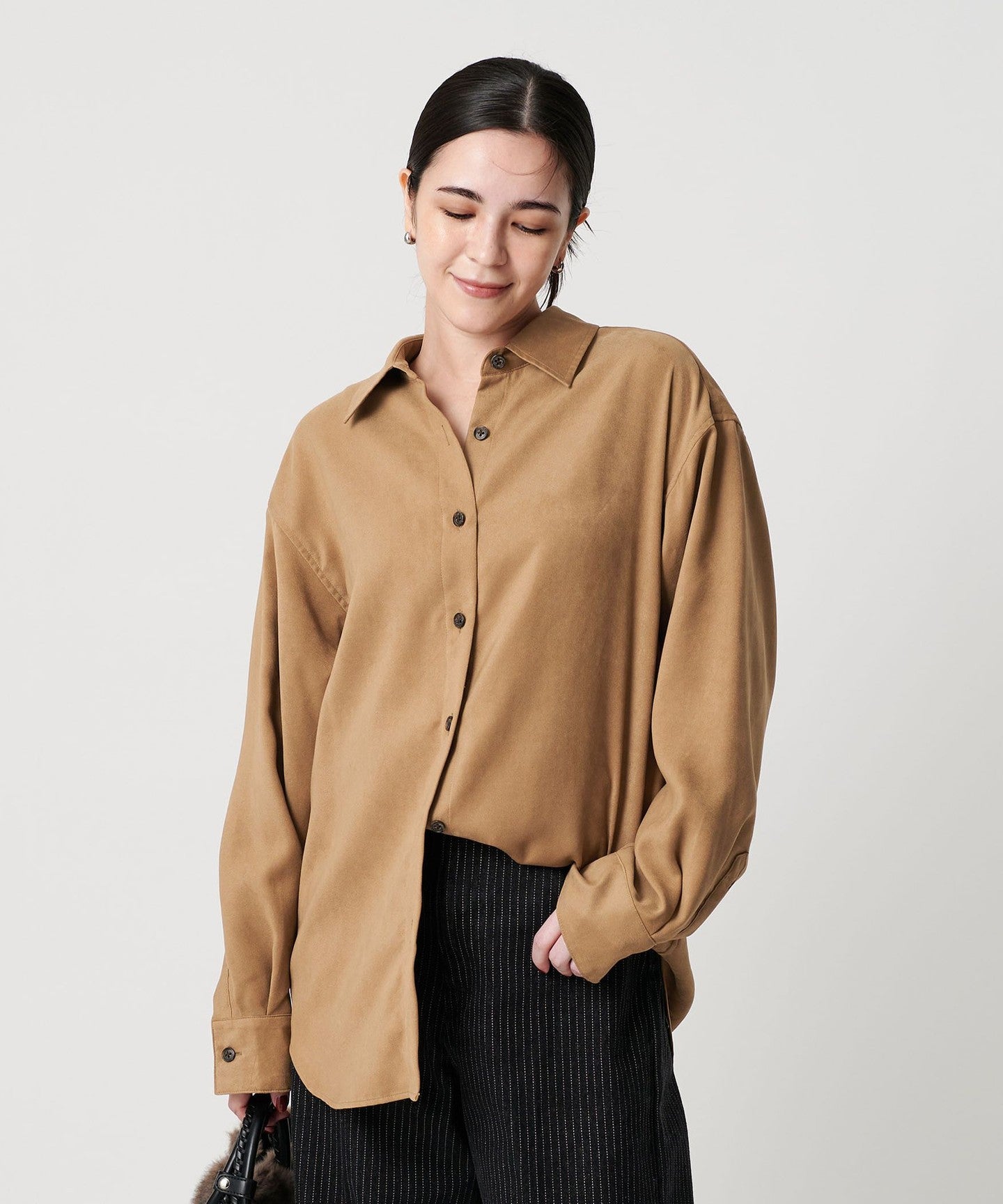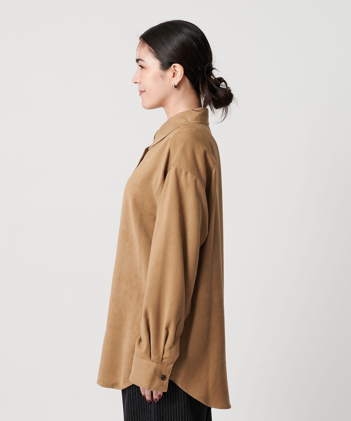 A regular collar shirt made from thin suede-like material.