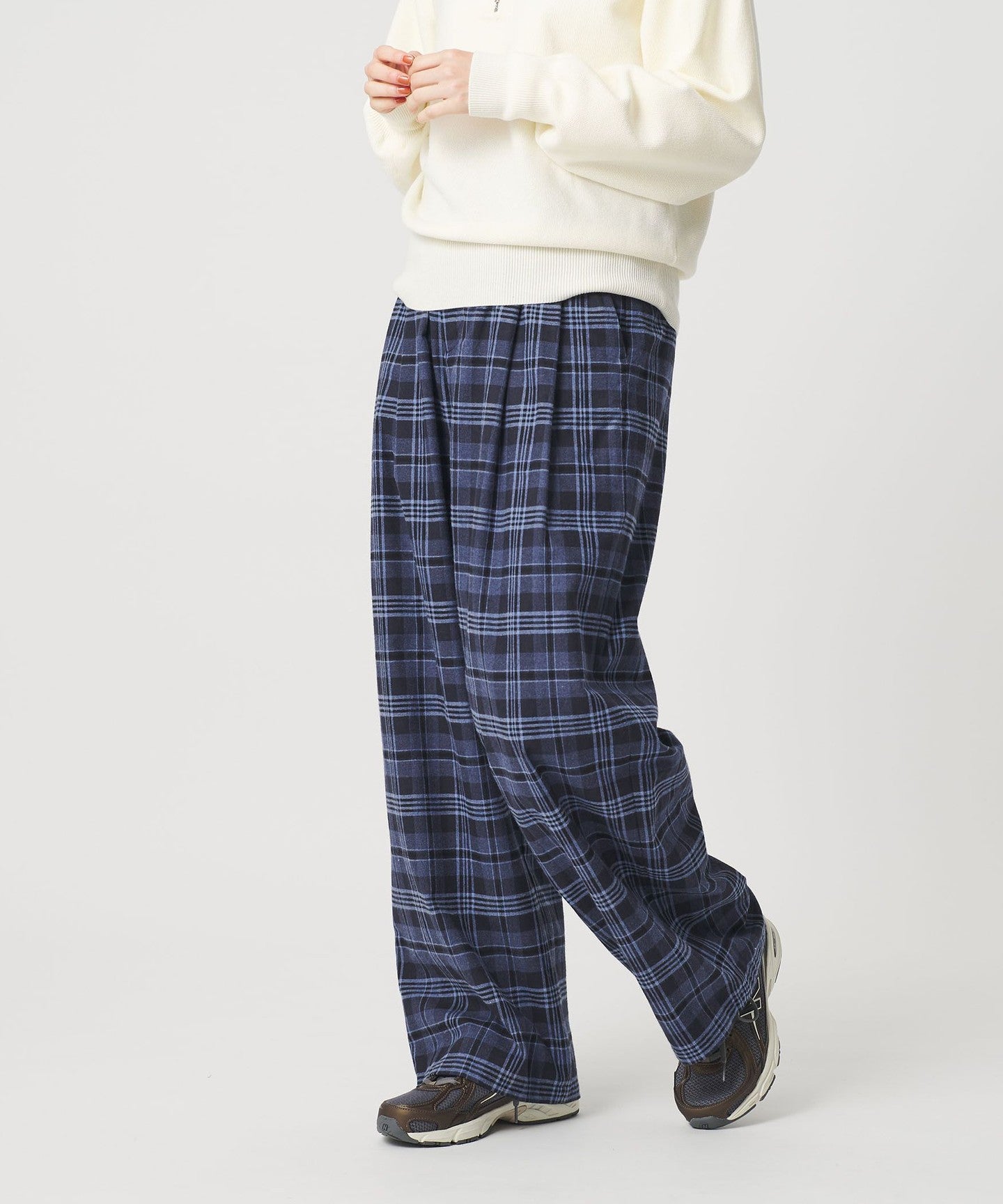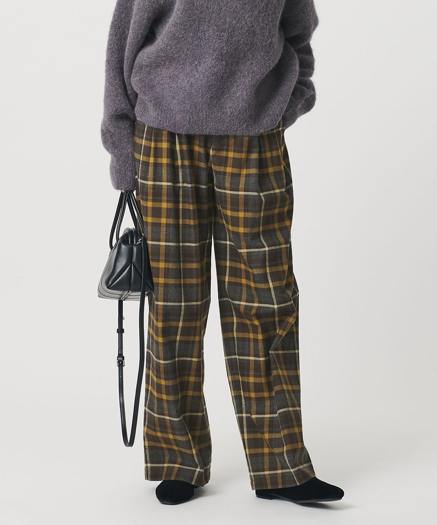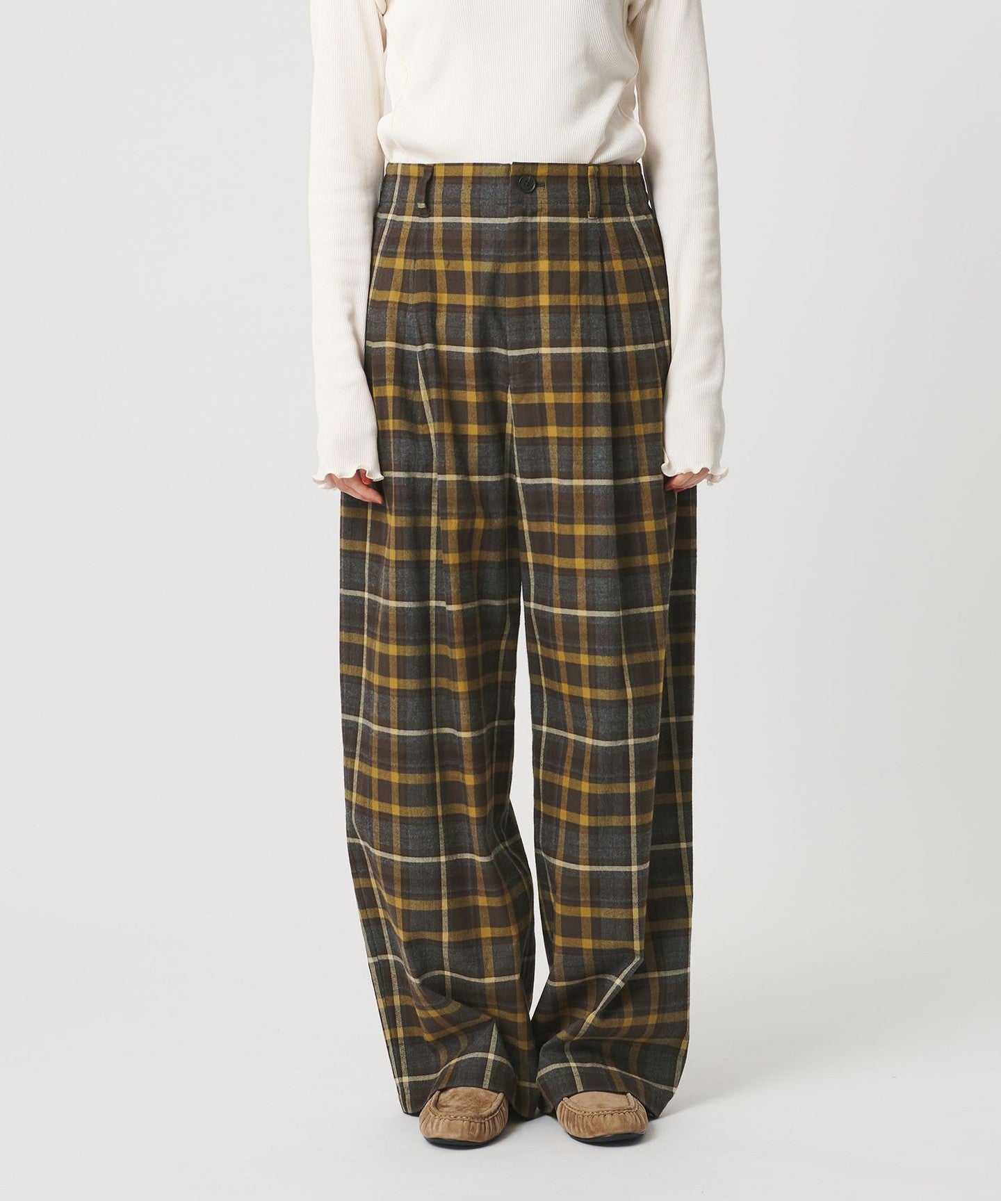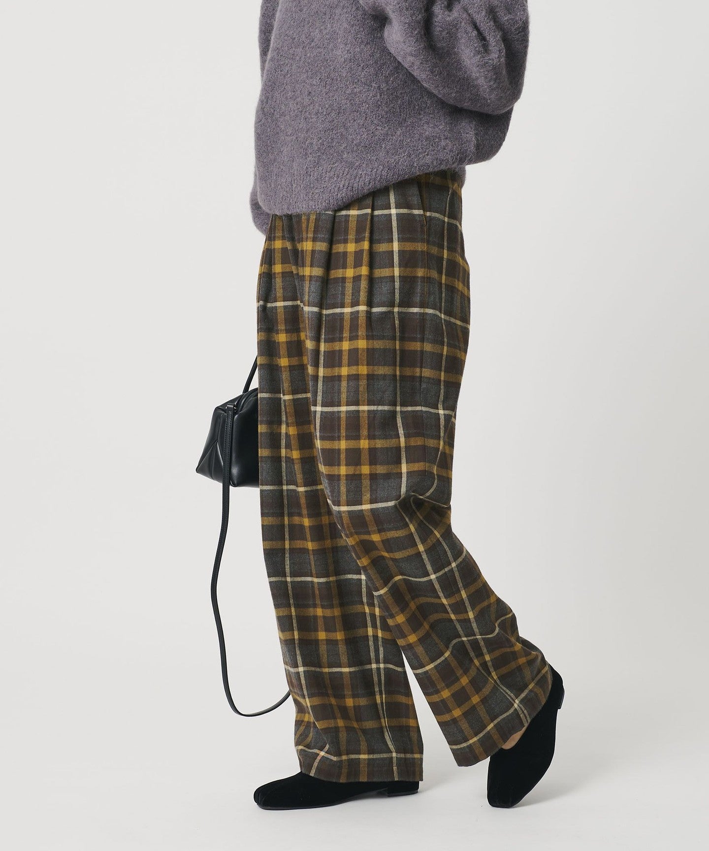 These flannel check wide pants feature an original brushed pattern.
