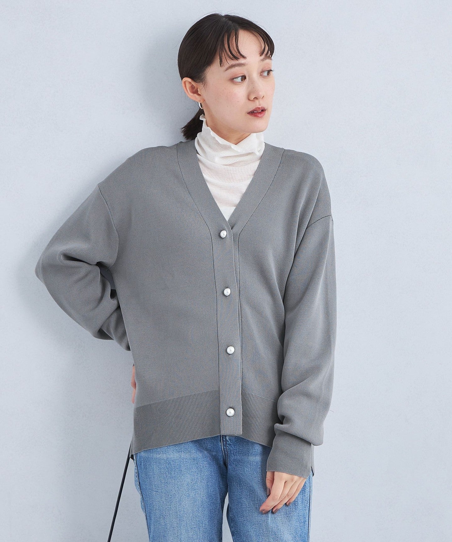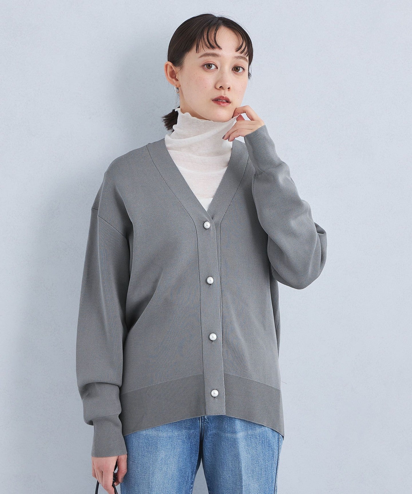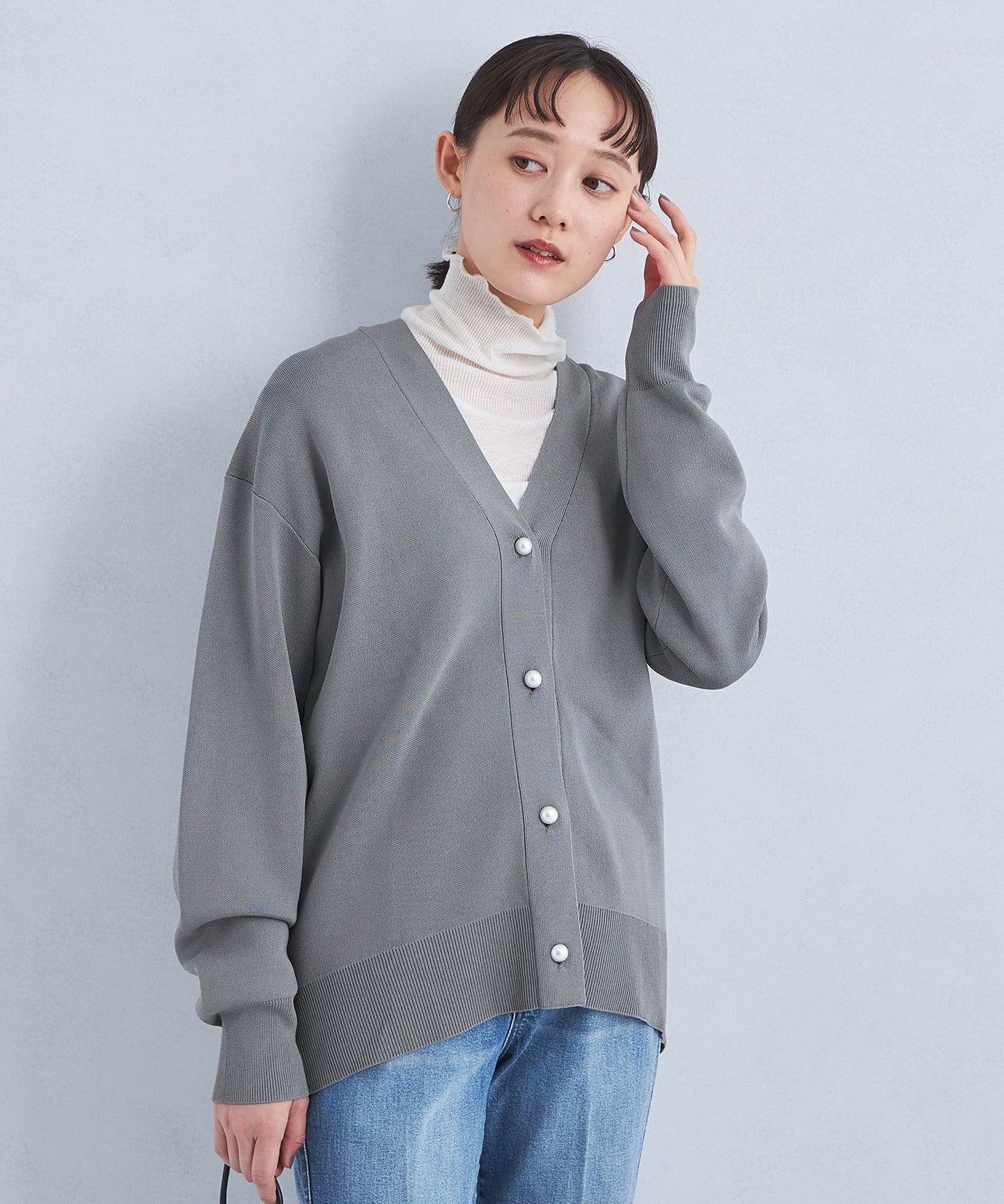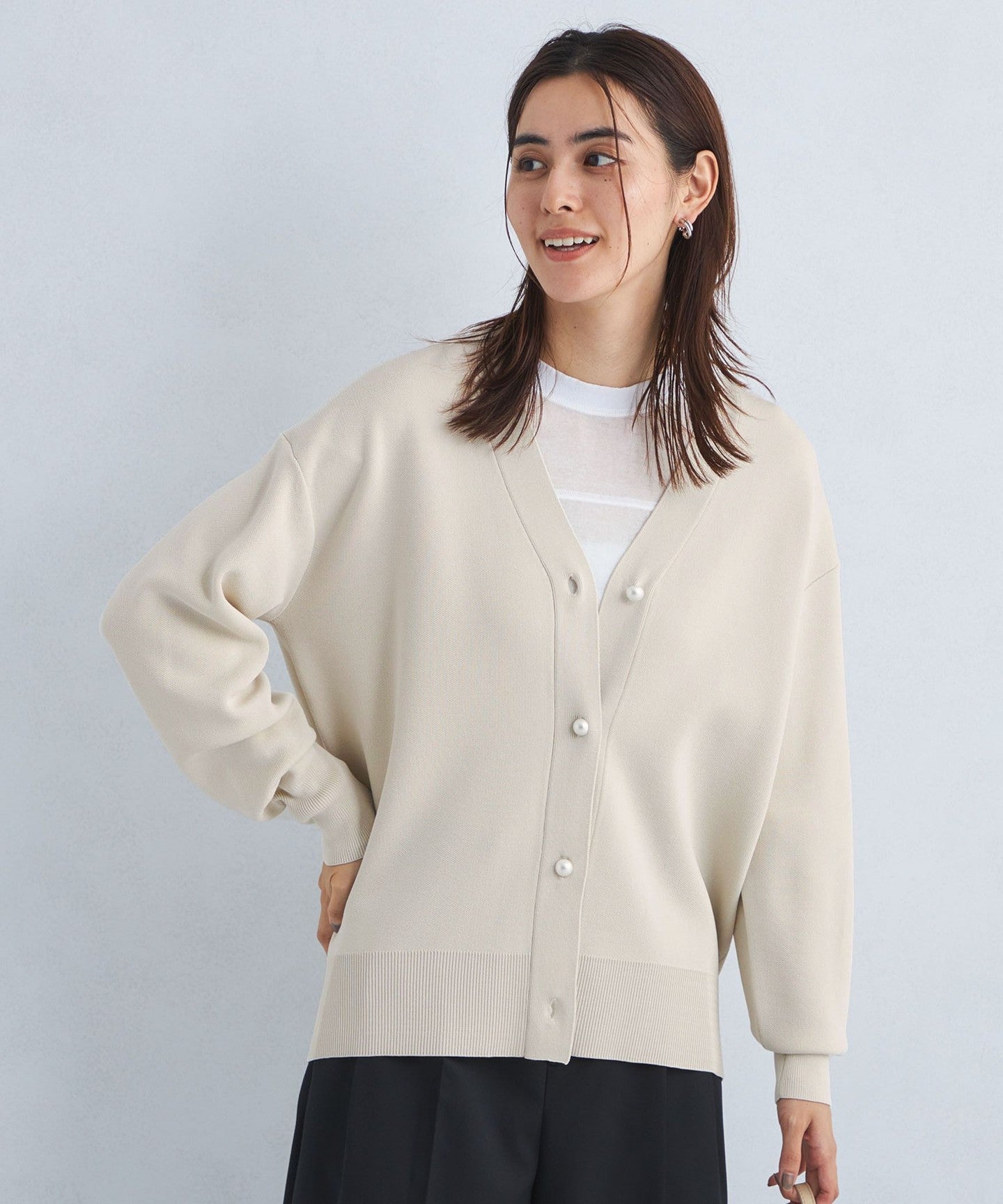 A cardigan with attractive pearl-like buttons that look like accessories.