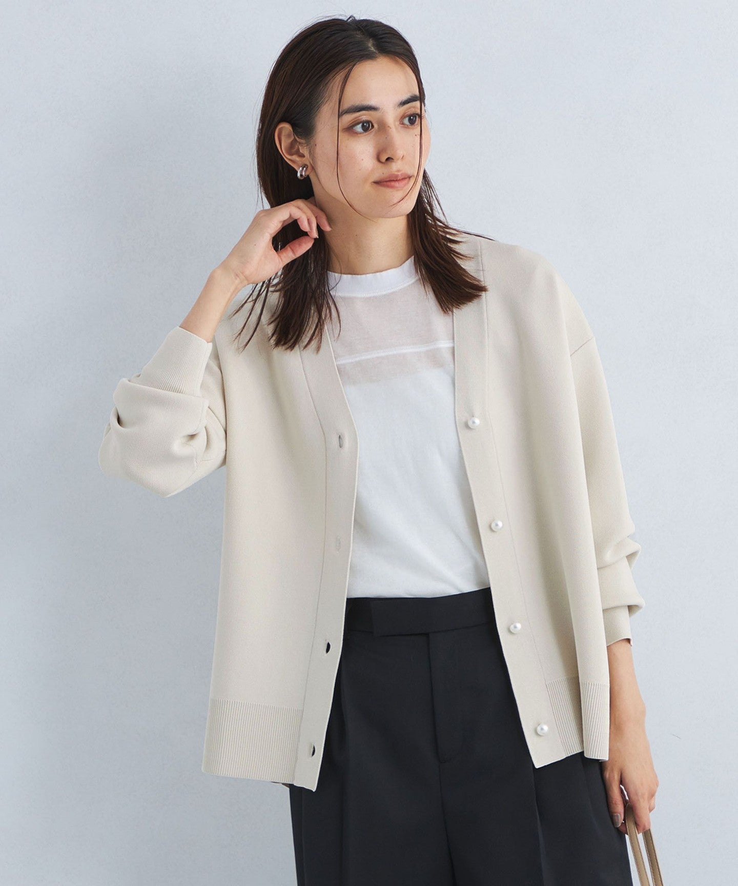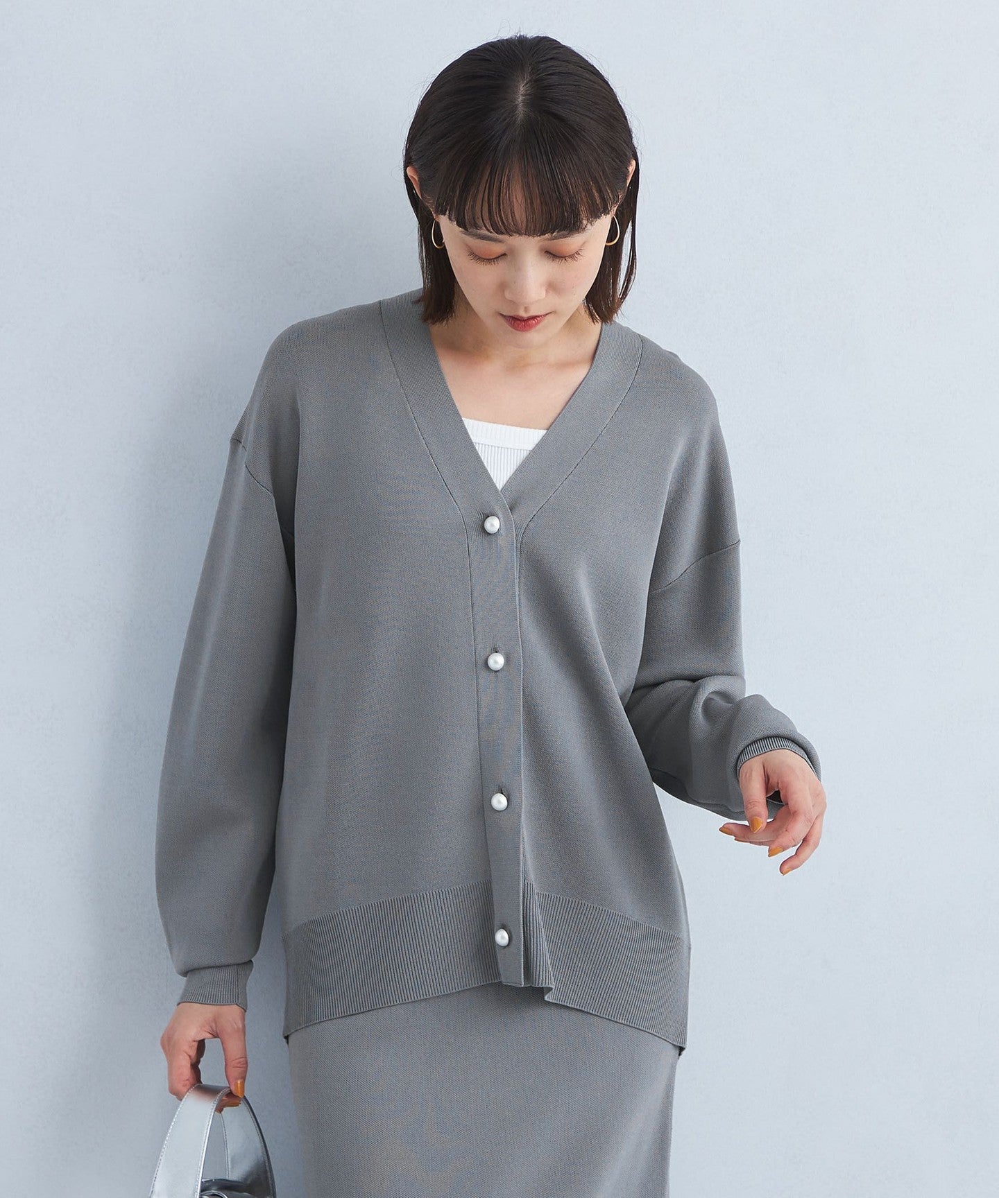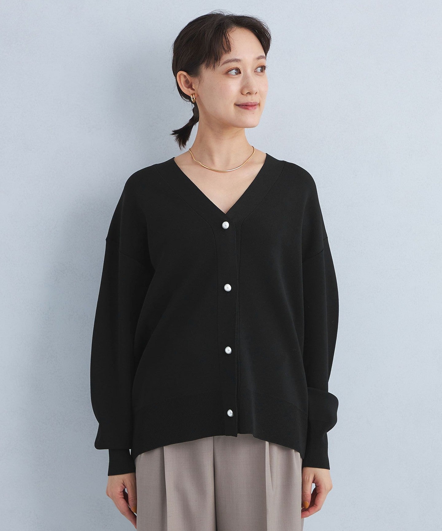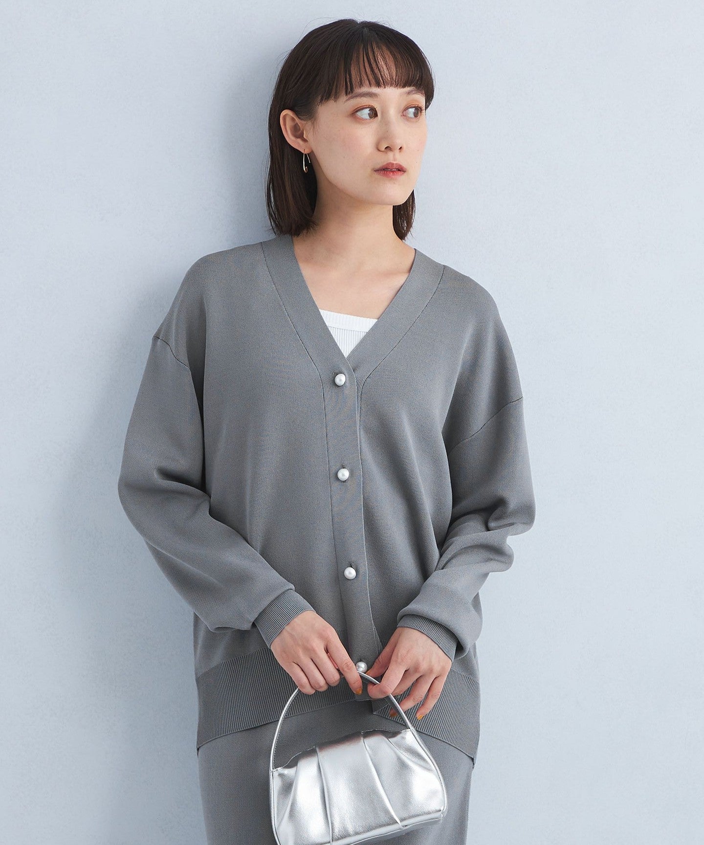 A cardigan with attractive pearl-like buttons that look like accessories.