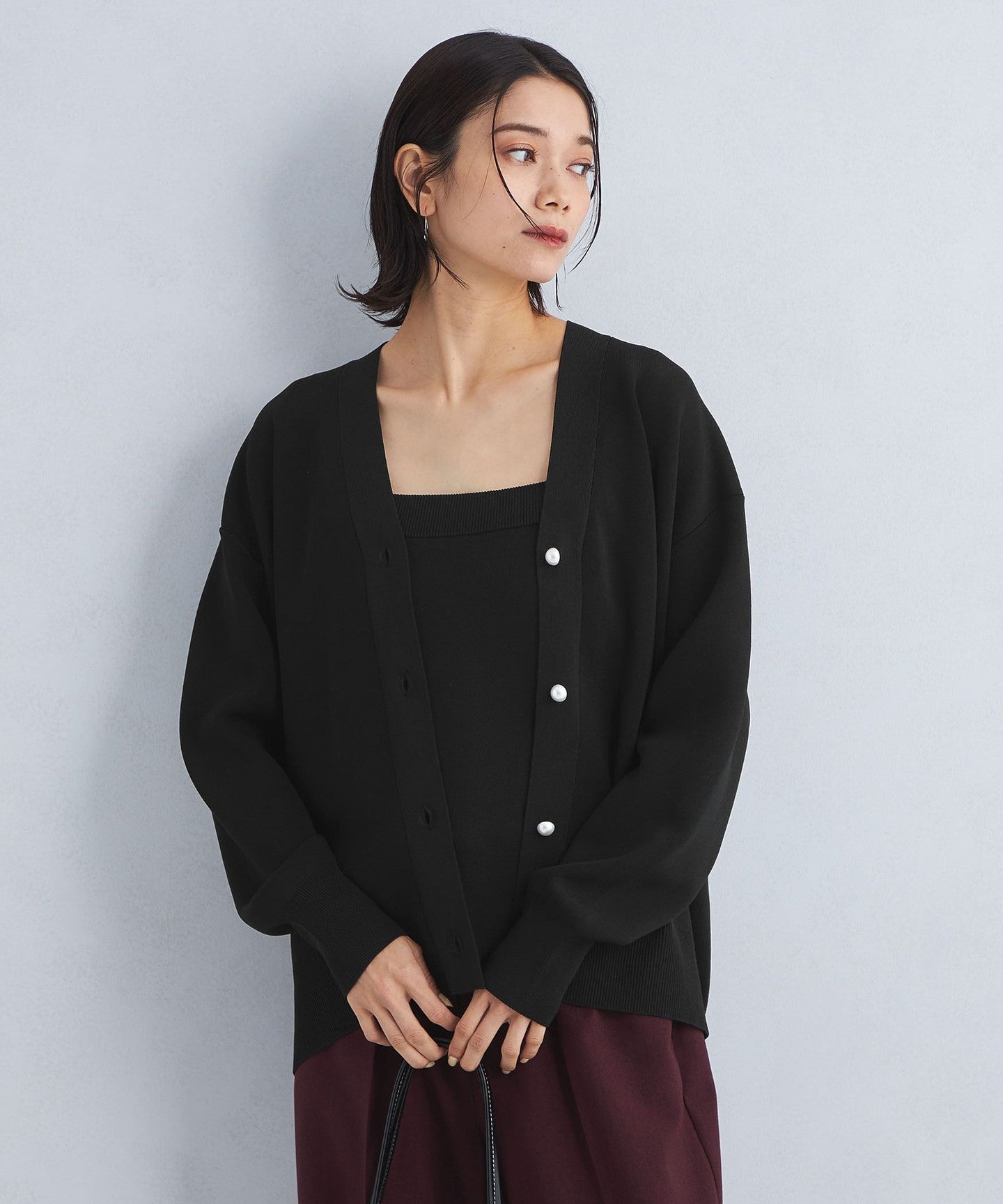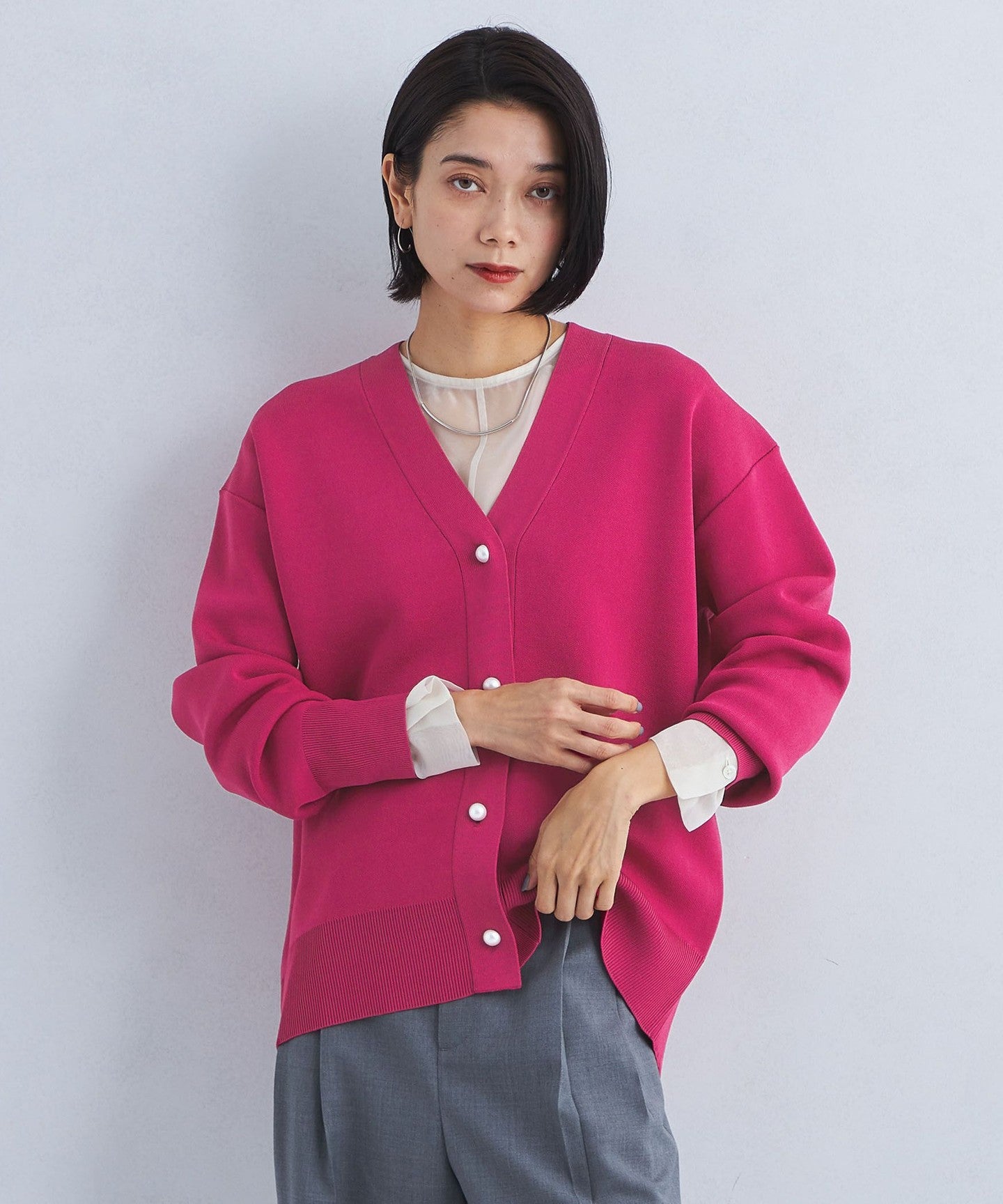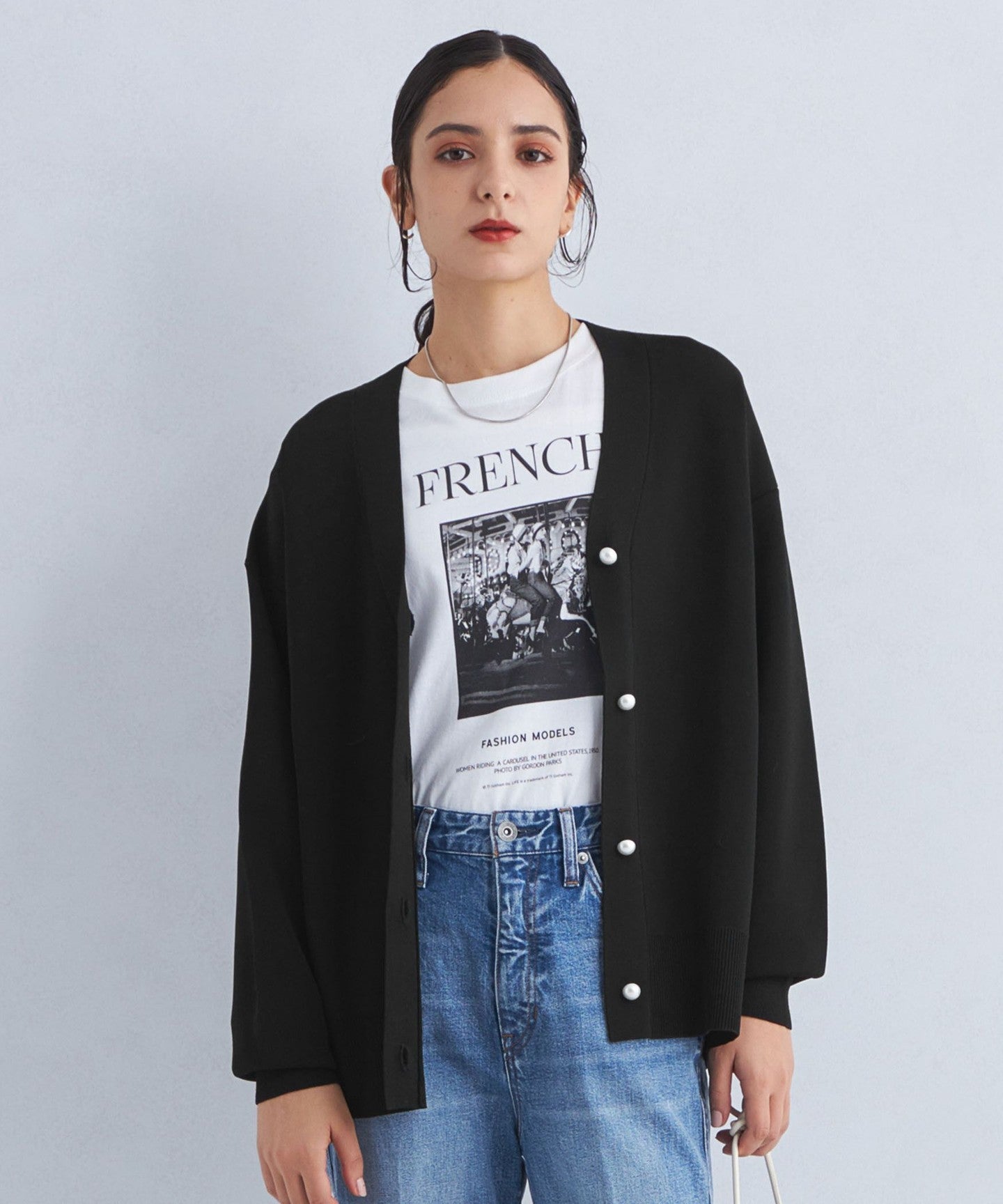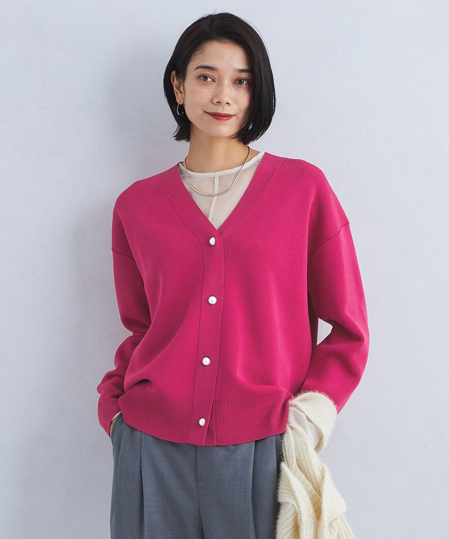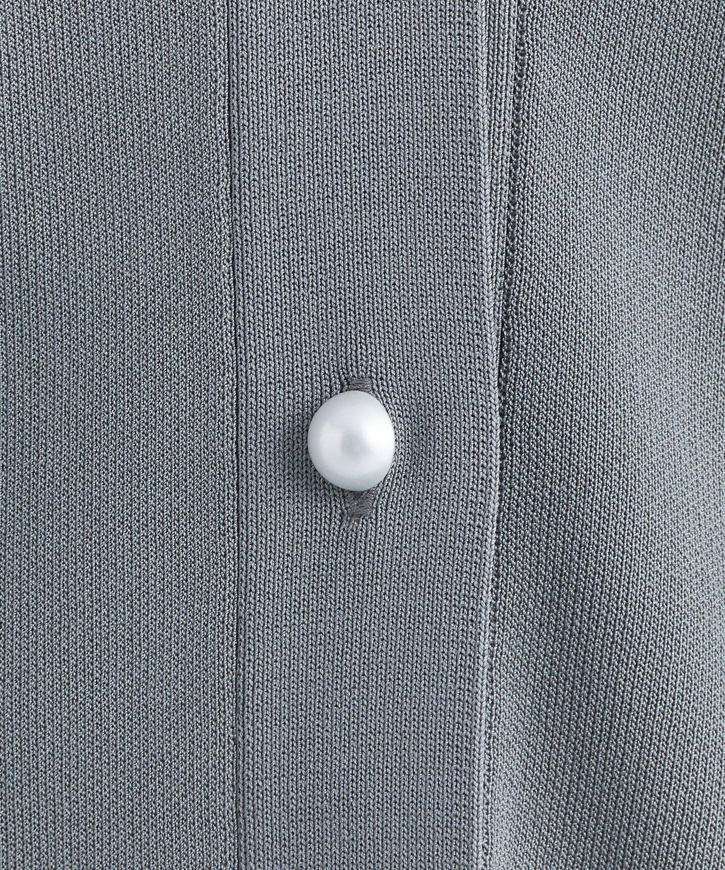 A cardigan with attractive pearl-like buttons that look like accessories.