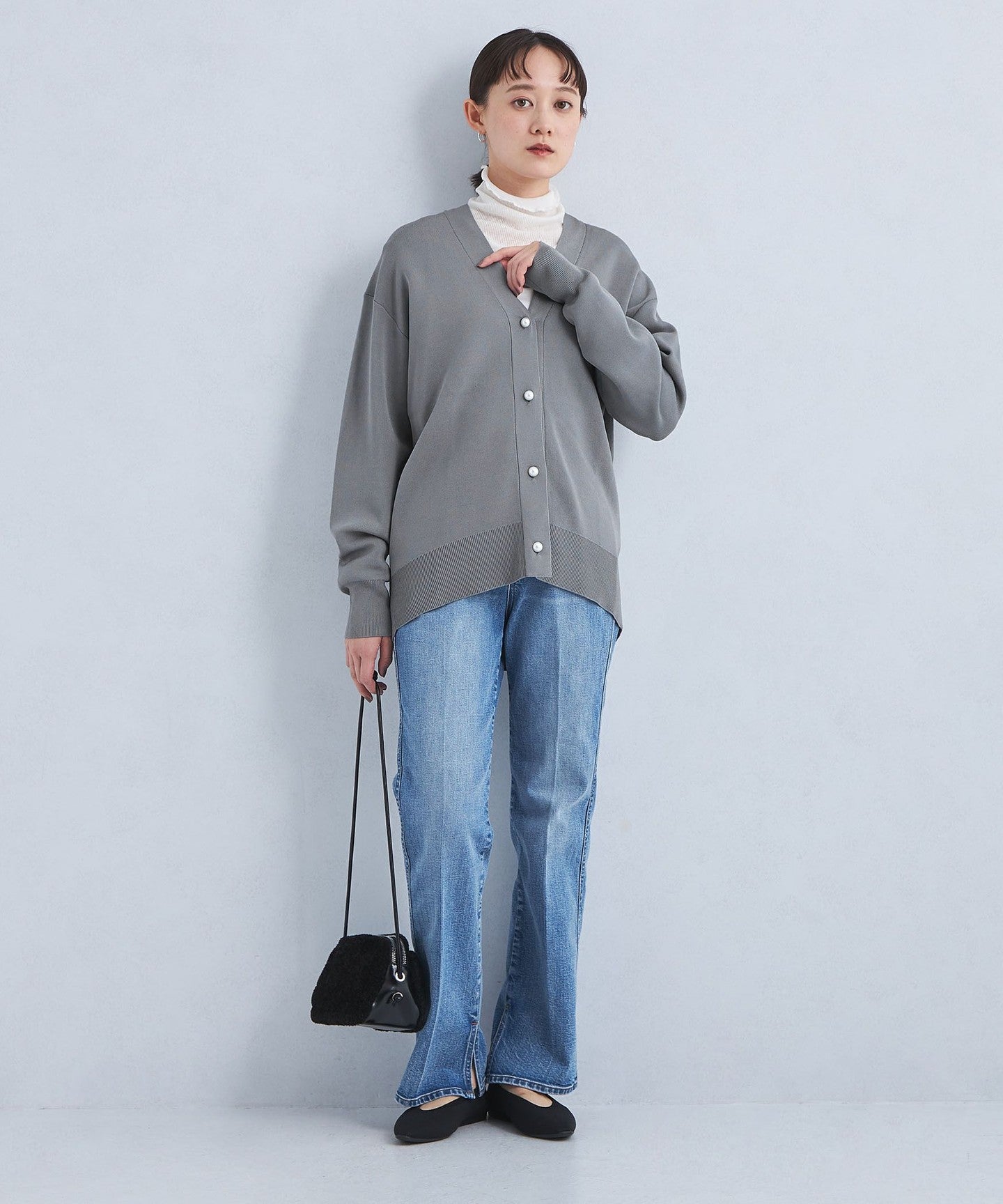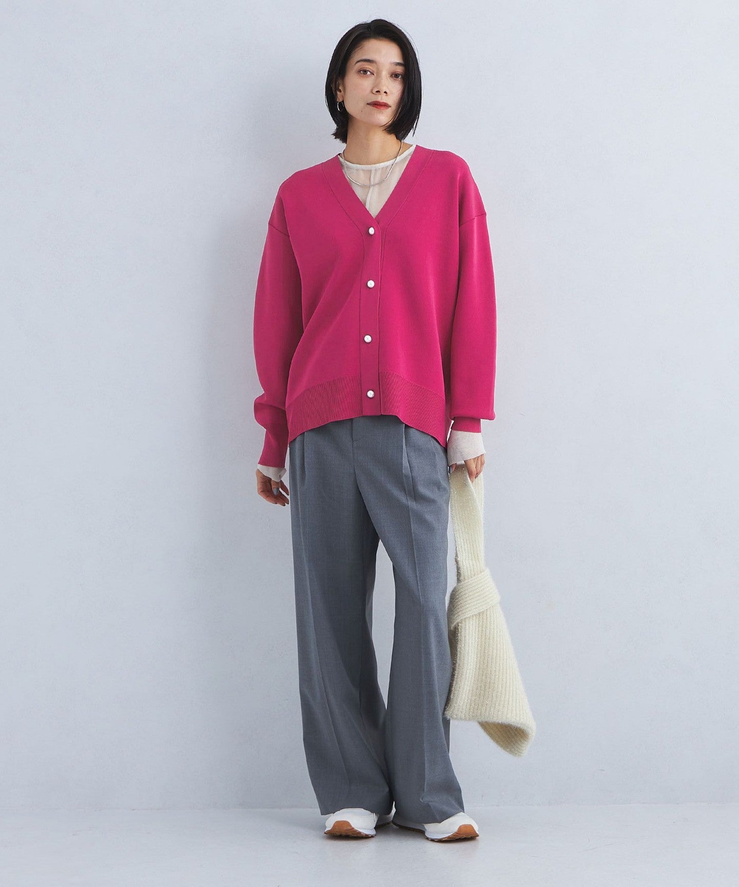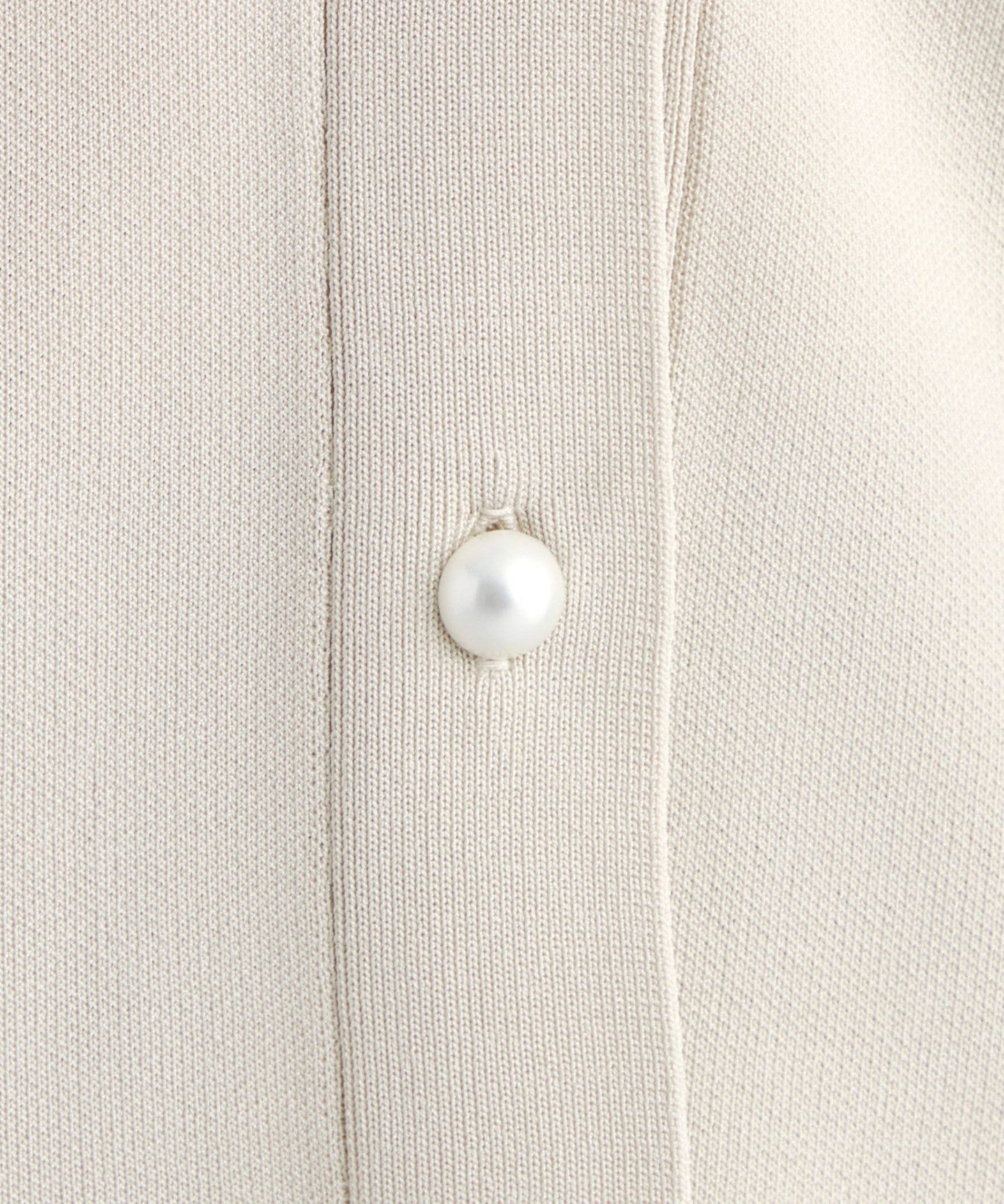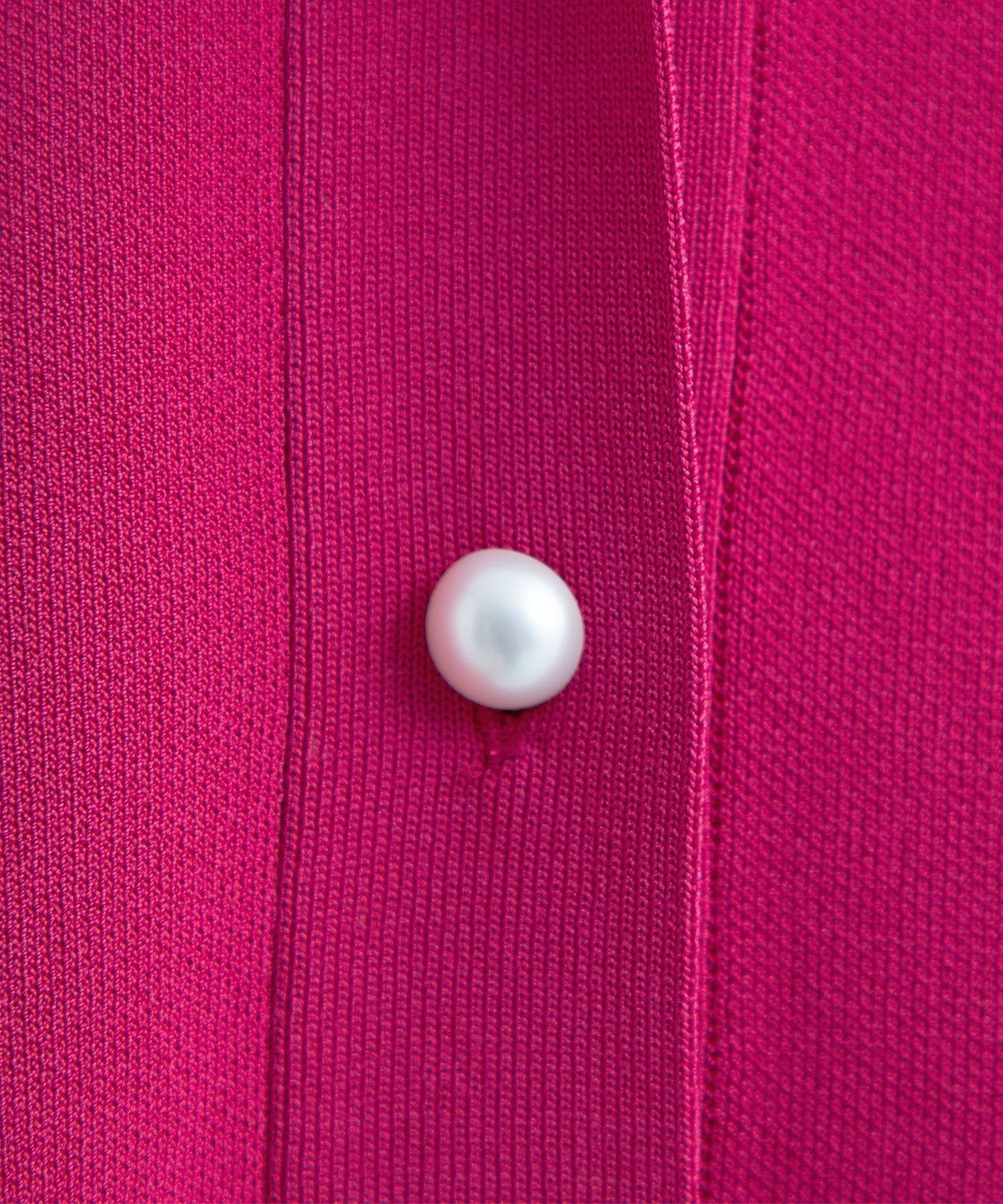 A cardigan with attractive pearl-like buttons that look like accessories.