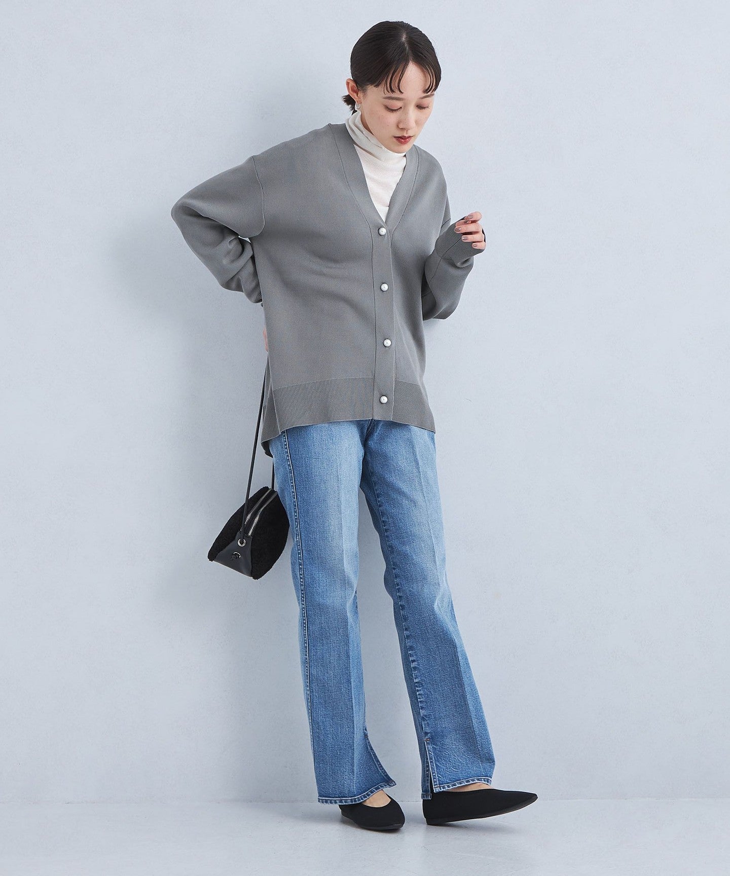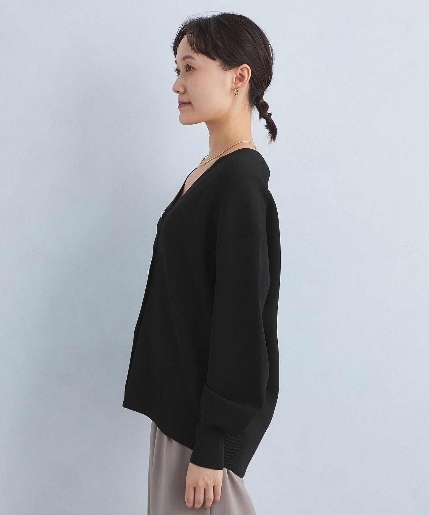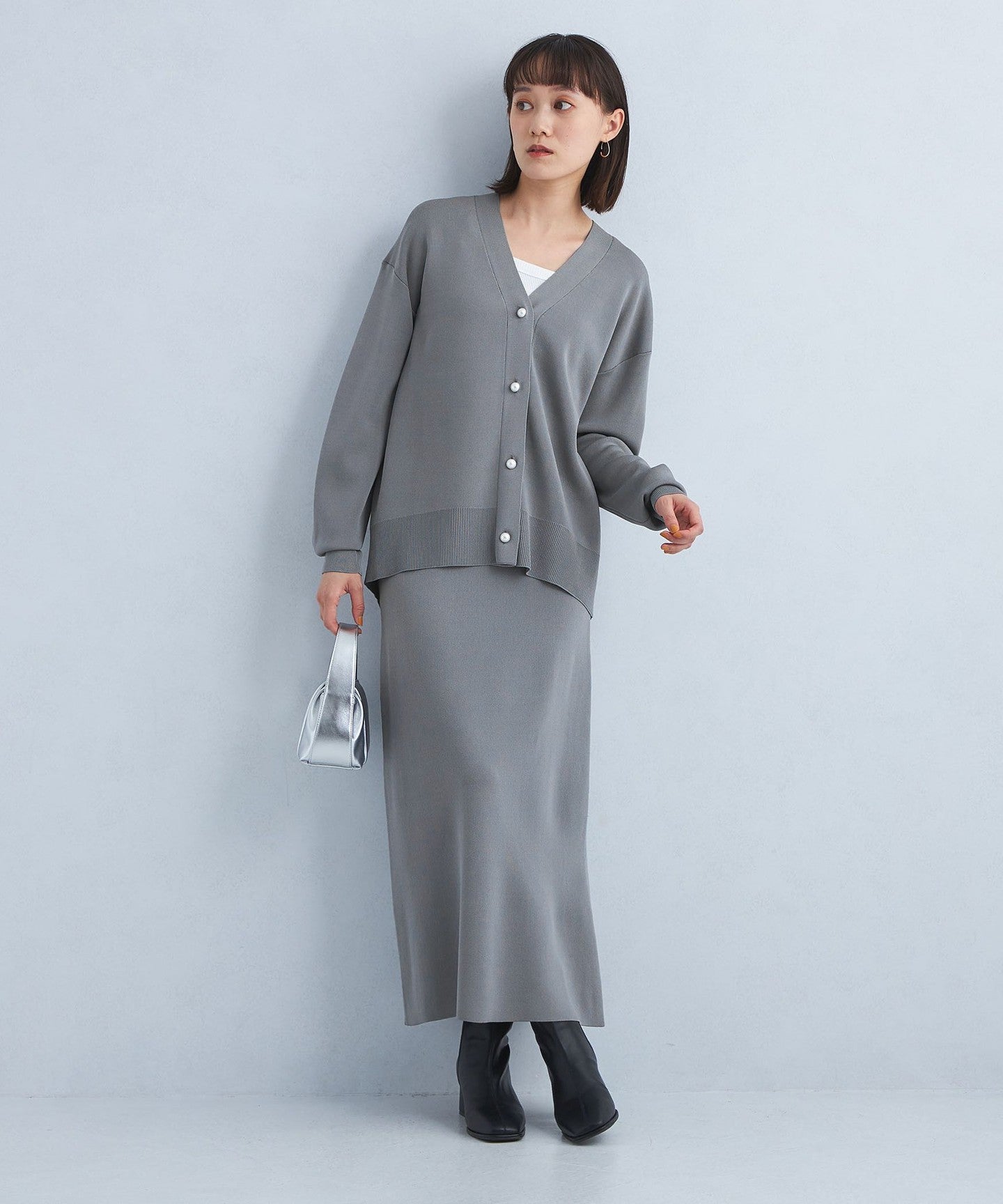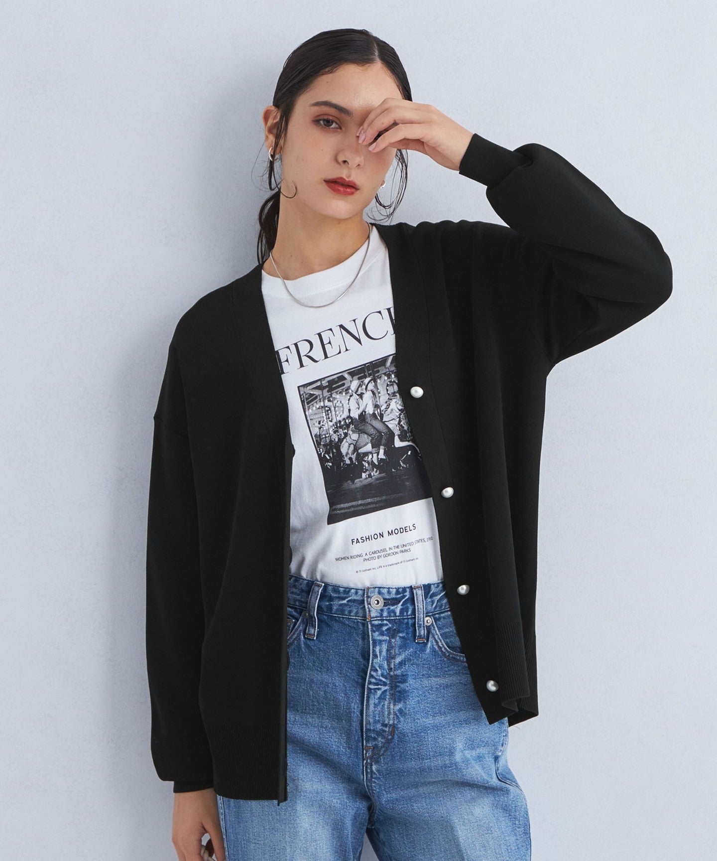 A cardigan with attractive pearl-like buttons that look like accessories.