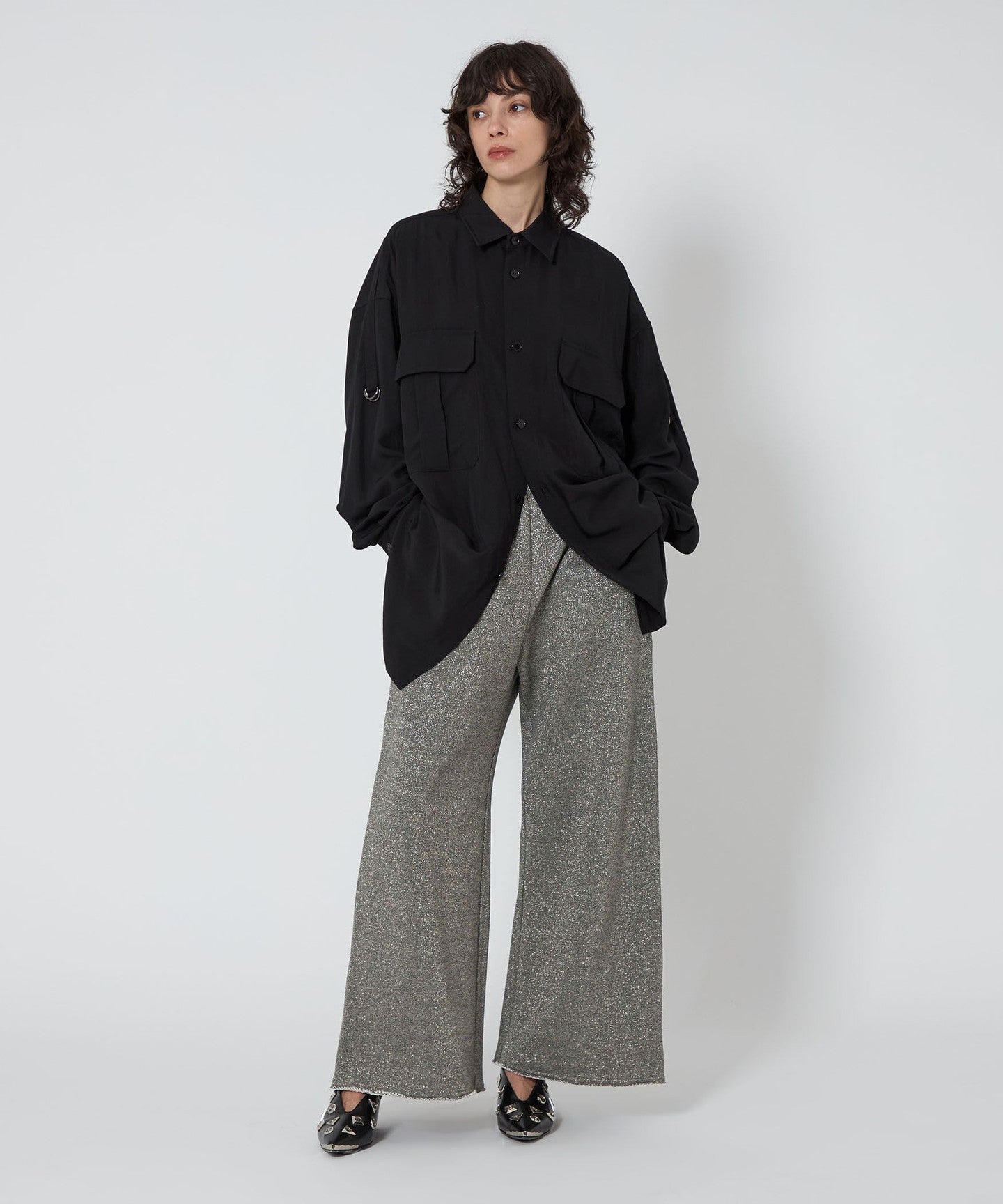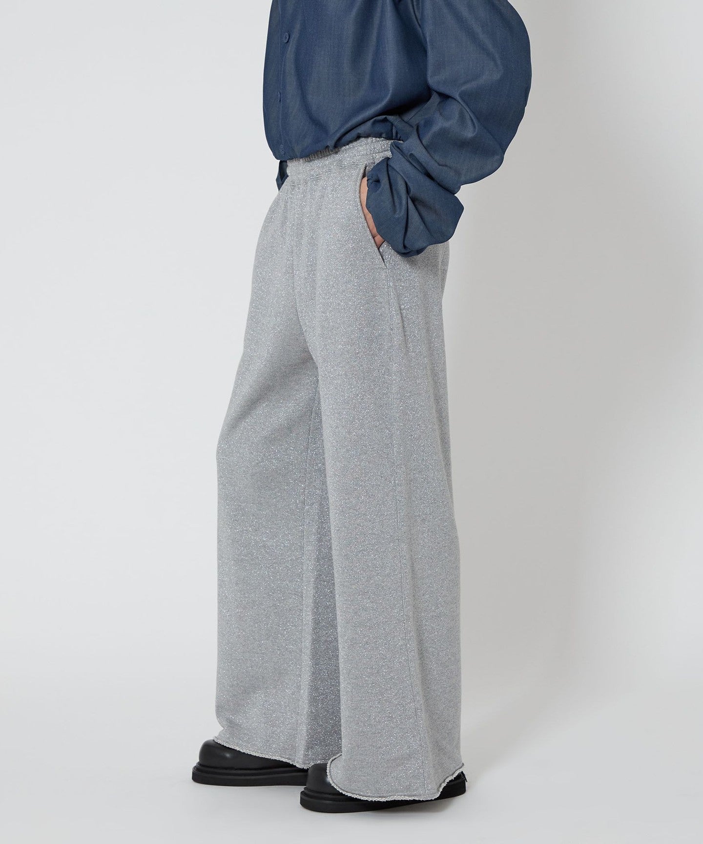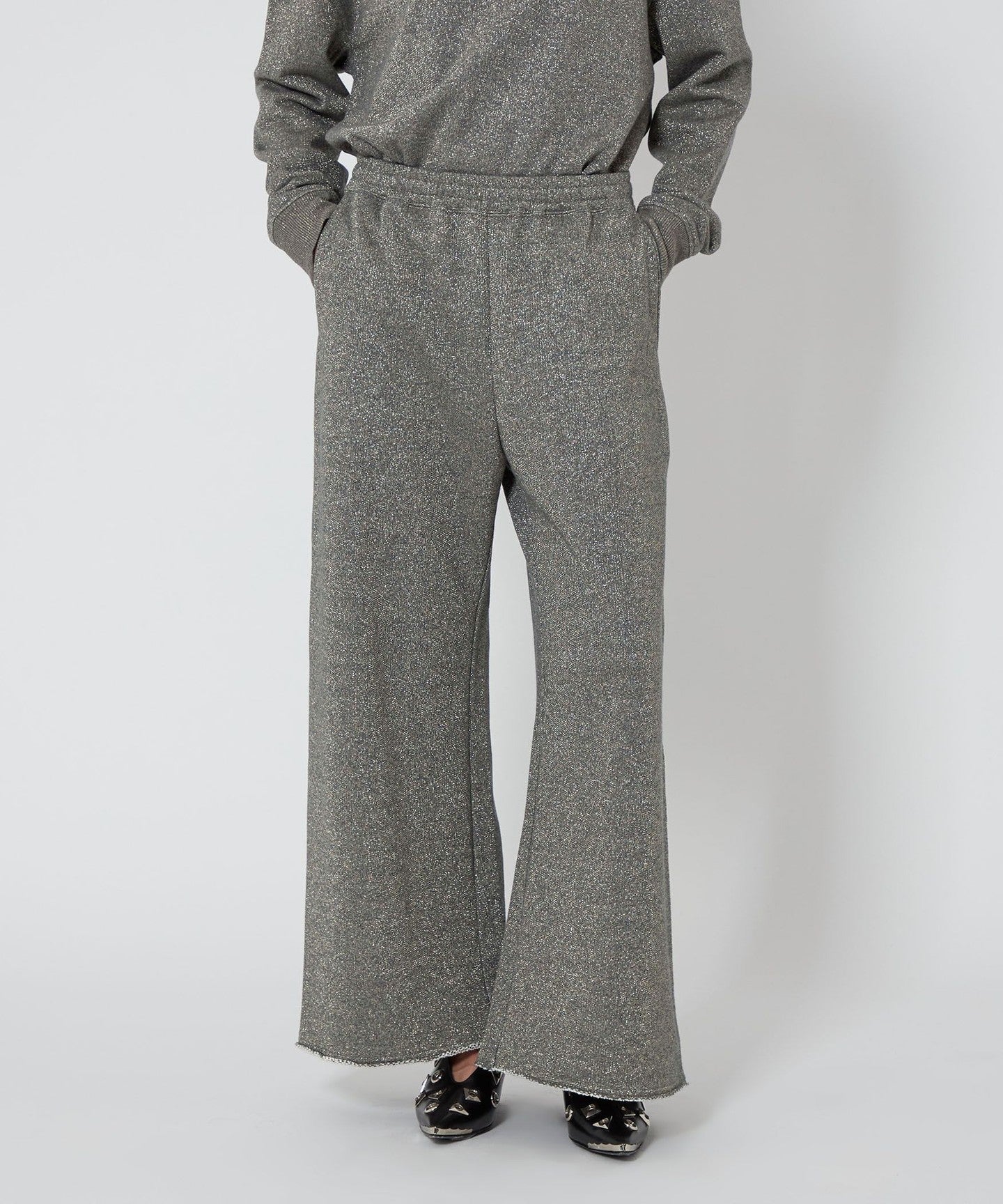 Wide silhouette lame sweatpants with raw hems.